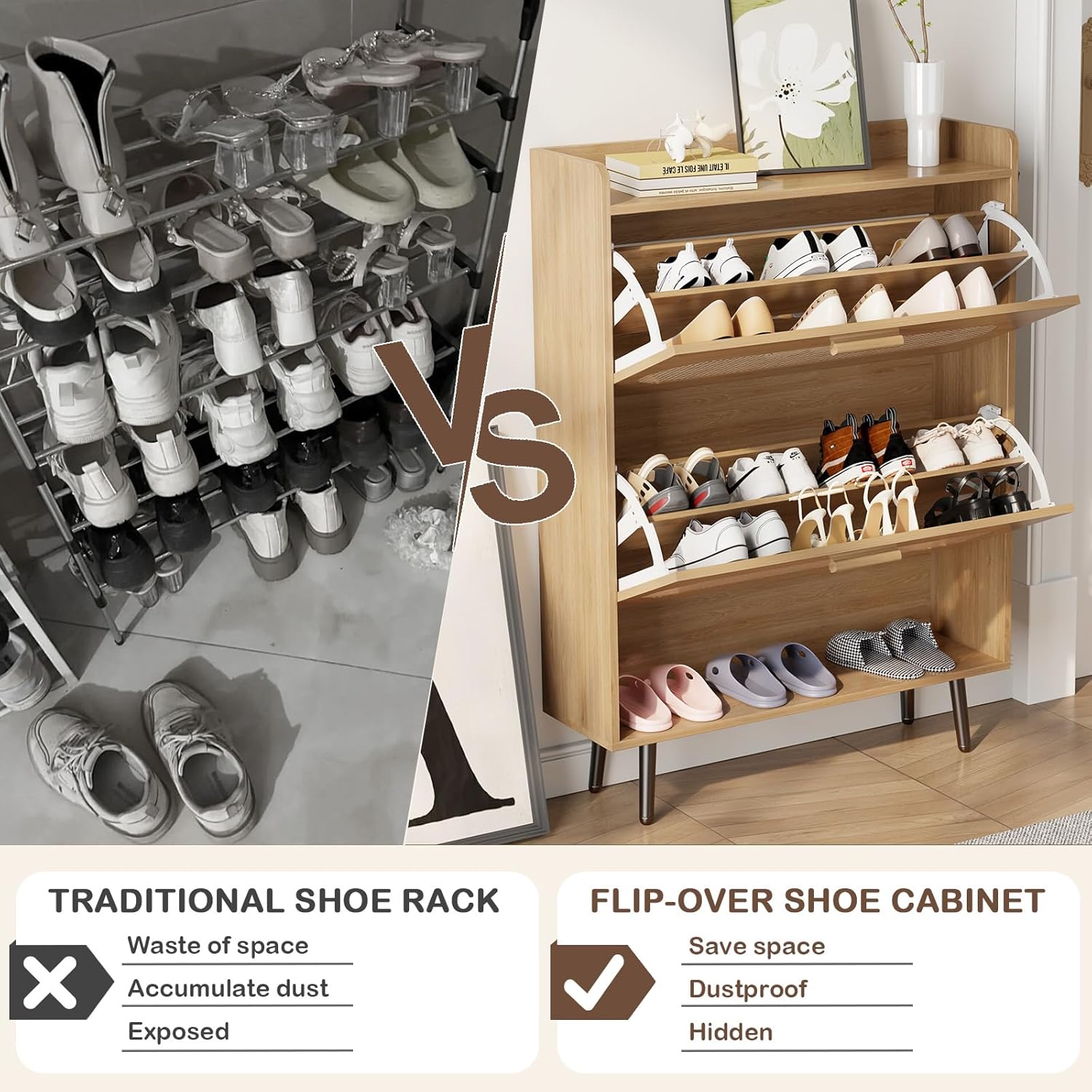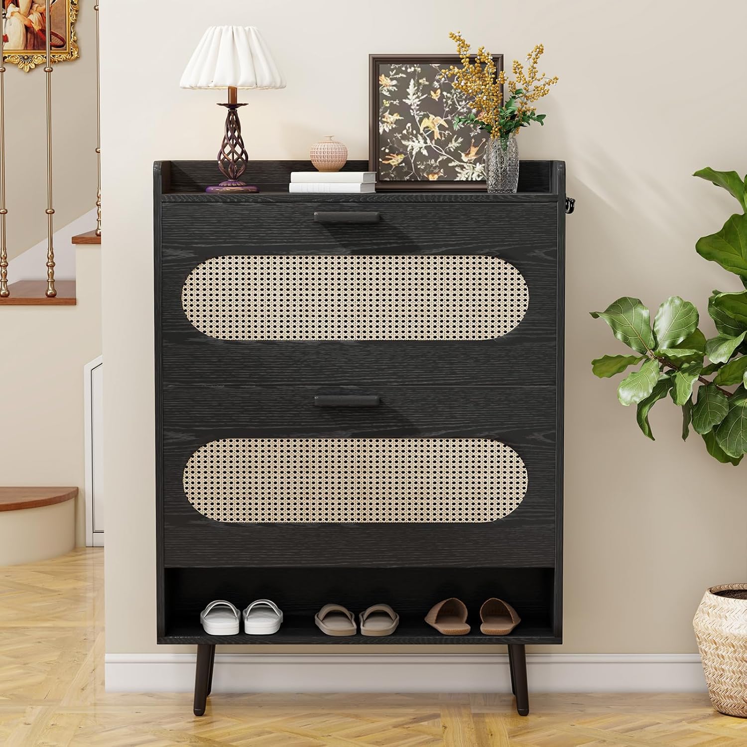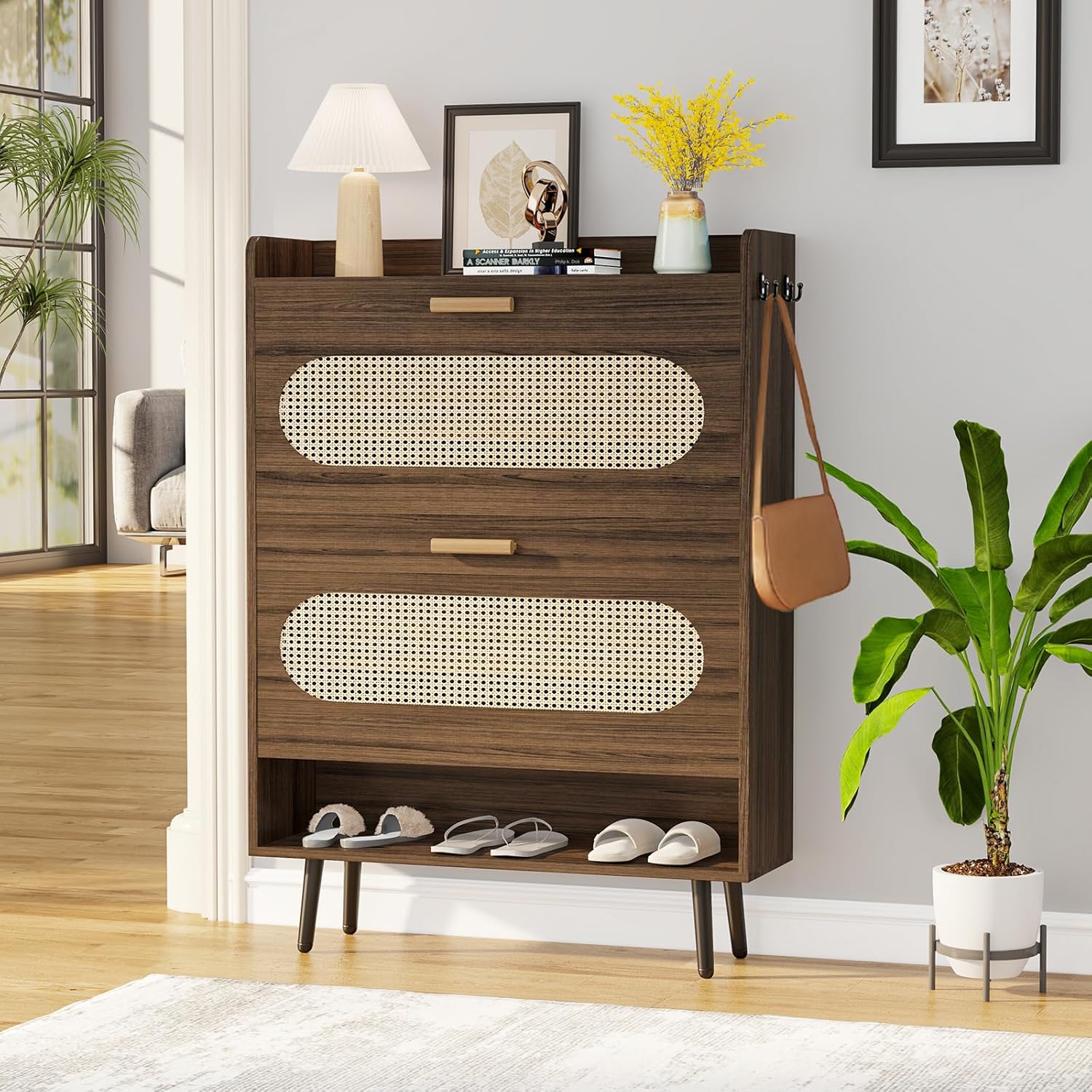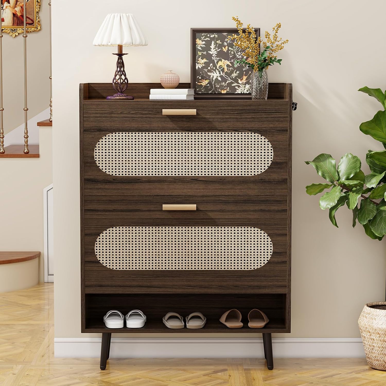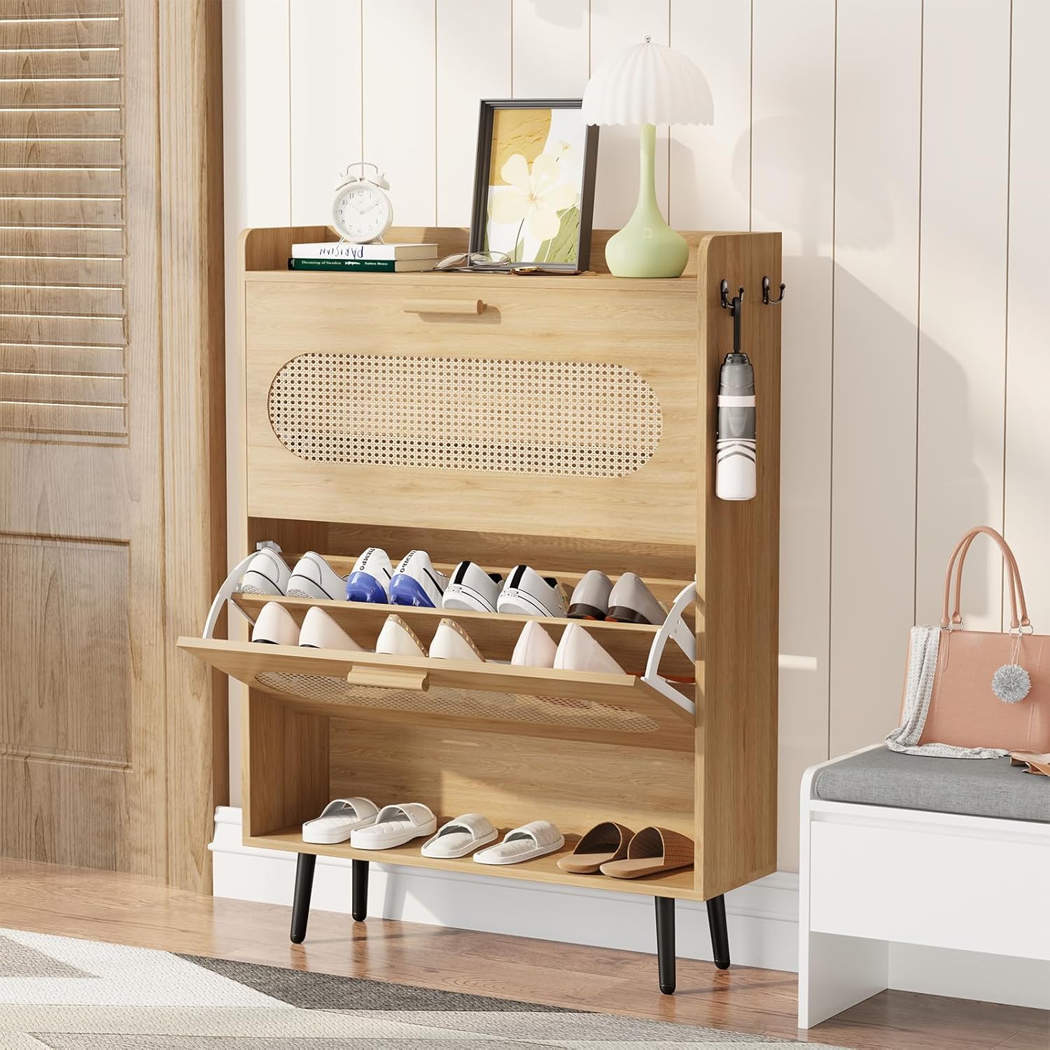 Rattan Shoe Cabinet with 2 Flip Drawers, Shoe Storage Cabinet for Entryway, Narrow Shoe Rack Cabinet, Freestanding Hidden Shoe Organizer for Hallway, Living Room (Oak)