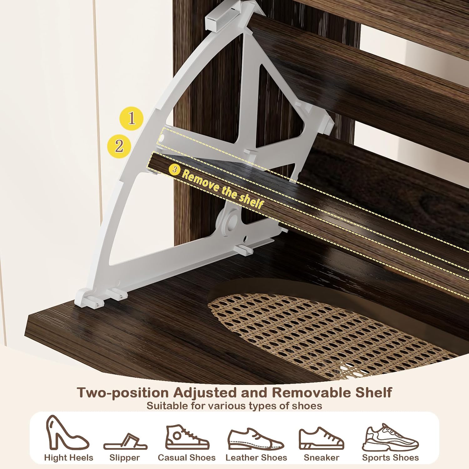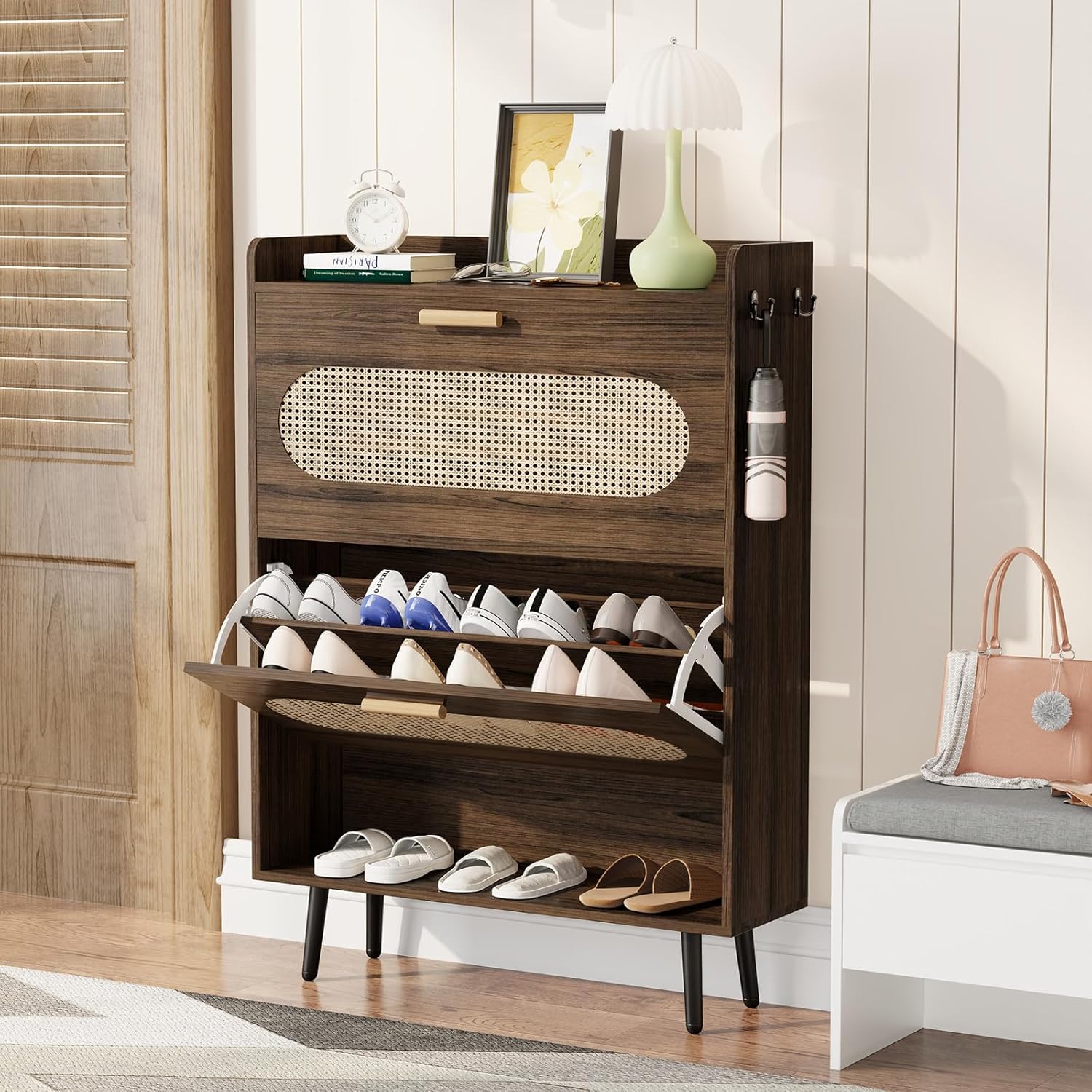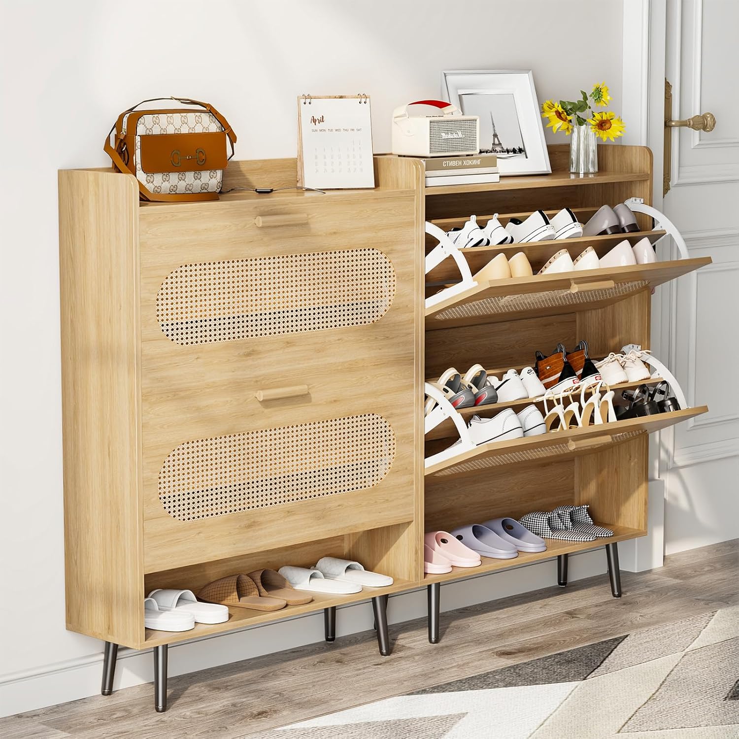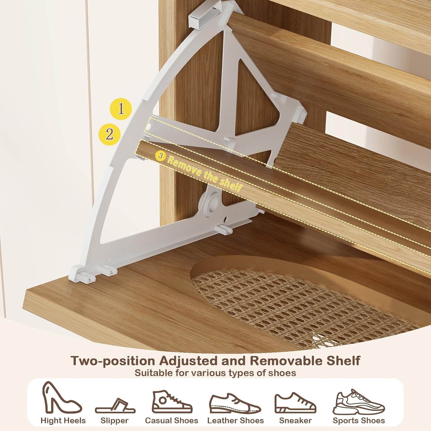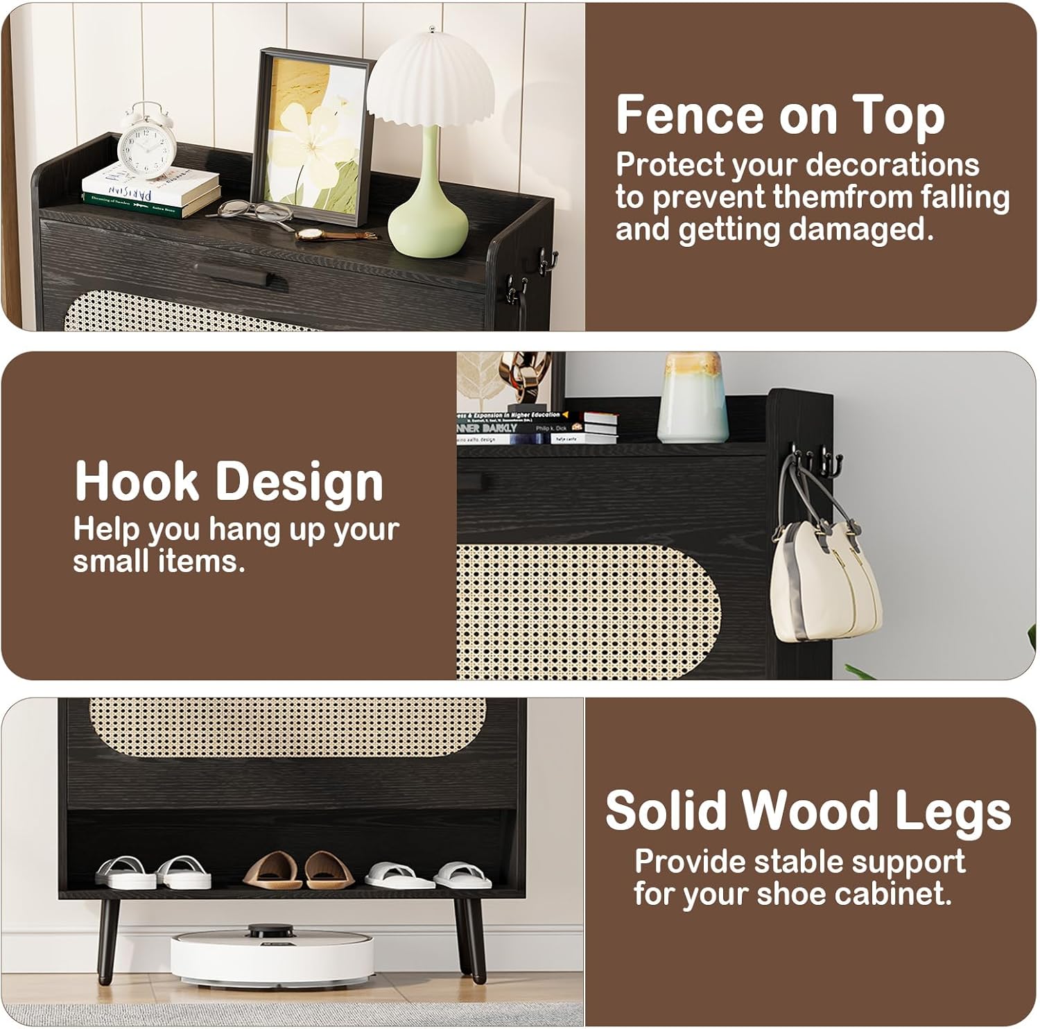 Rattan Shoe Cabinet with 2 Flip Drawers, Shoe Storage Cabinet for Entryway, Narrow Shoe Rack Cabinet, Freestanding Hidden Shoe Organizer for Hallway, Living Room (Oak)