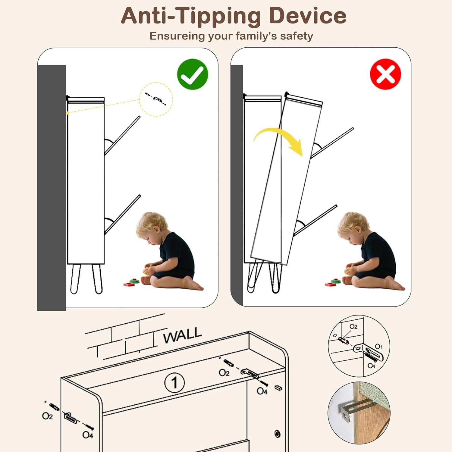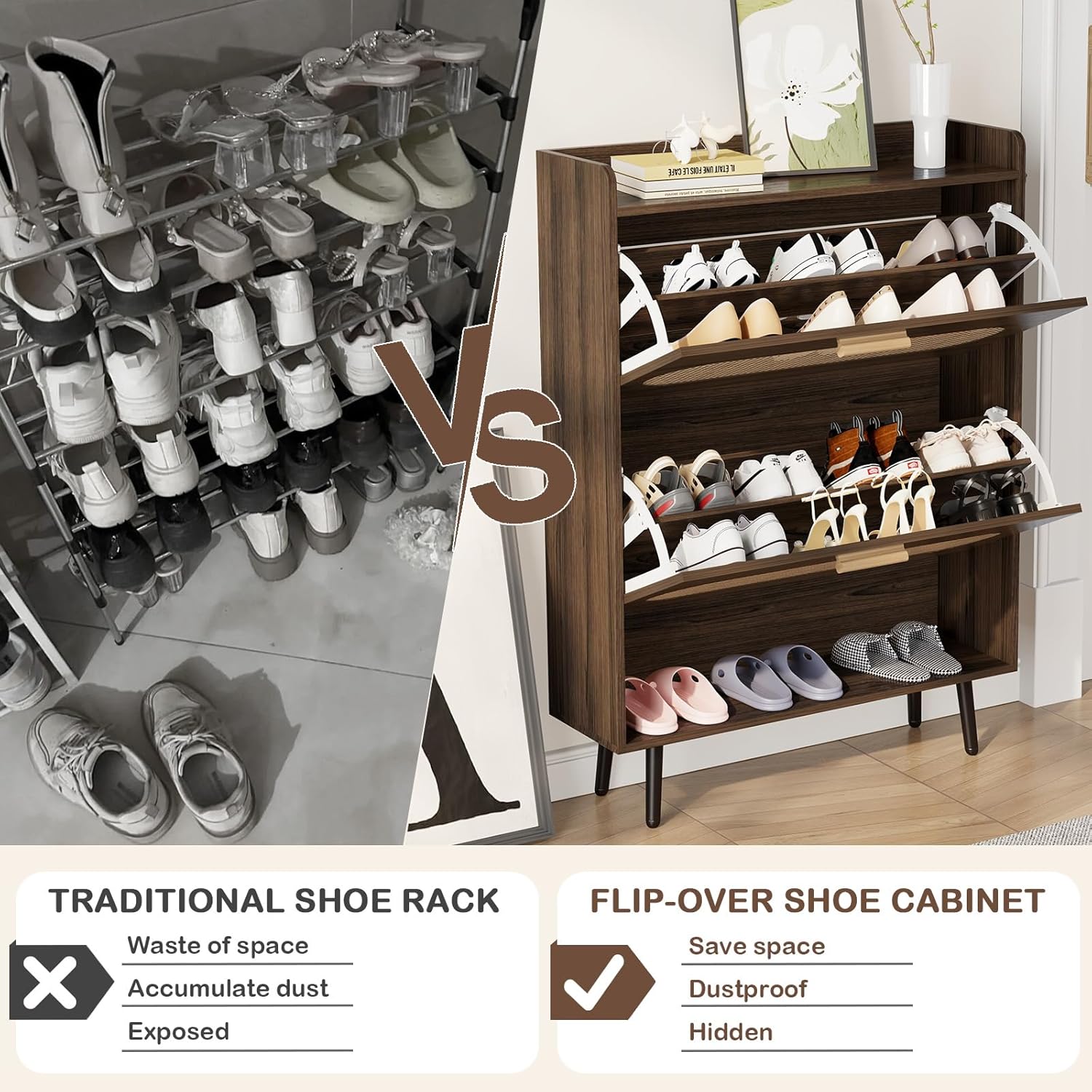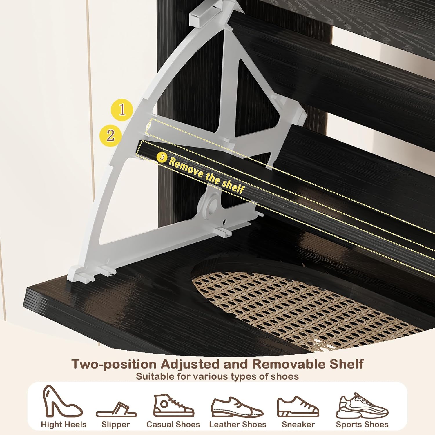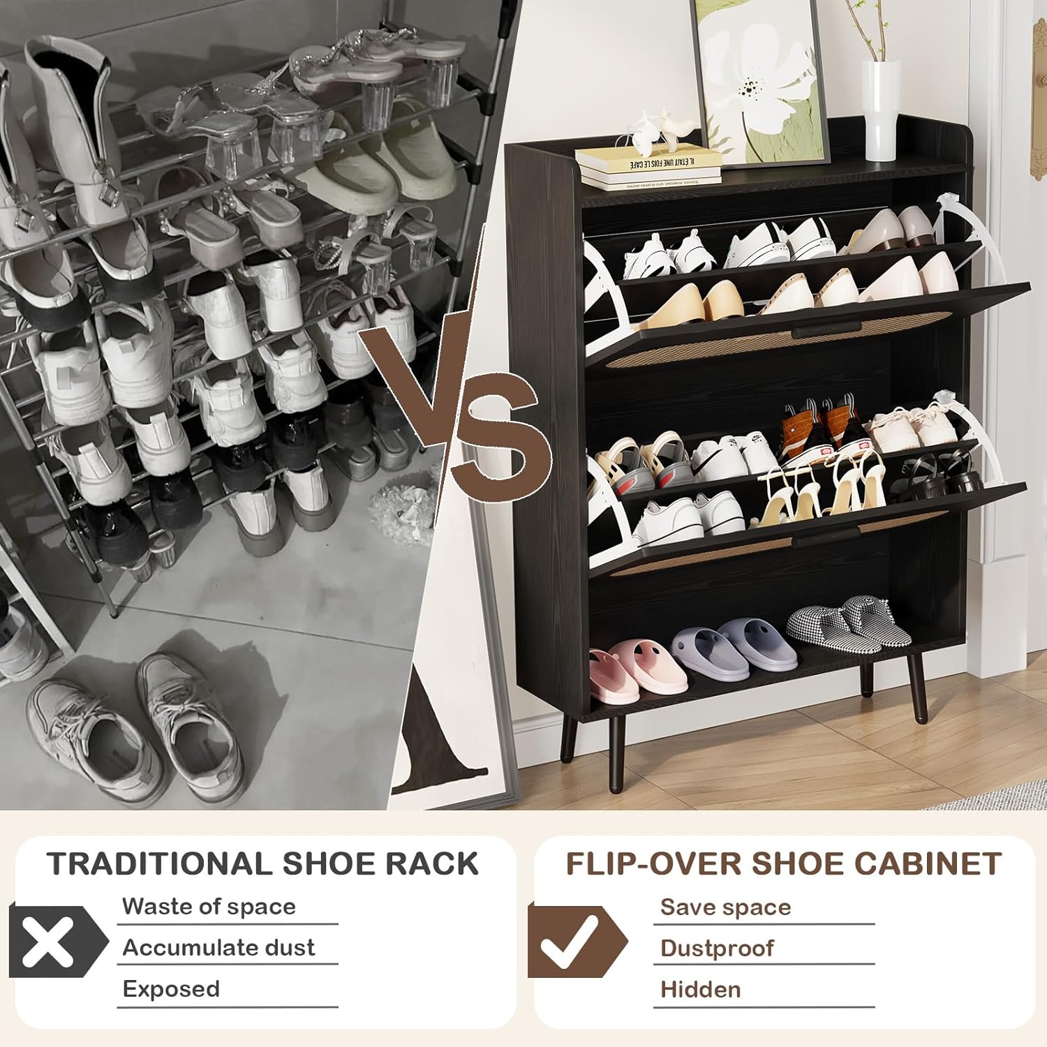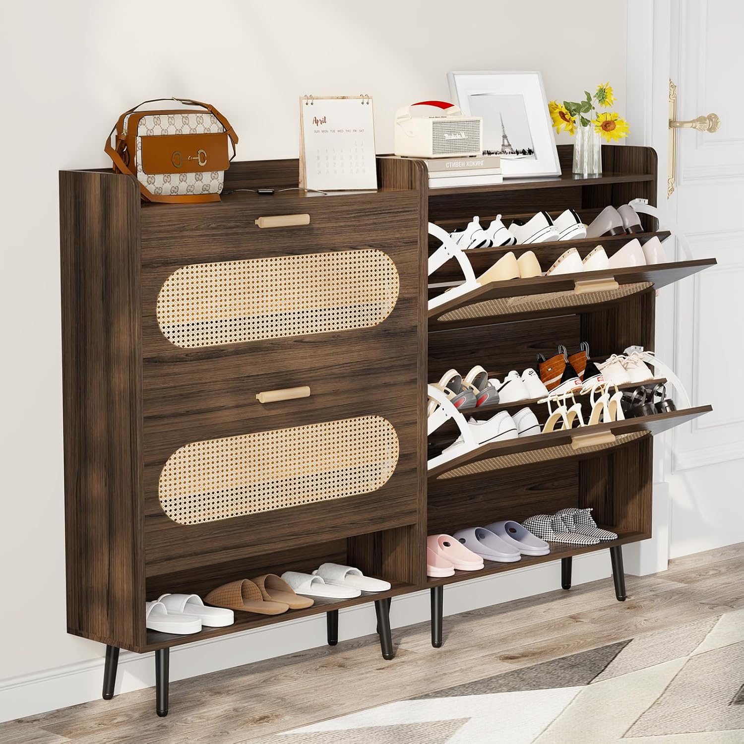 Rattan Shoe Cabinet with 2 Flip Drawers, Shoe Storage Cabinet for Entryway, Narrow Shoe Rack Cabinet, Freestanding Hidden Shoe Organizer for Hallway, Living Room (Oak)