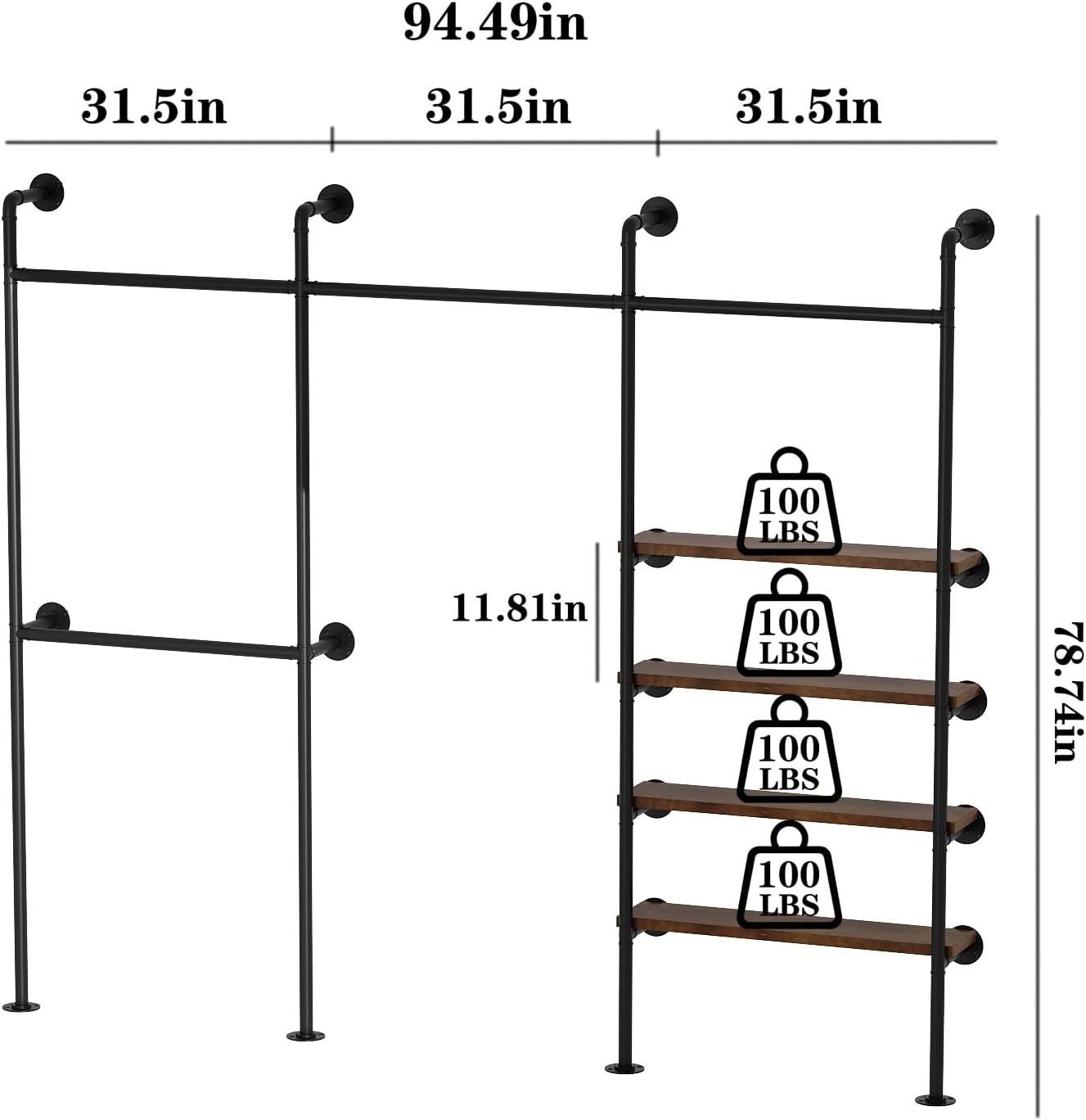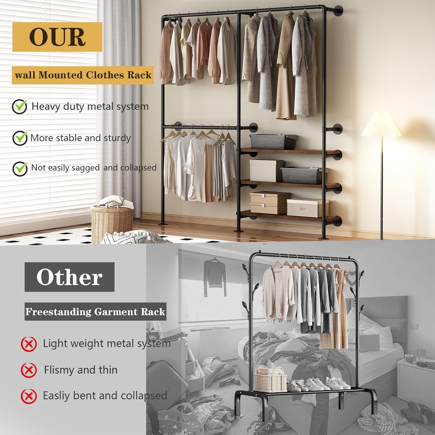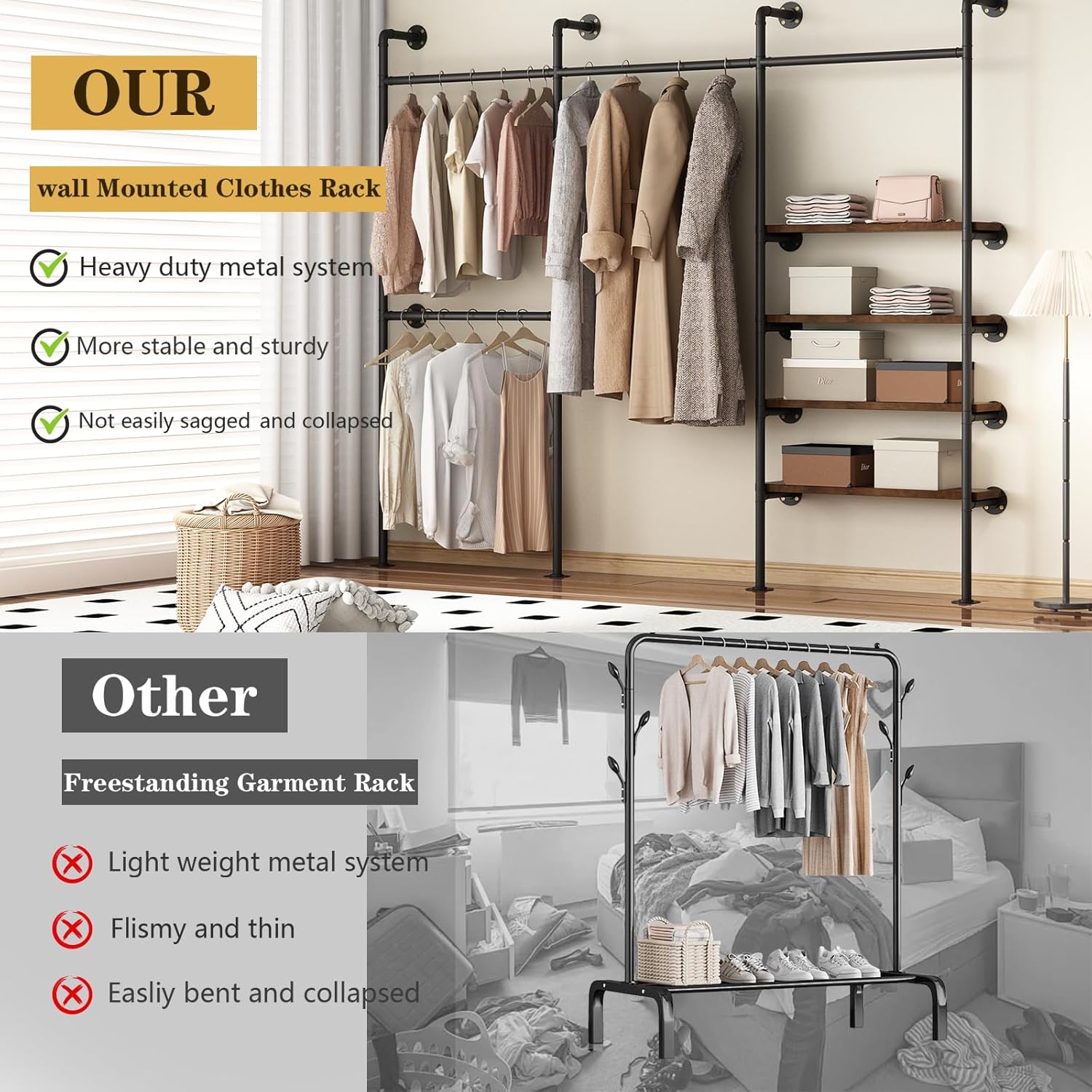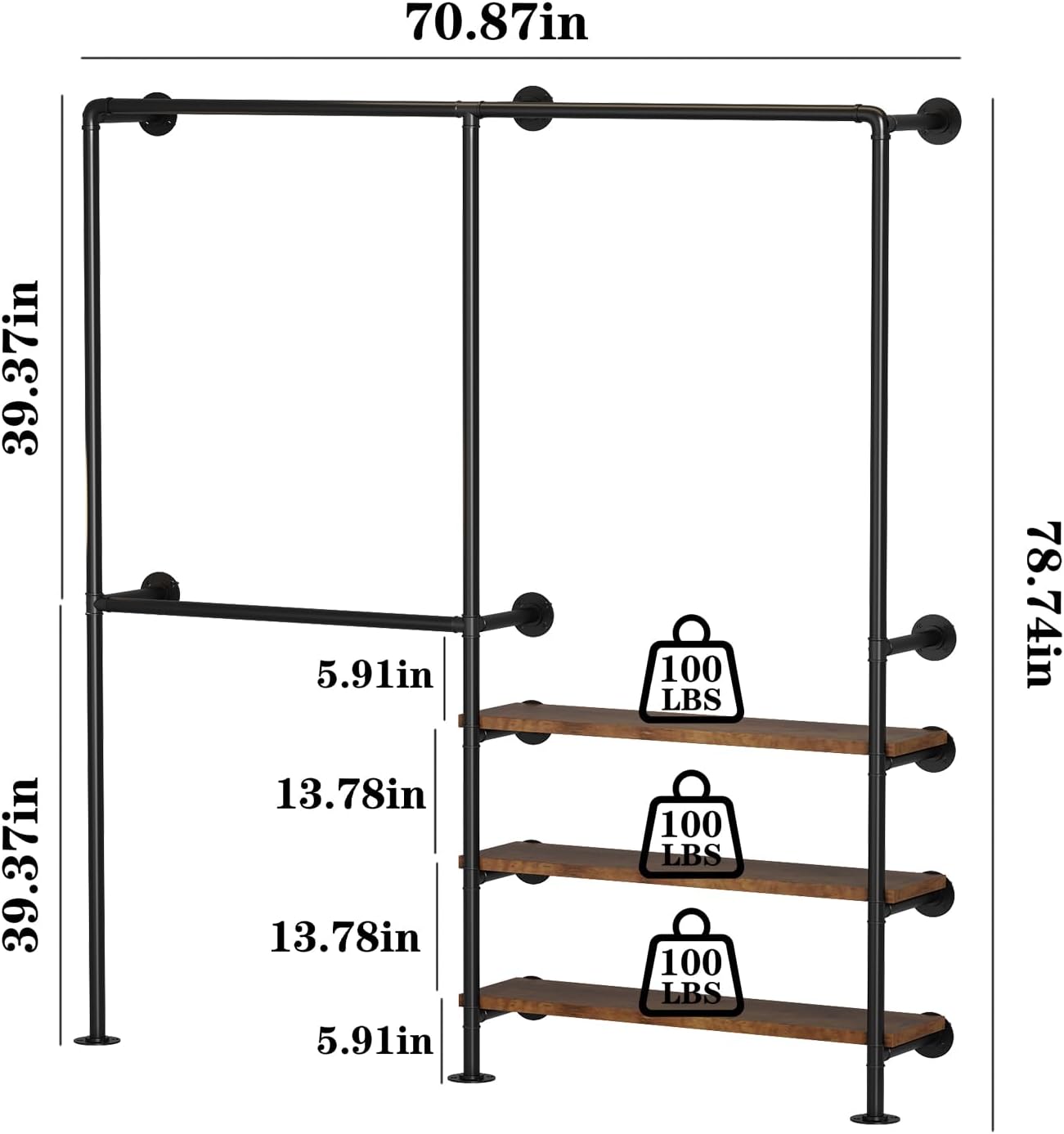 Industrial Pipe Clothing Rack with Shelves, 71inch Wall Mounted Closet Storage Racks,Hanging Clothes Retail Display Rack, Garment Racks with Shelves Closet Rods System