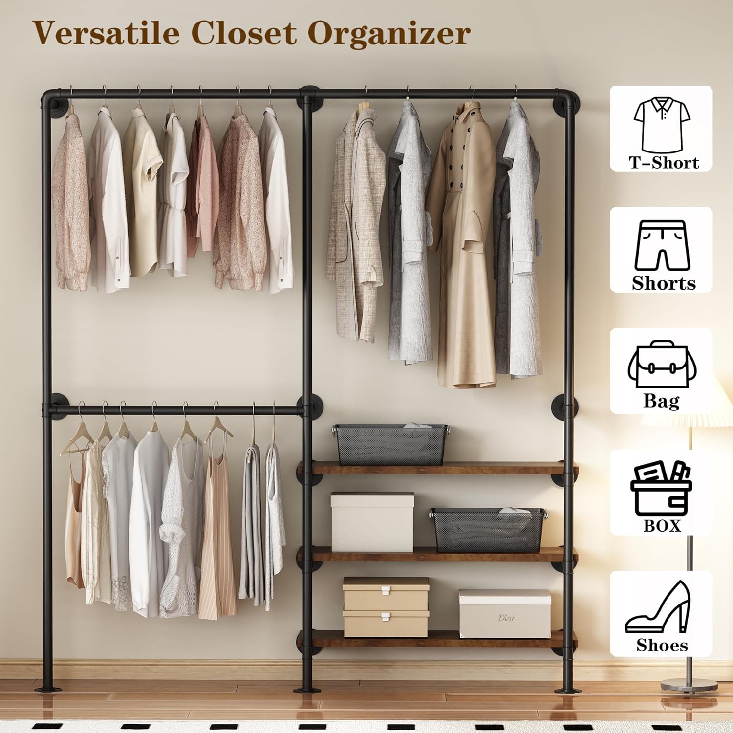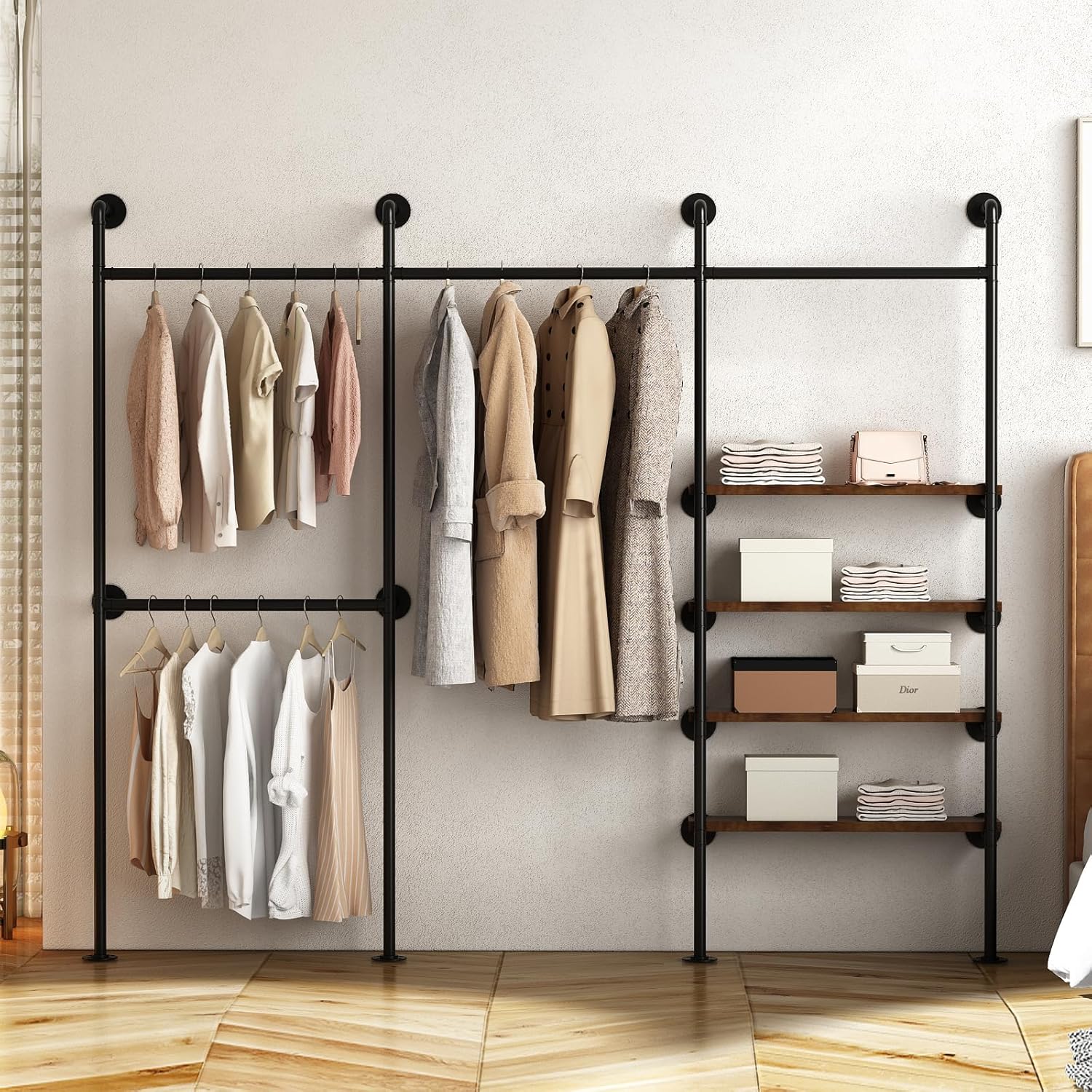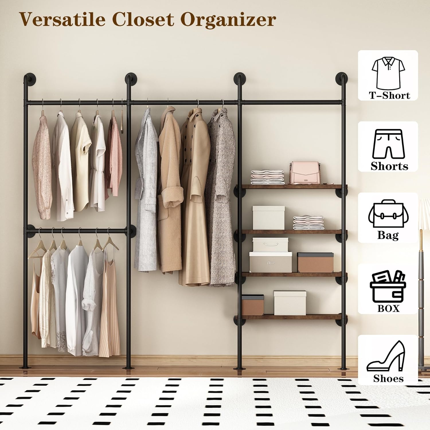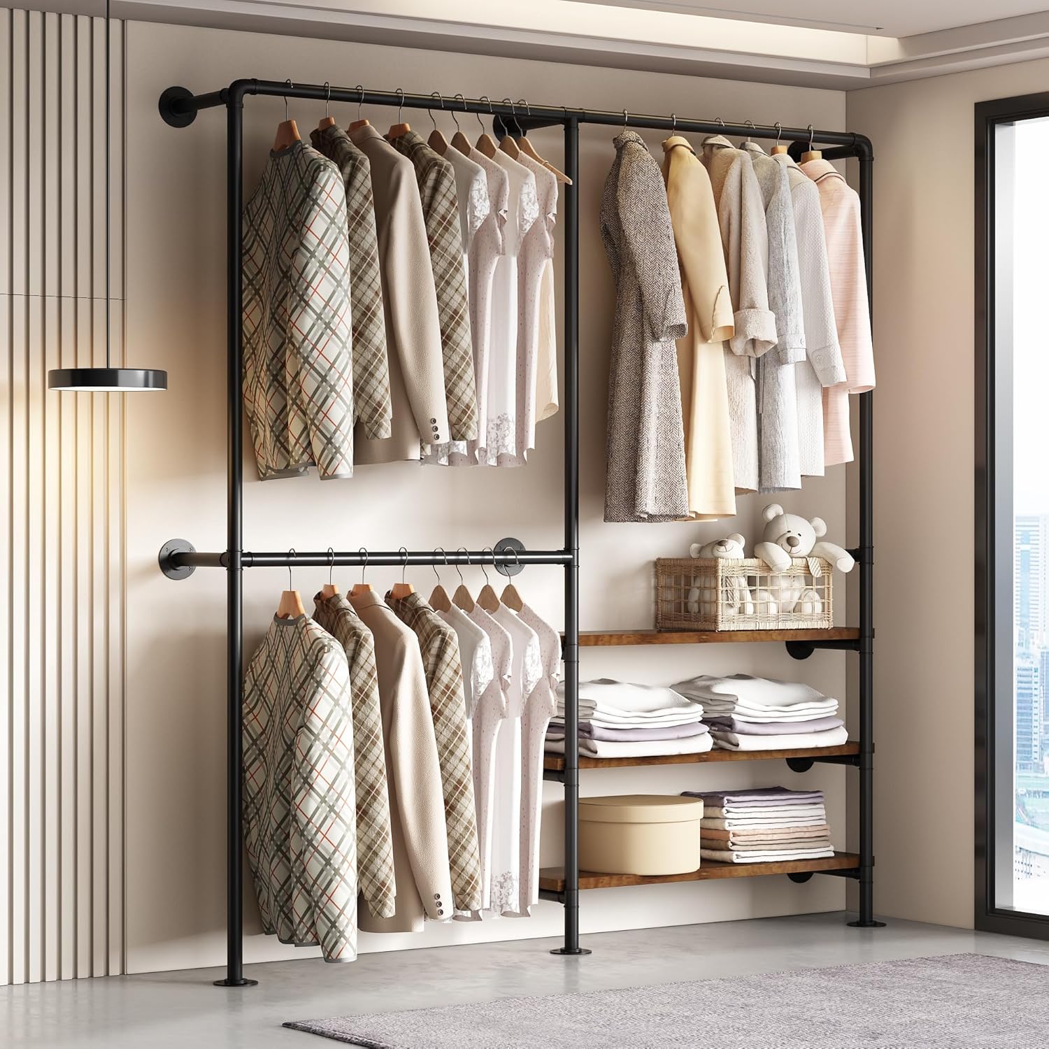 Industrial Pipe Clothing Rack with Shelves, 71inch Wall Mounted Closet Storage Racks,Hanging Clothes Retail Display Rack, Garment Racks with Shelves Closet Rods System