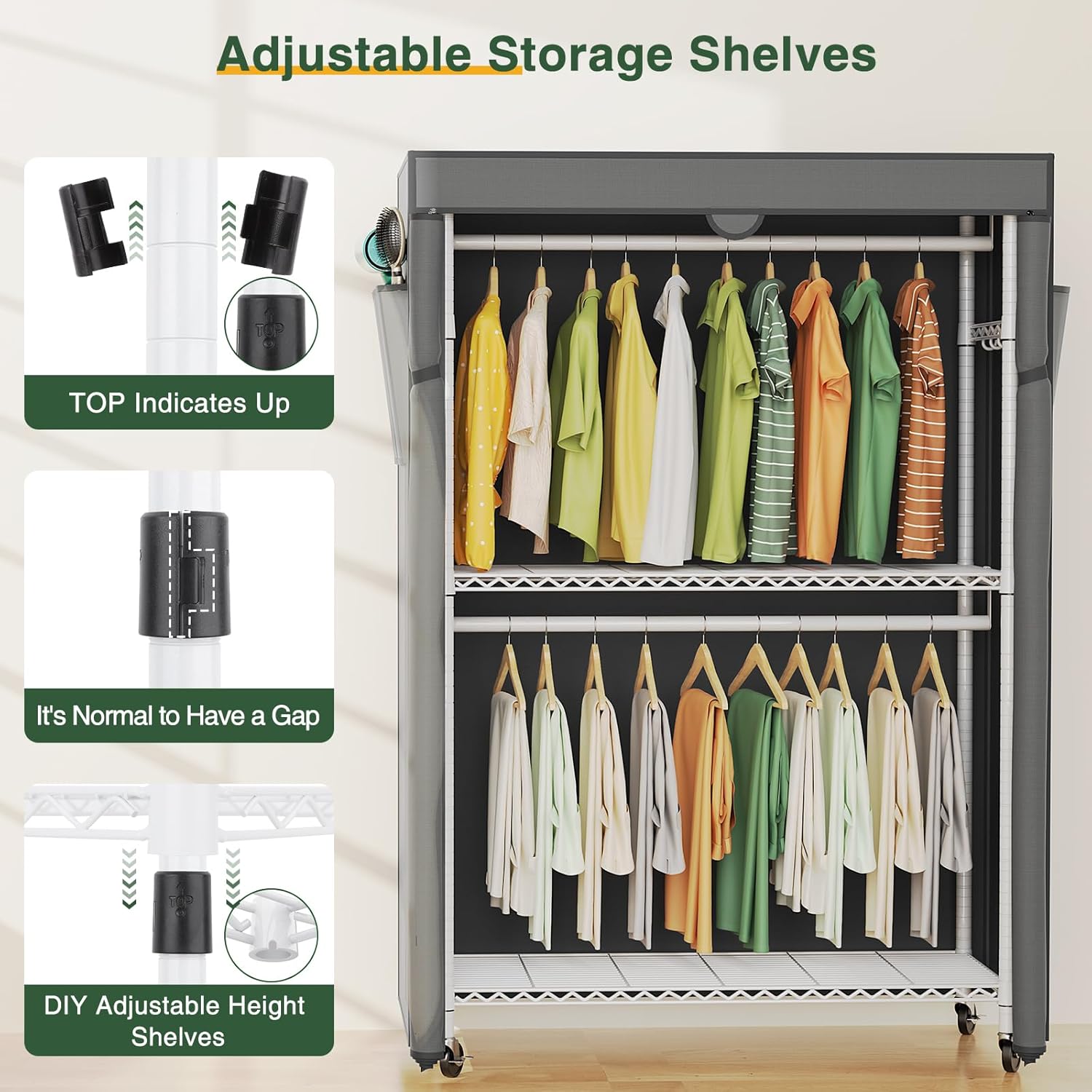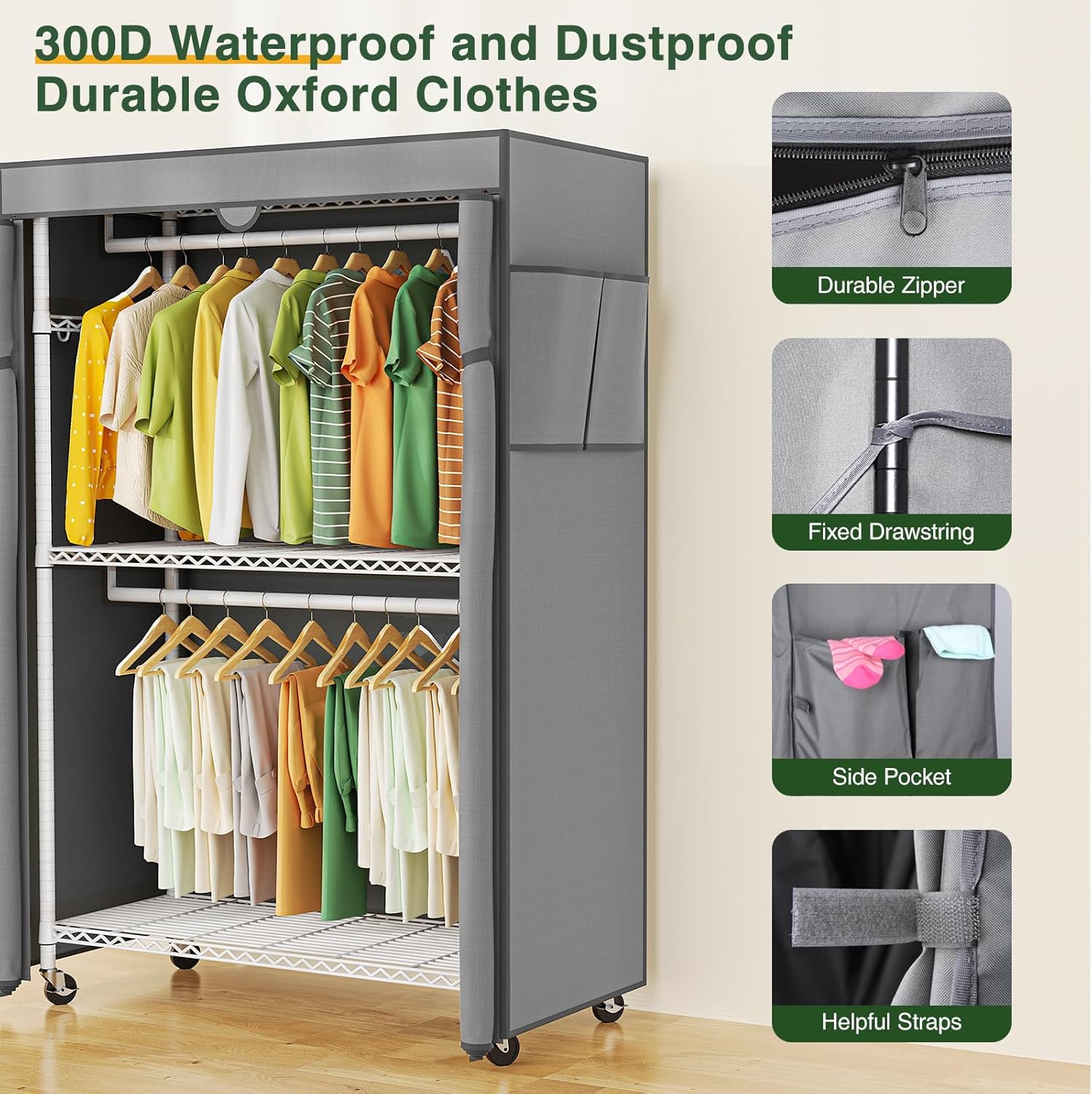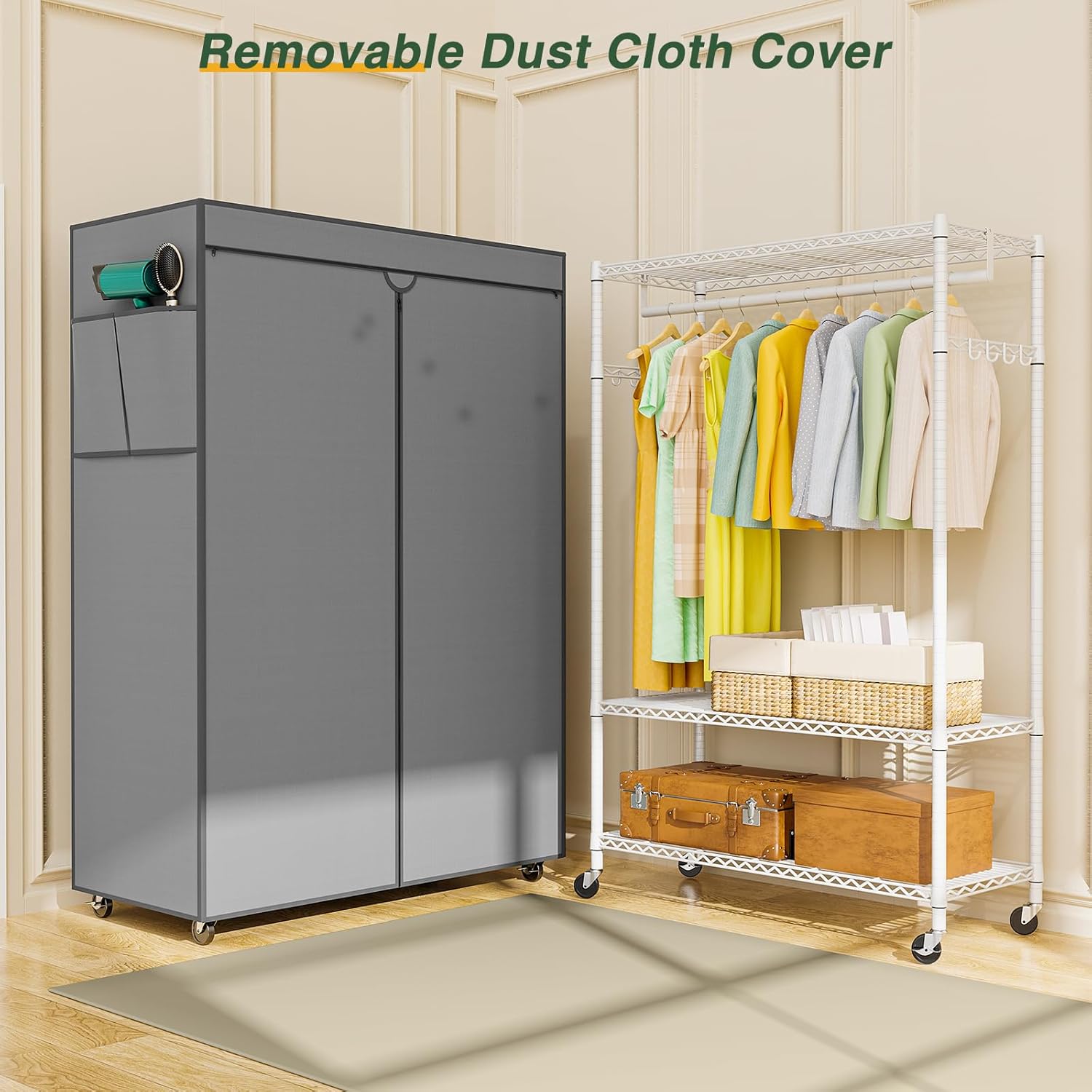 LEHOM G1C Heavy Duty Clothes Rack with Cover, Rolling Garment Rack for Hanging Clothes, Portable Closets with Oxford Fabric Cover, Freestanding Clothing Rack on Wheels (White+gray Cover, G1C)