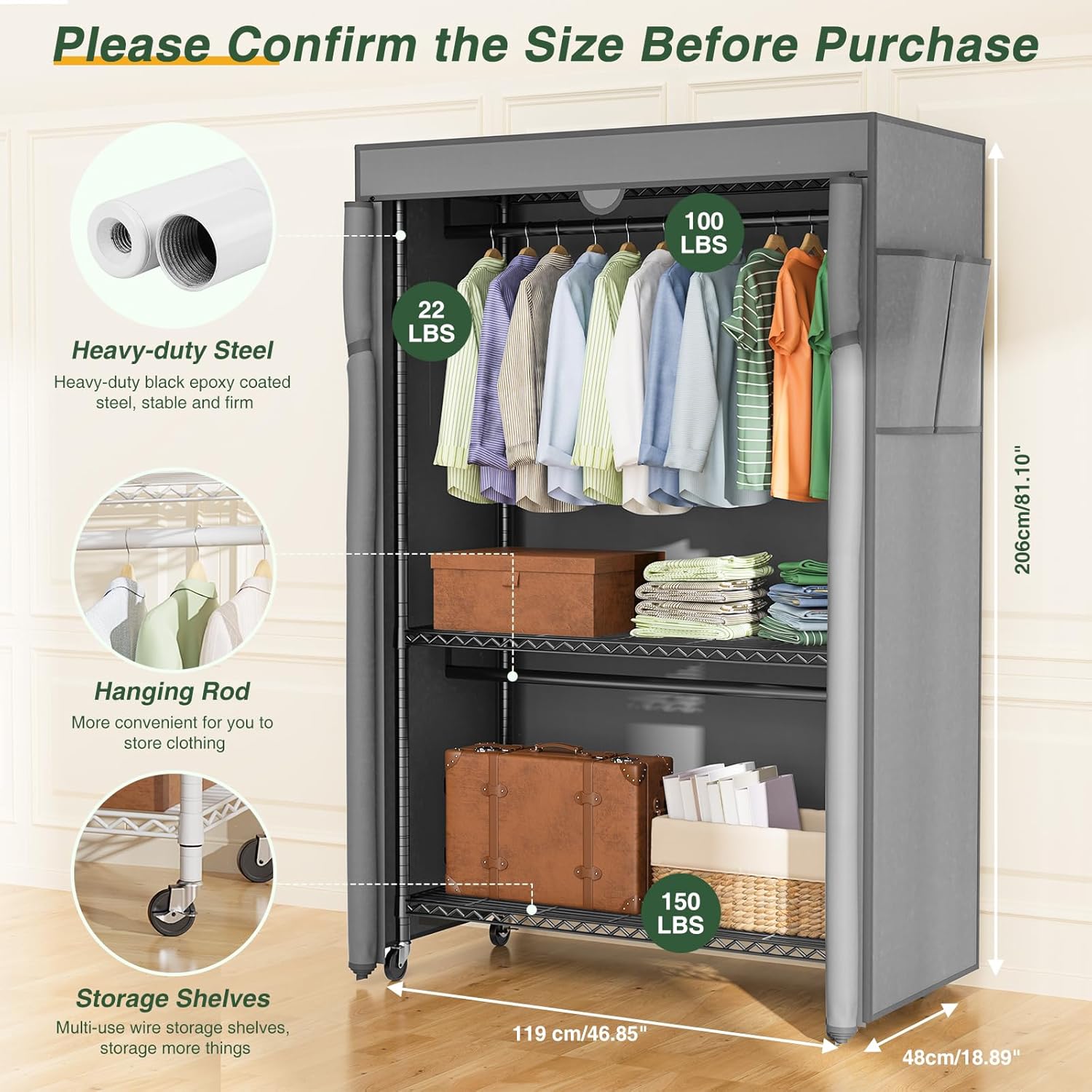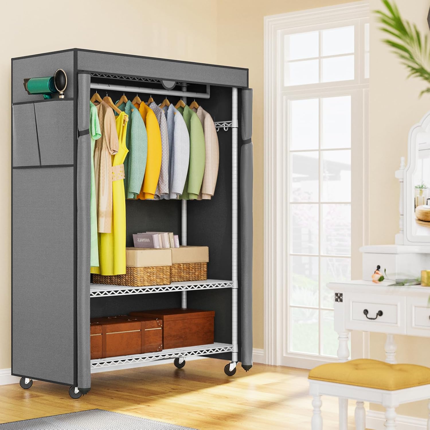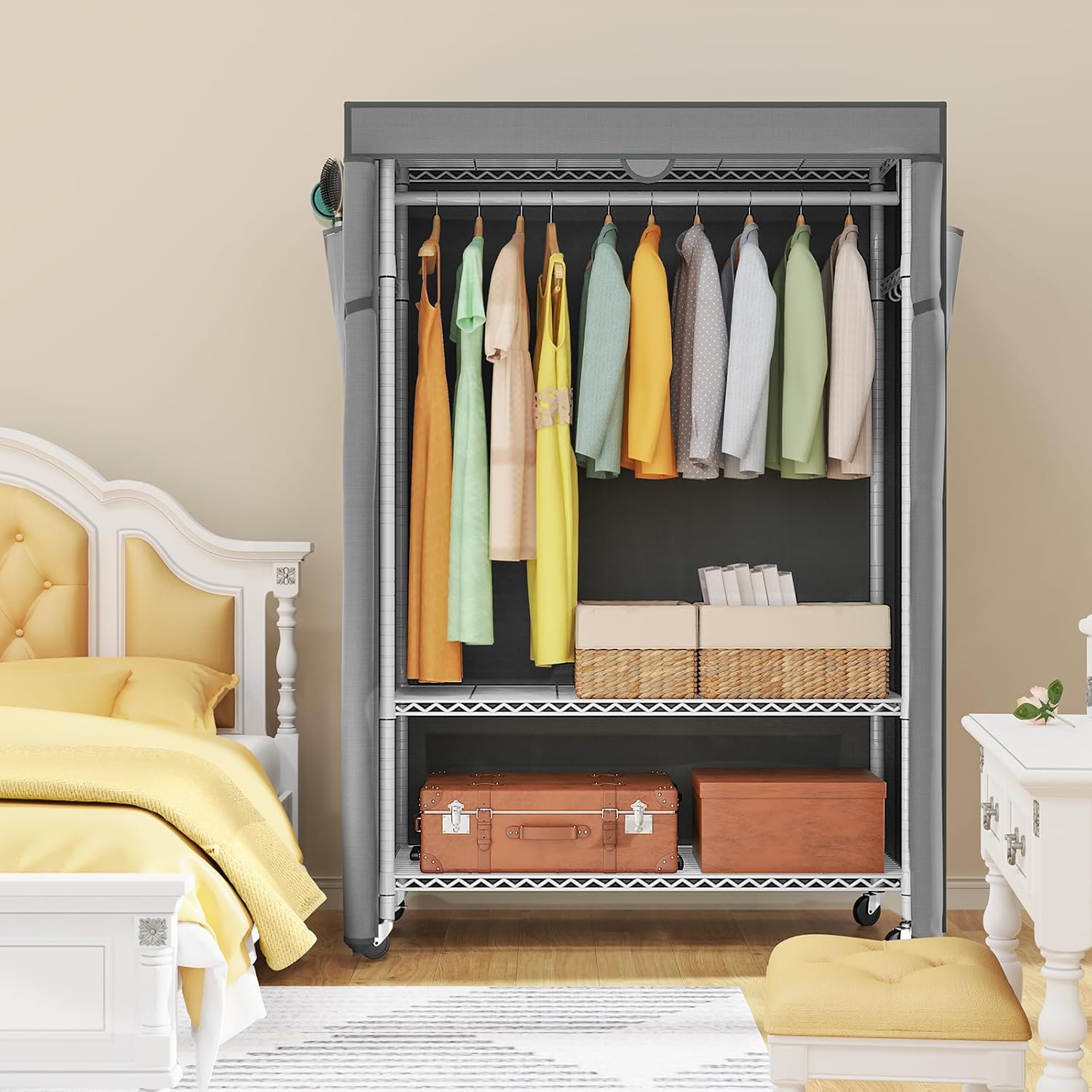 LEHOM G1C Heavy Duty Clothes Rack with Cover, Rolling Garment Rack for Hanging Clothes, Portable Closets with Oxford Fabric Cover, Freestanding Clothing Rack on Wheels (White+gray Cover, G1C)