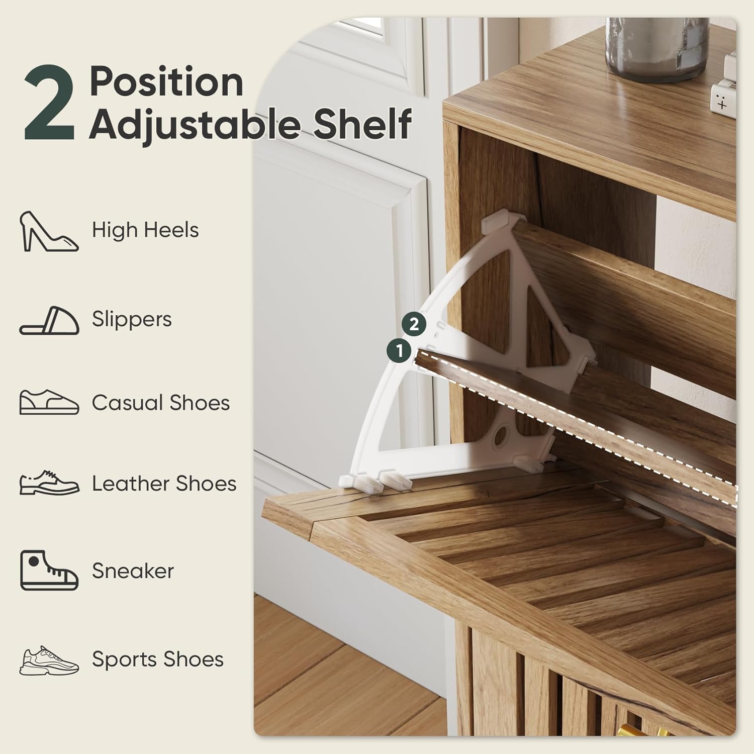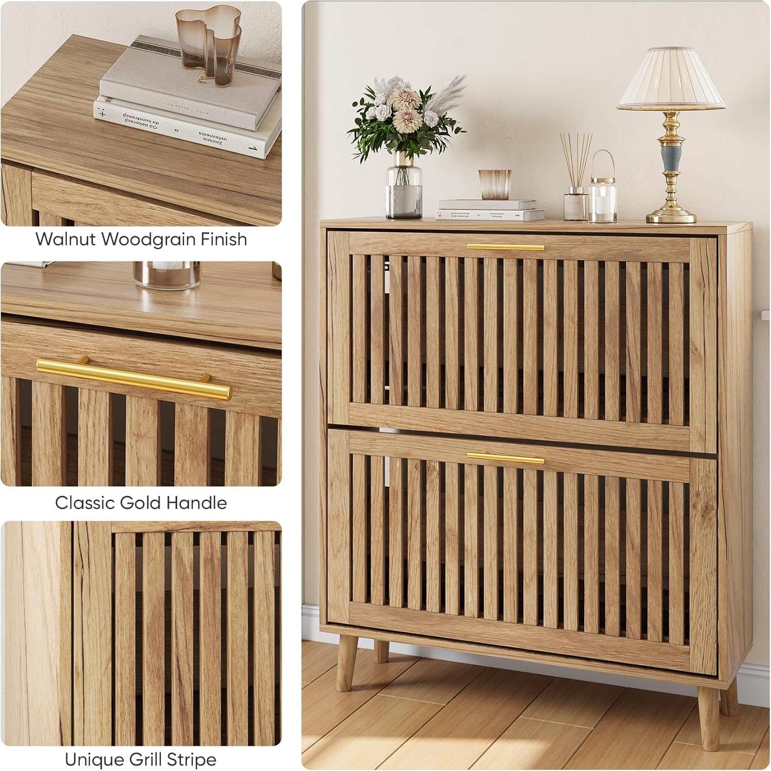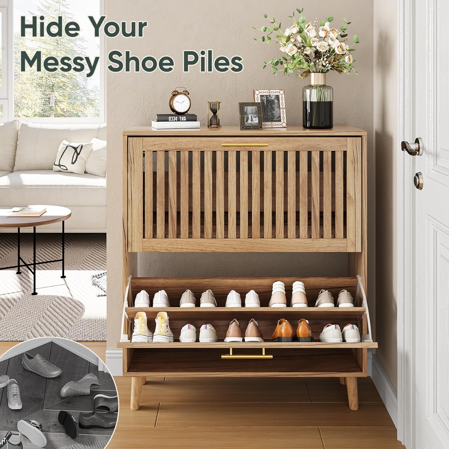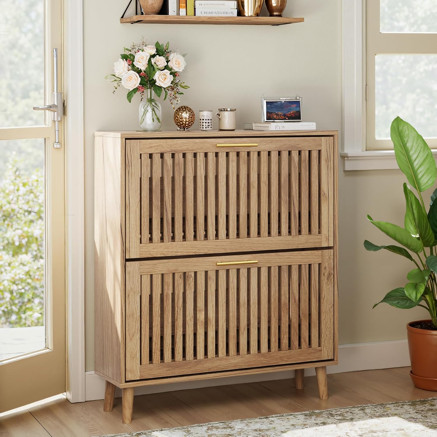 Shoe Storage Cabinet with 2 Flip Louvered Drawers, Narrow Wood Shoe Cabinet with Gold Handle, Hidden Entryway Shoe Organizer for Hallway, Foyer, Natural Oak