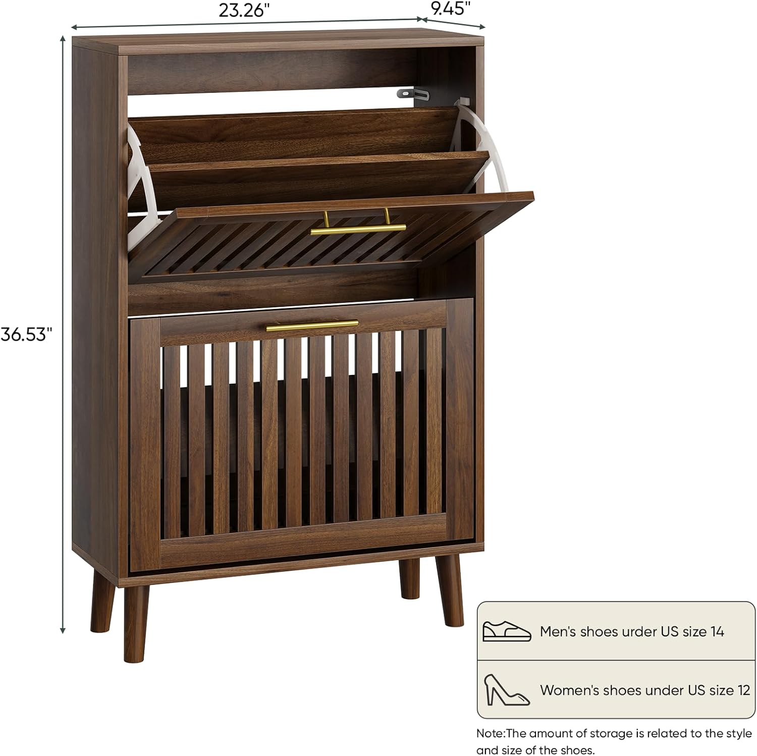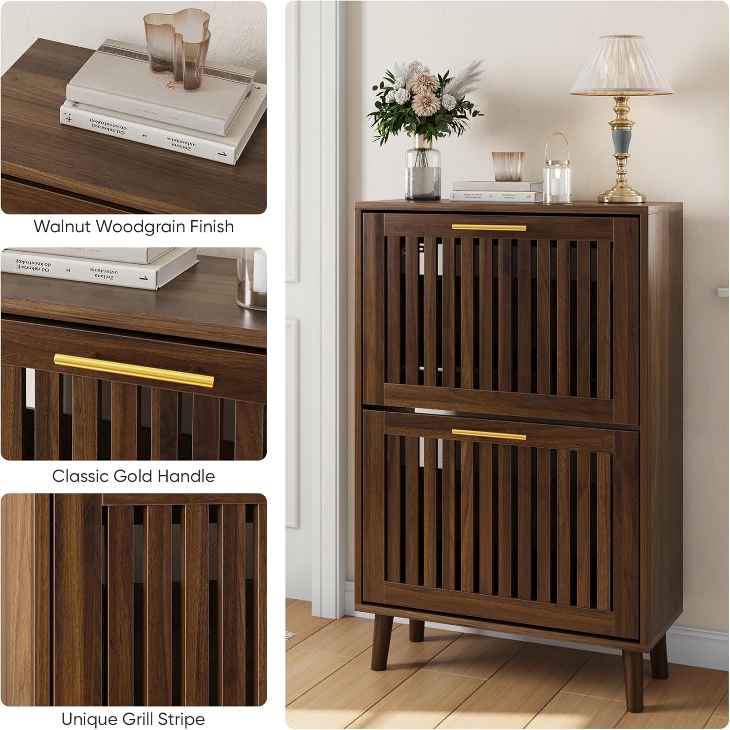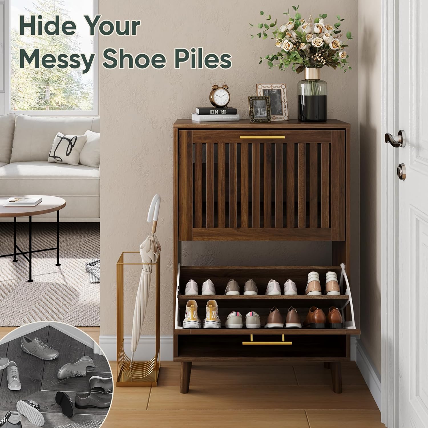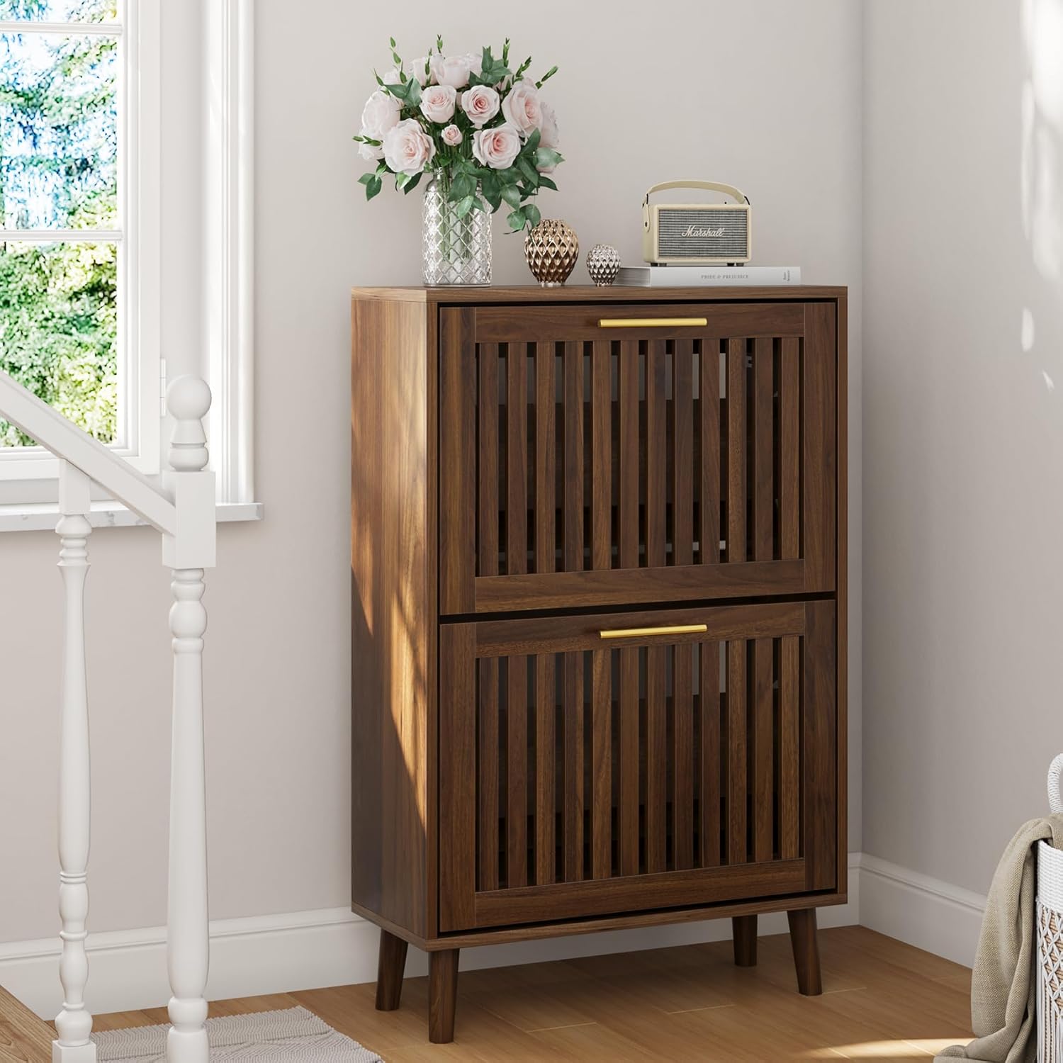 Shoe Storage Cabinet with 2 Flip Louvered Drawers, Narrow Wood Shoe Cabinet with Gold Handle, Hidden Entryway Shoe Organizer for Hallway, Foyer, Natural Oak