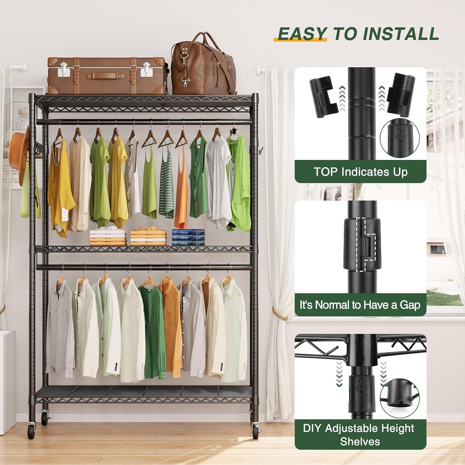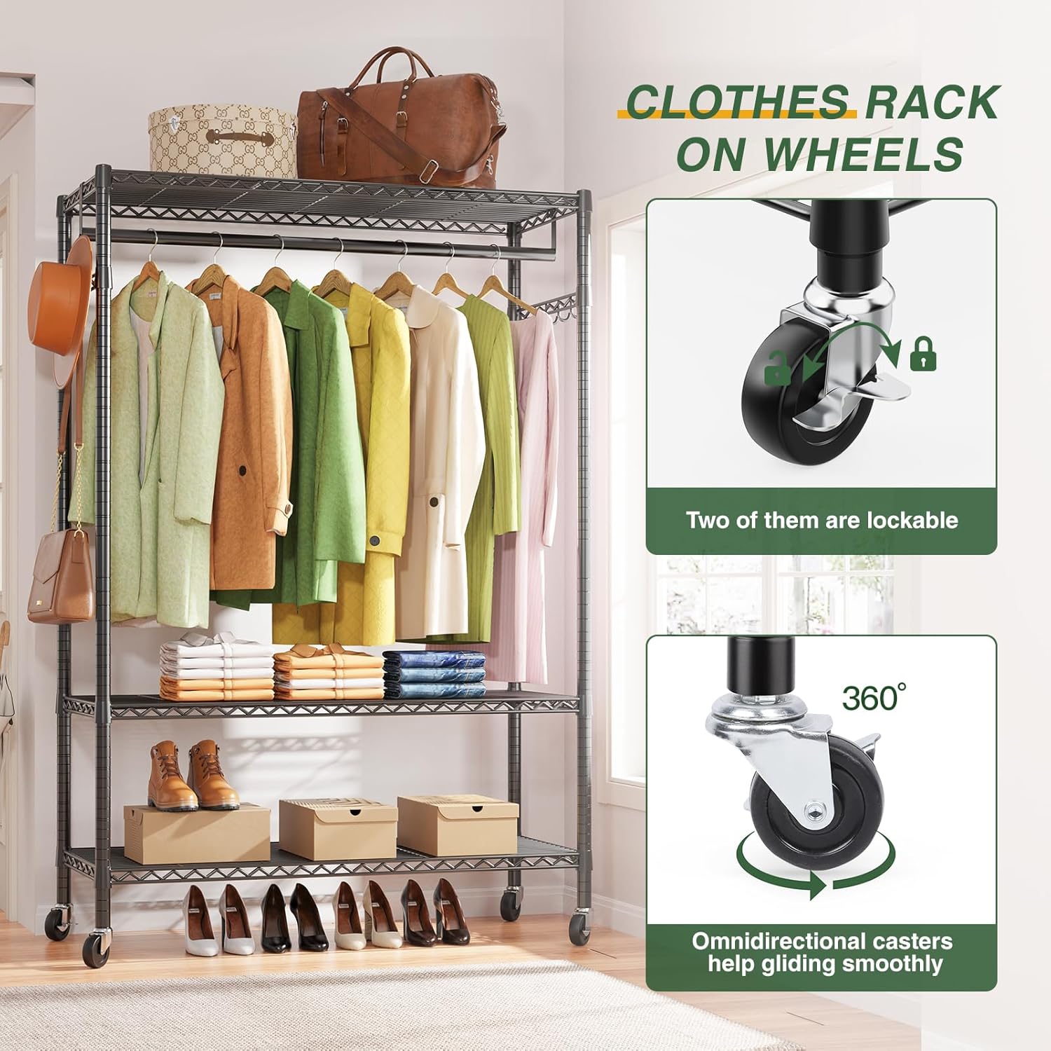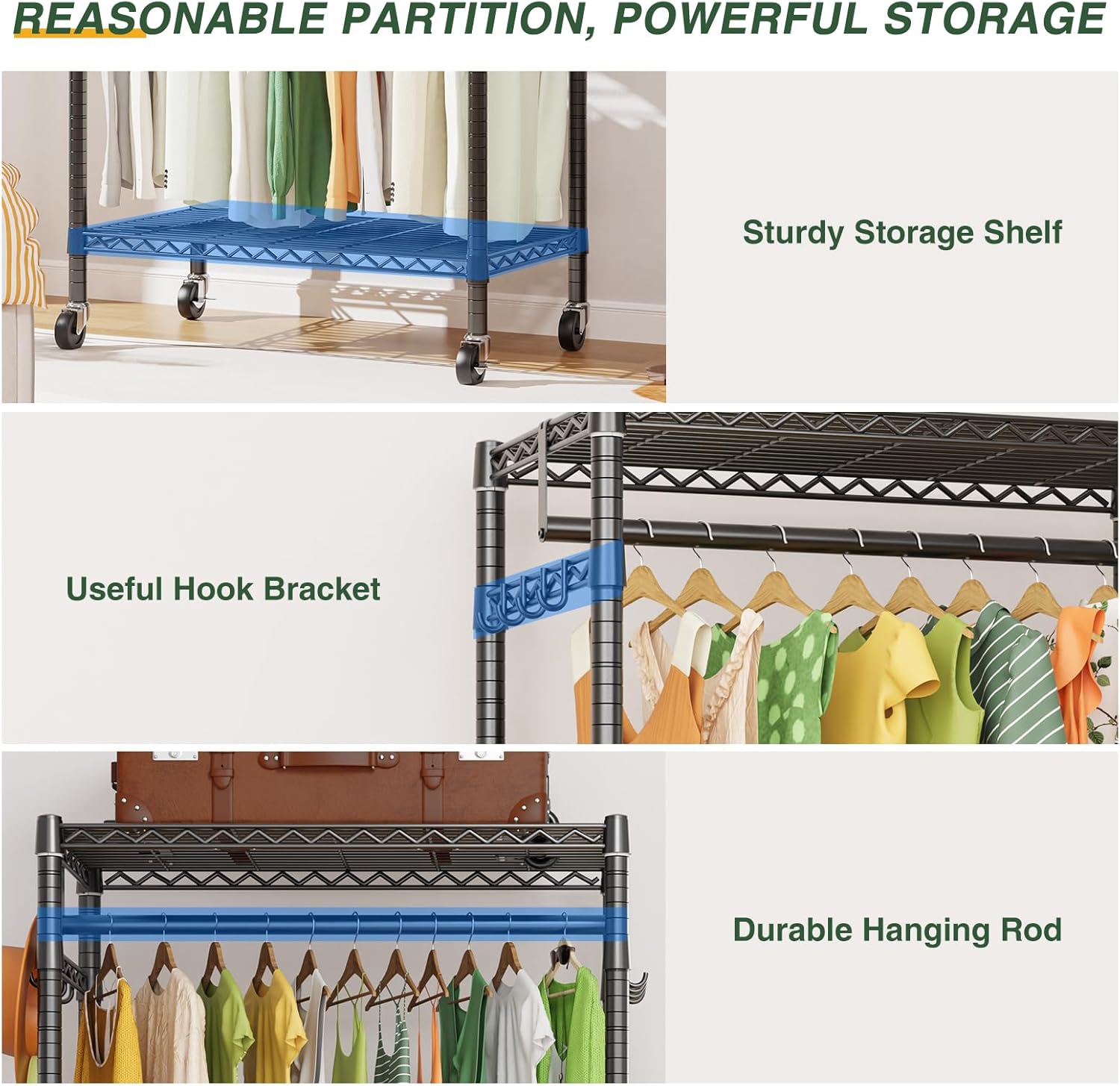 LEHOM G1L 3 Tiers Garment Rack with Storage Shelves, Heavy Duty Rolling Free-Standing Clothing Rack Closet Organizer with Double Rods/Lockable Wheels & 2 Pairs Side Hooks, Max Load 450 LBS, Black