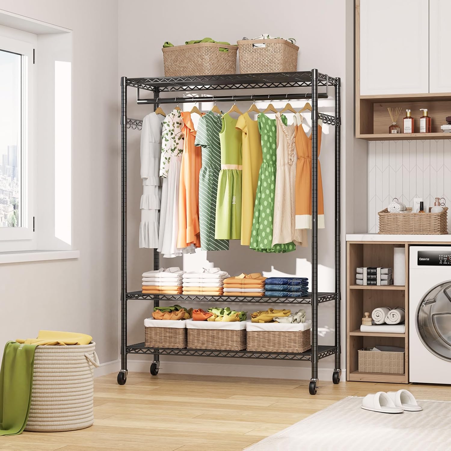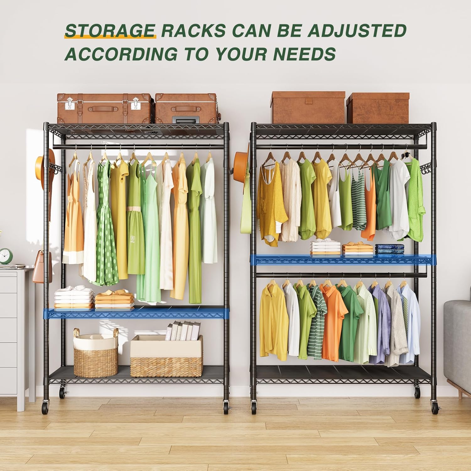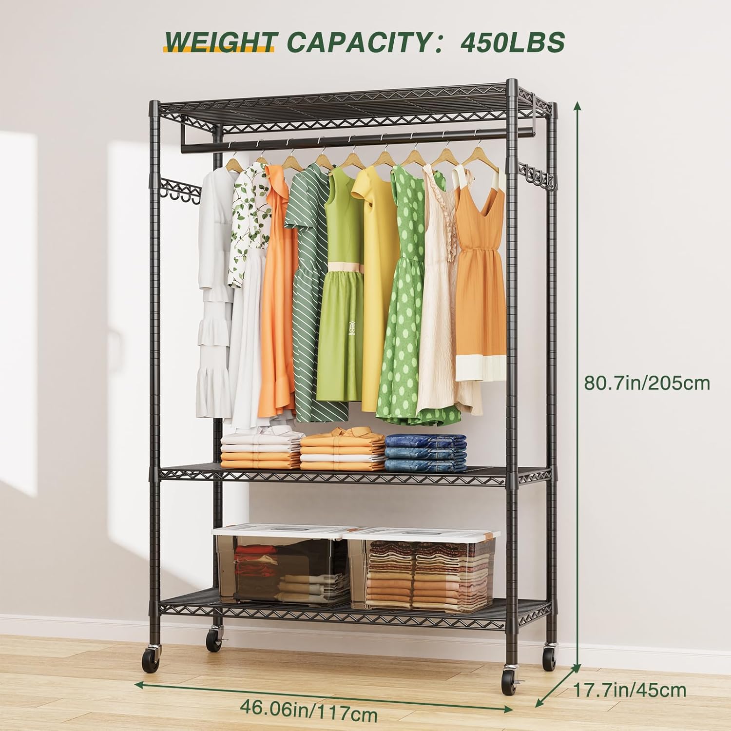 LEHOM G1L 3 Tiers Garment Rack with Storage Shelves, Heavy Duty Rolling Free-Standing Clothing Rack Closet Organizer with Double Rods/Lockable Wheels & 2 Pairs Side Hooks, Max Load 450 LBS, Black