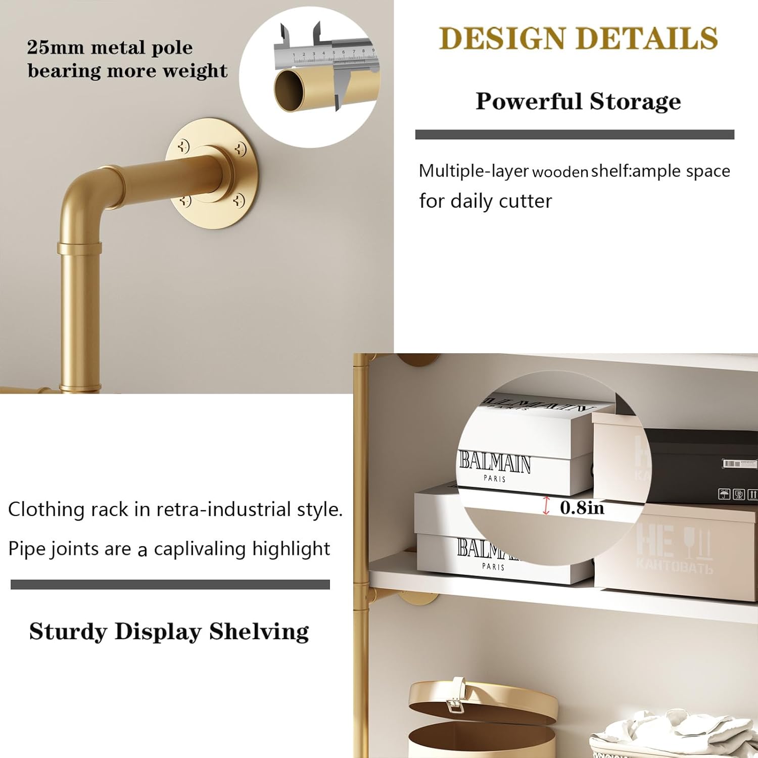 Industrial Pipe Gold Clothing Rack with Shelves, Retail Display Wall Mounted Storage Clothes Hanging Shelf Gold Pipeline Hanging Rod Steampunk Style, 4 Tier Wood Garment Rack 72.8x71inch