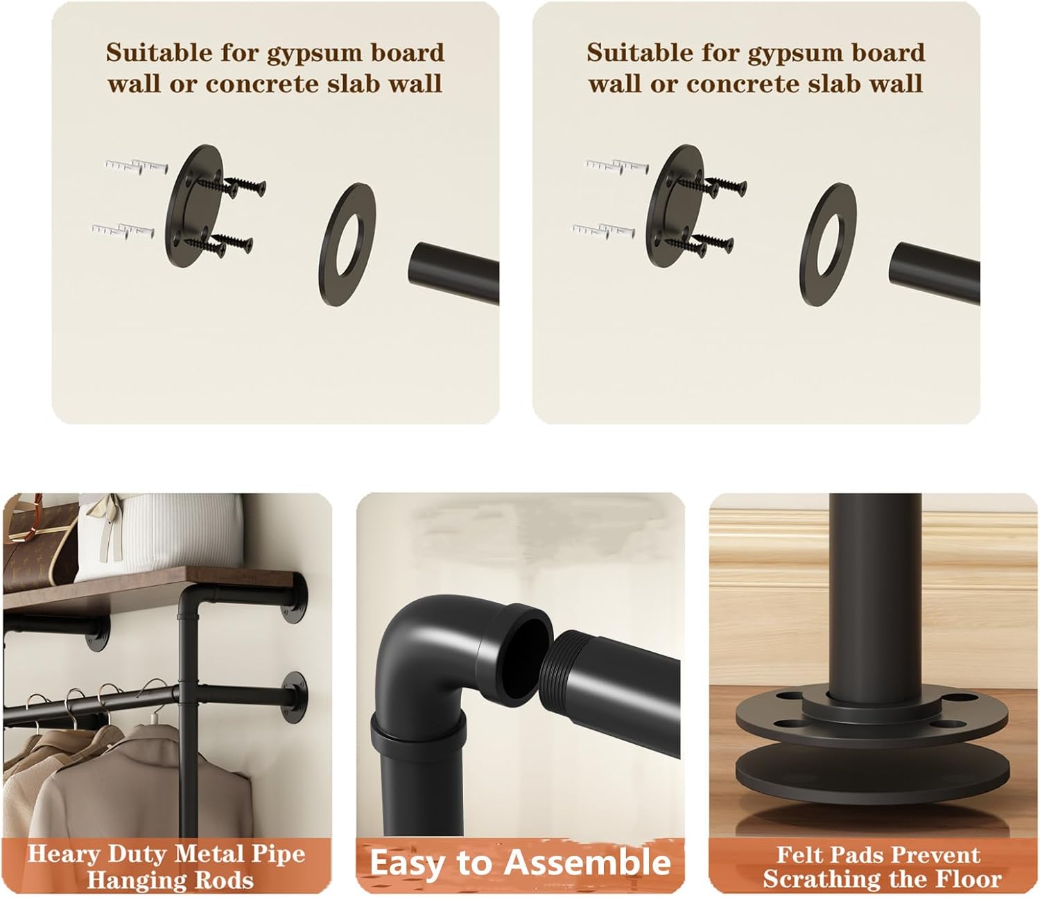 Industrial Pipe Clothes Rack, Wall Mounted Clothing Rack with Shelves, Heavy Duty Closet Organizers Wardrobe Multi-Purpose Storage Clothes Hanging Shelf-70.8''L Black