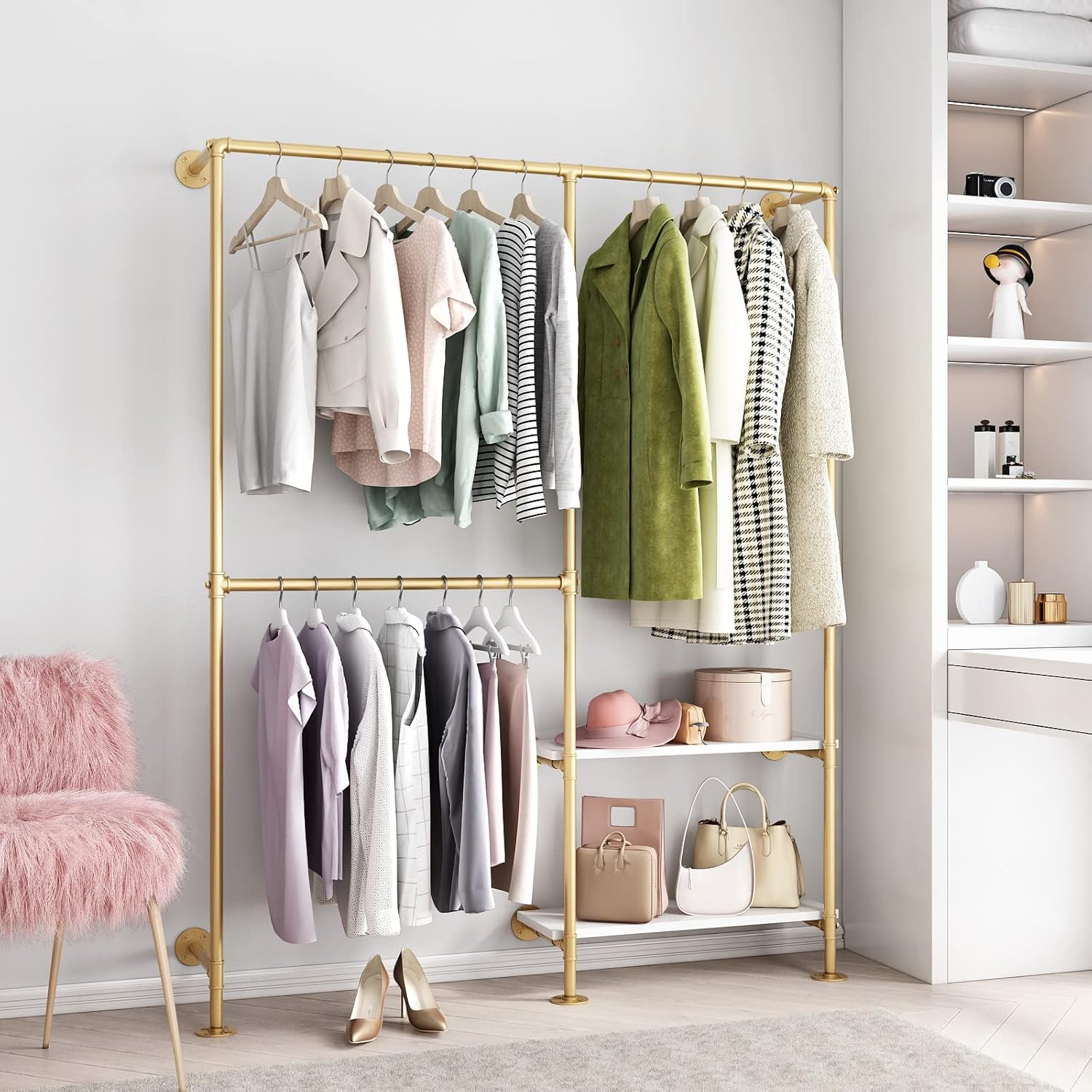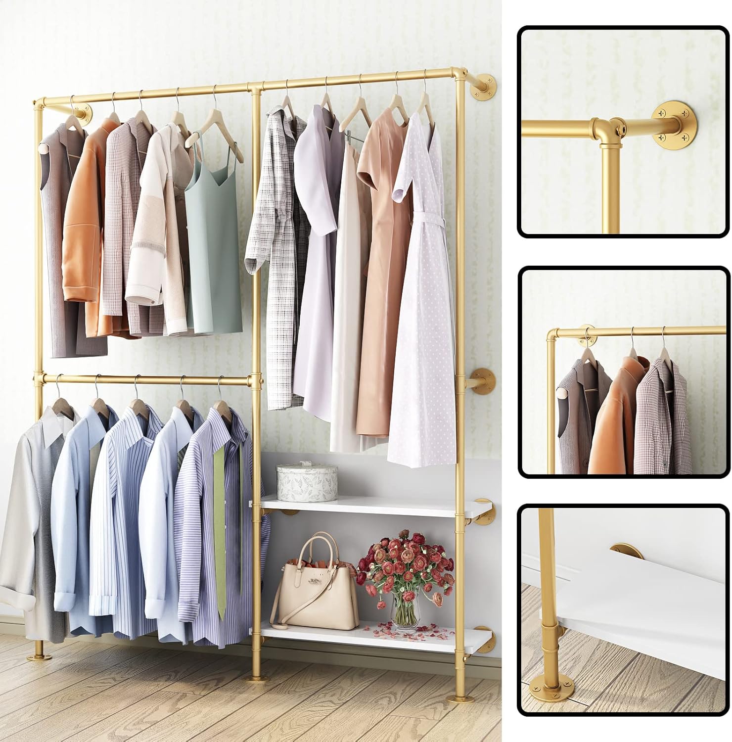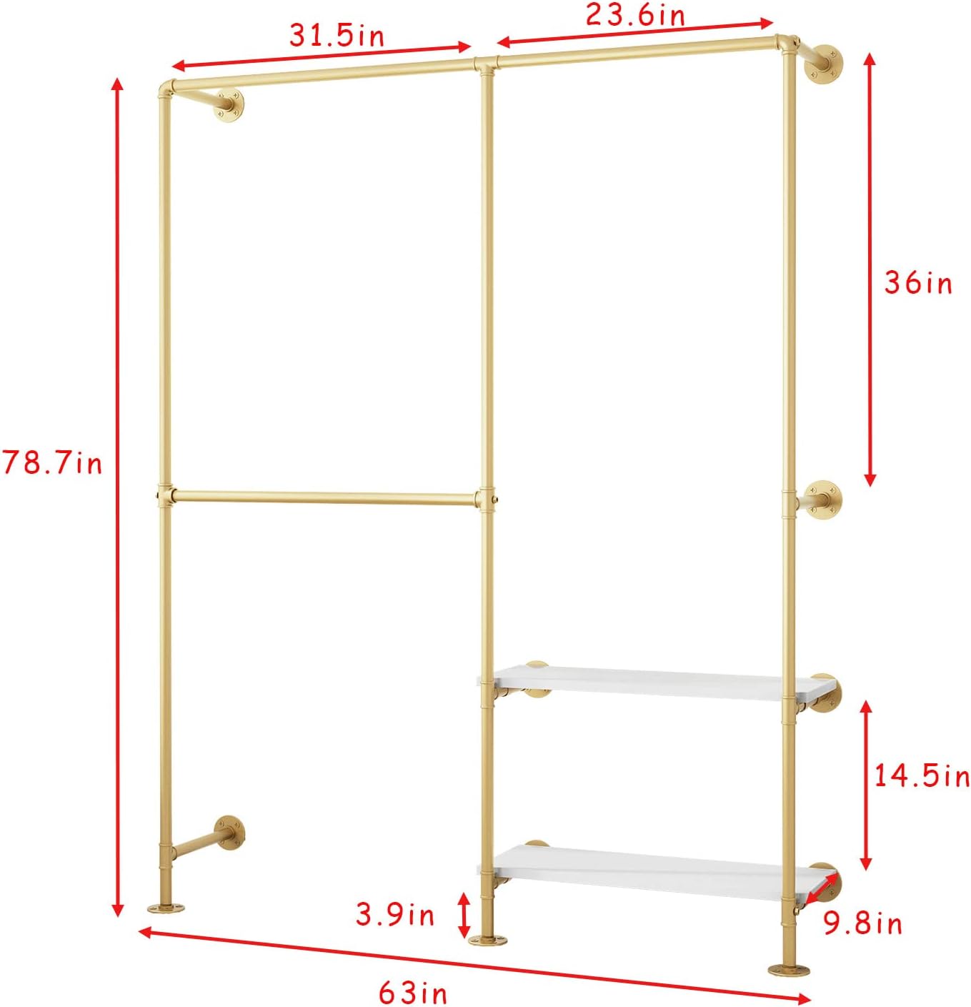 Gold Pipe Clothes Racks with White Shelves, Industrial Pipe Gold Clothing Rack with Double Hanging Rods, Heavy Duty Wall Mounted Clothing Rack Rod for Closet Storage, Bedroom