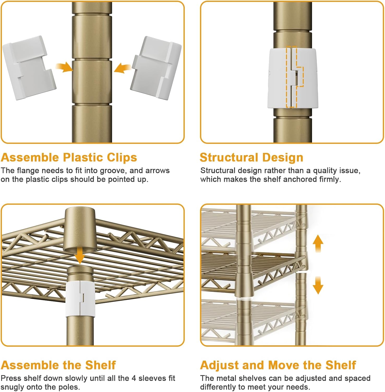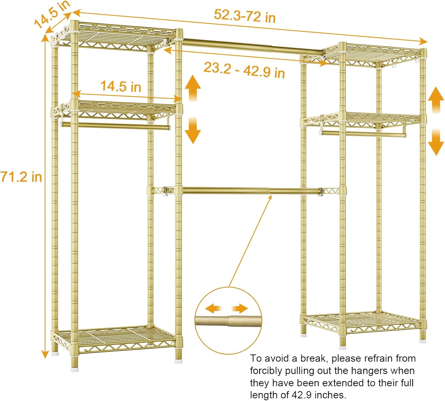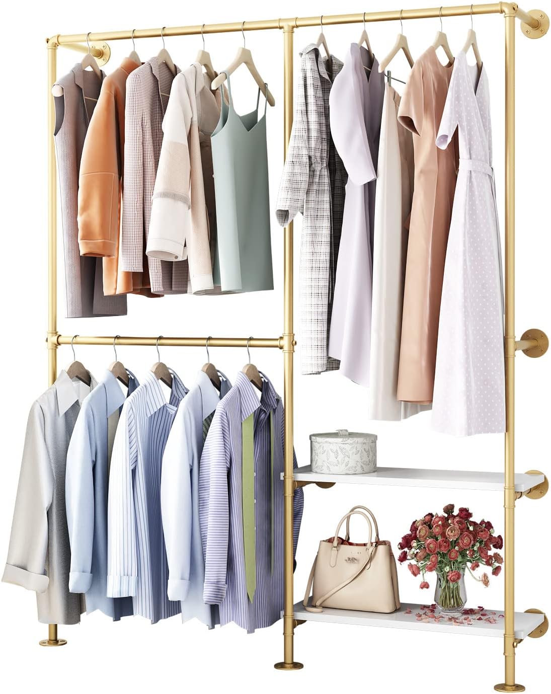 Gold Pipe Clothes Racks with White Shelves, Industrial Pipe Gold Clothing Rack with Double Hanging Rods, Heavy Duty Wall Mounted Clothing Rack Rod for Closet Storage, Bedroom