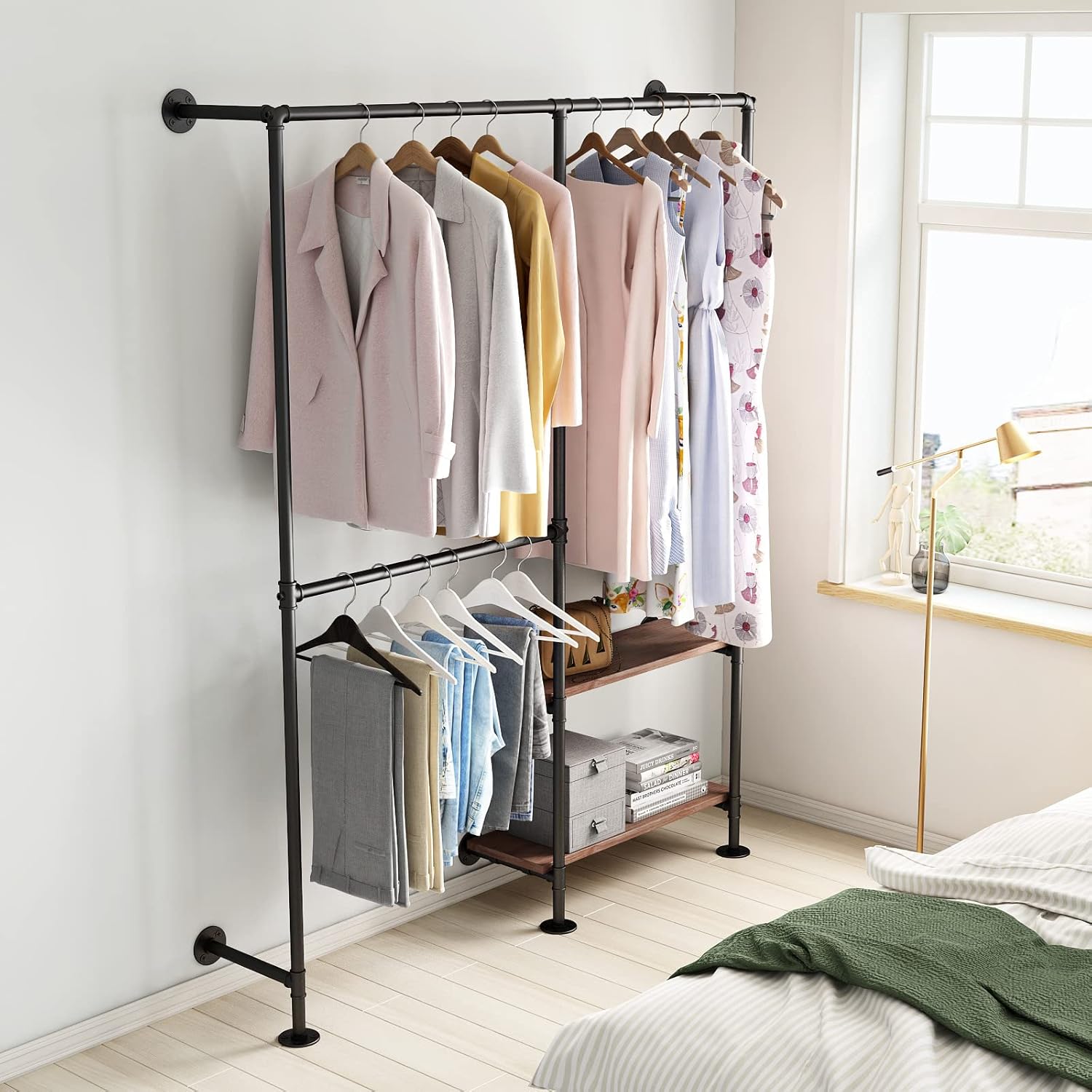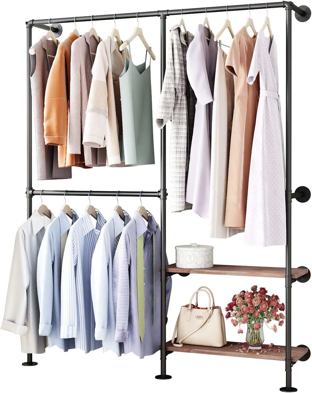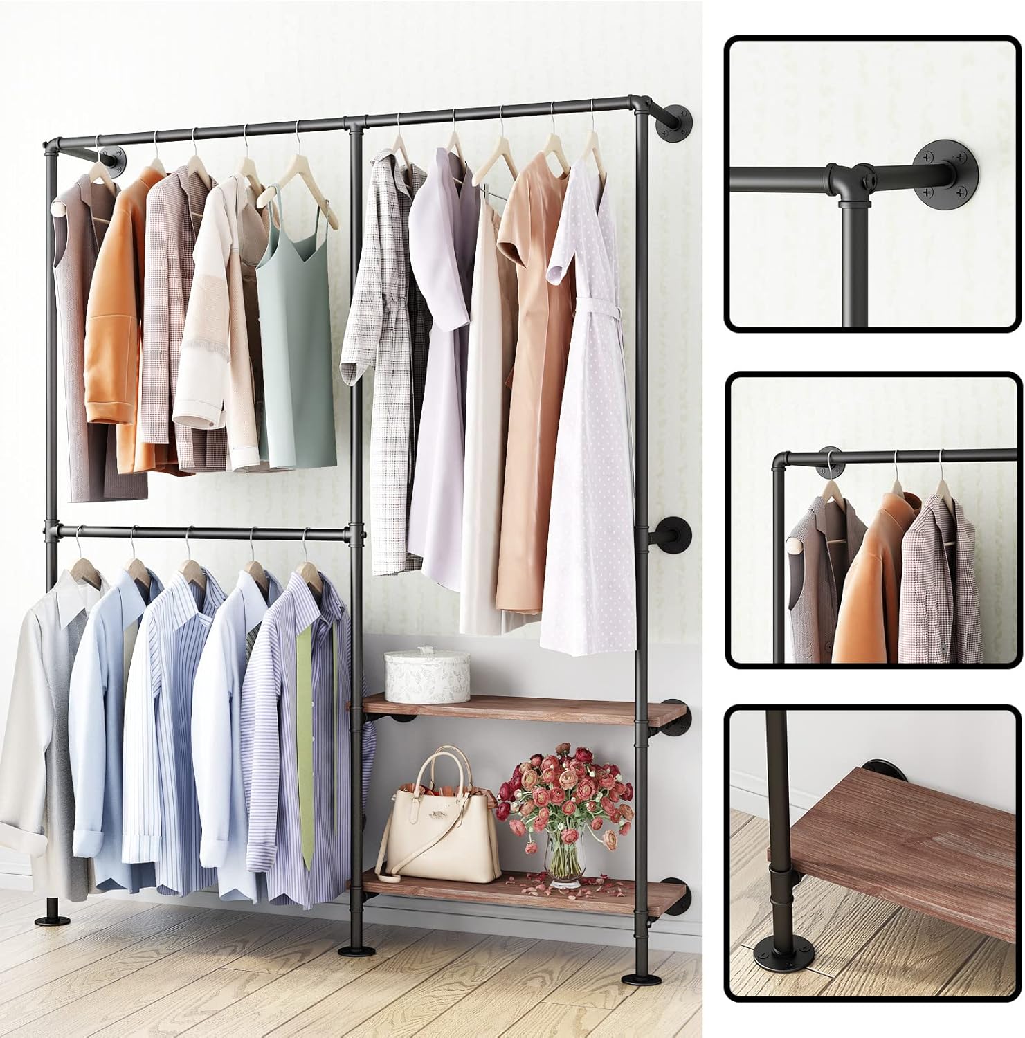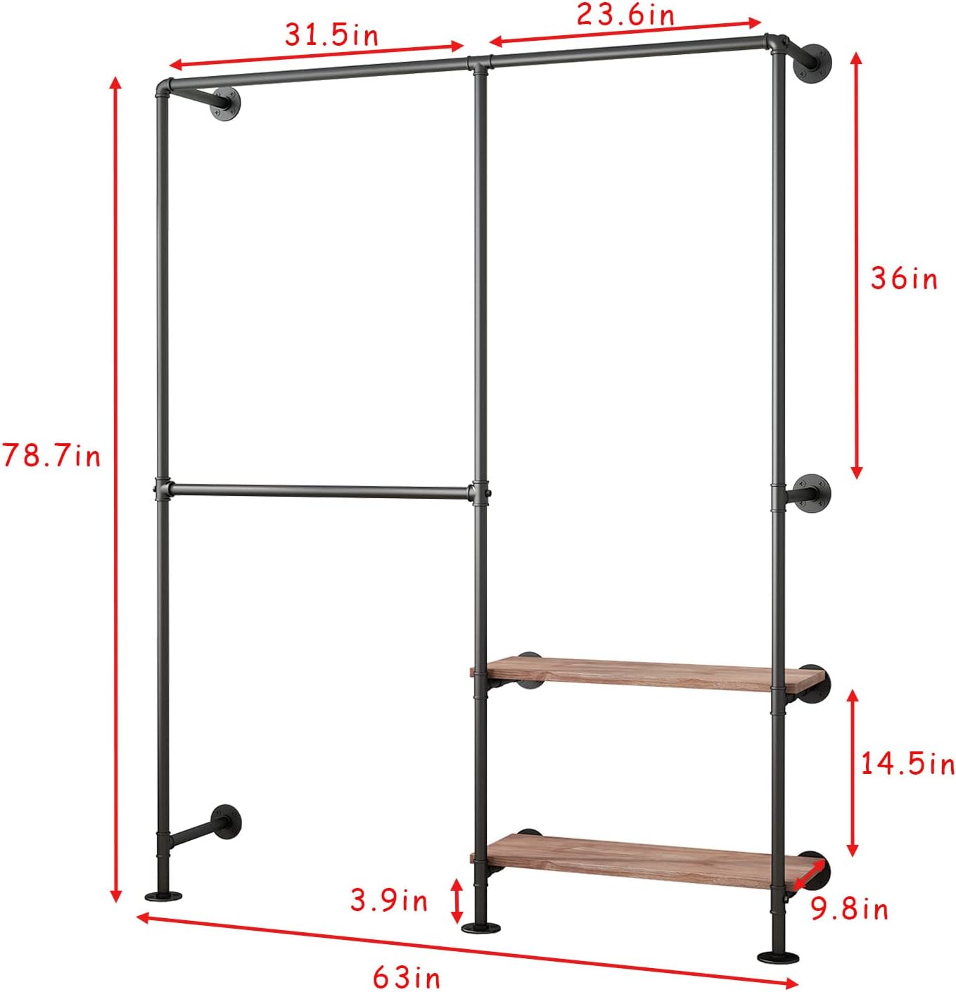 Industrial Pipe Clothes Racks with Black Shelves, Industrial Pipe Black Clothing Rack with Double Hanging Rods, Heavy Duty Wall Mounted Clothing Rack Rod for Closet Storage, Bedroom