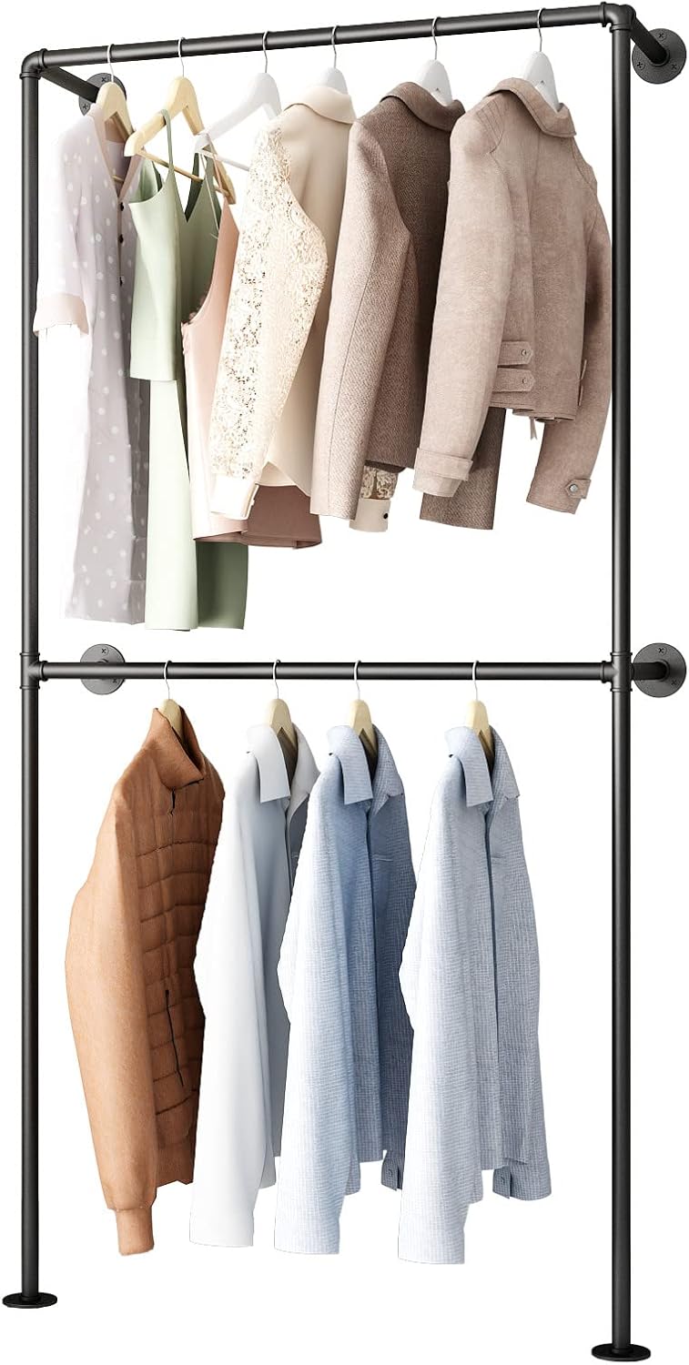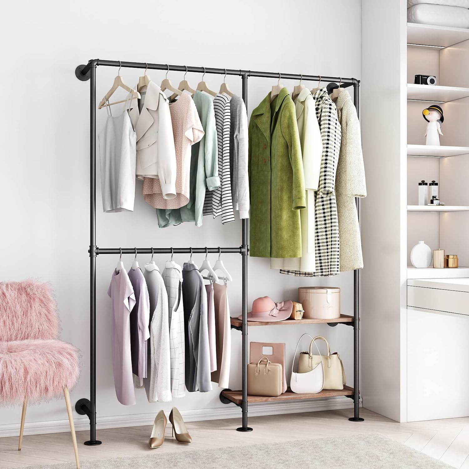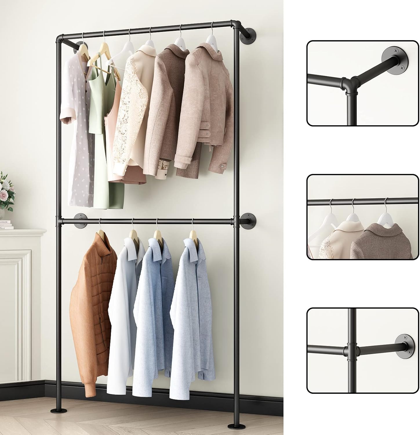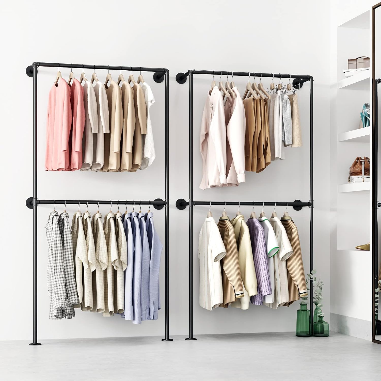 Industrial Pipe Clothes Racks with Black Shelves, Industrial Pipe Black Clothing Rack with Double Hanging Rods, Heavy Duty Wall Mounted Clothing Rack Rod for Closet Storage, Bedroom