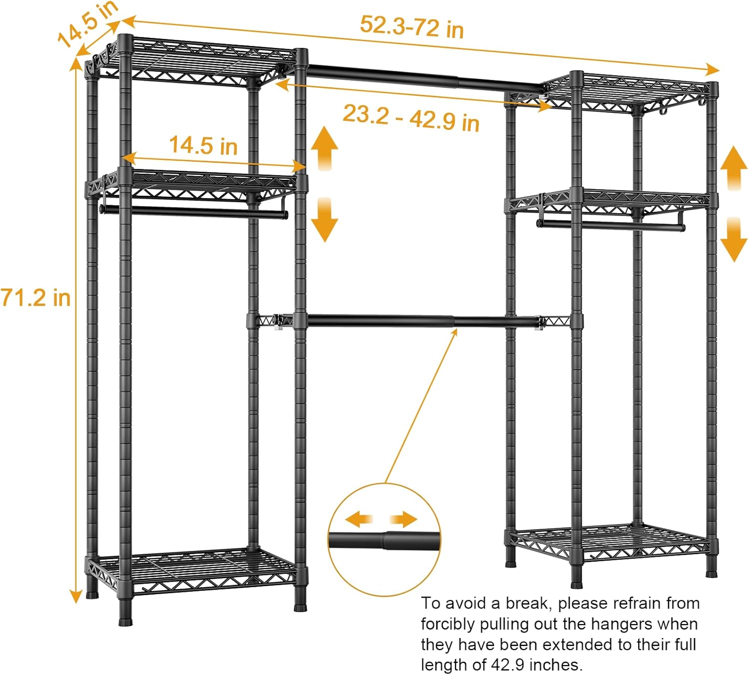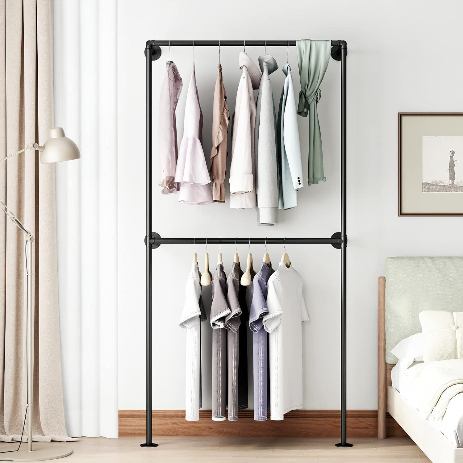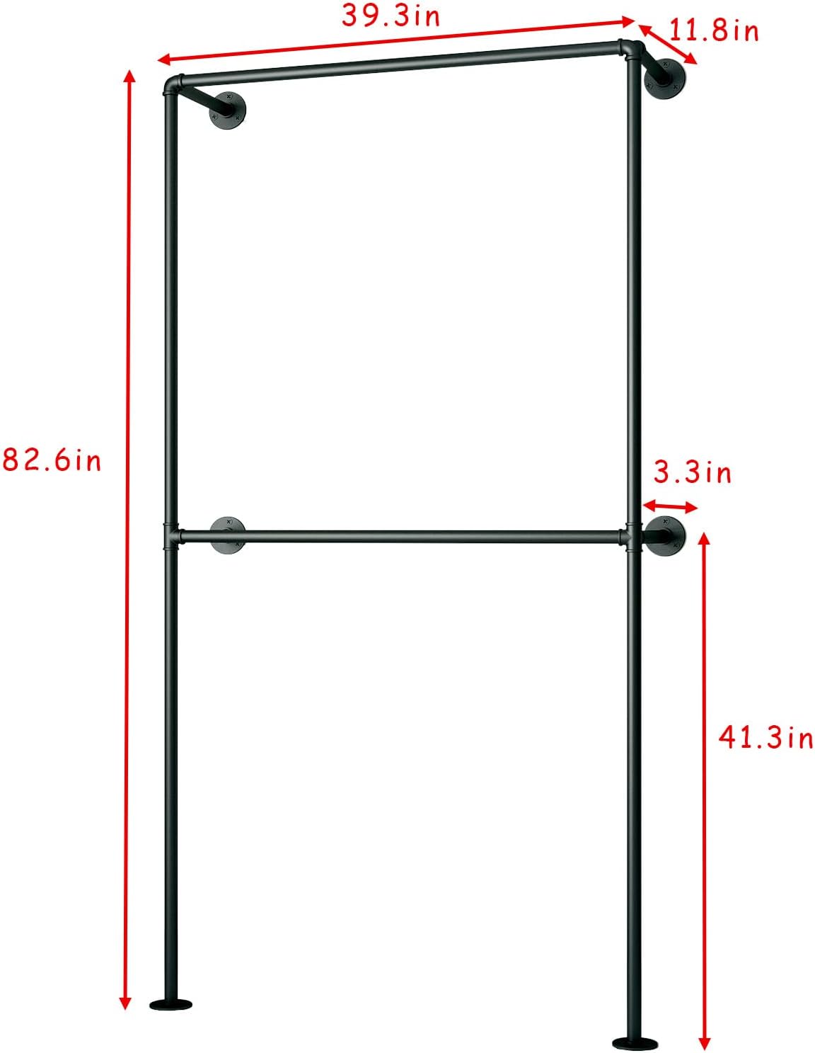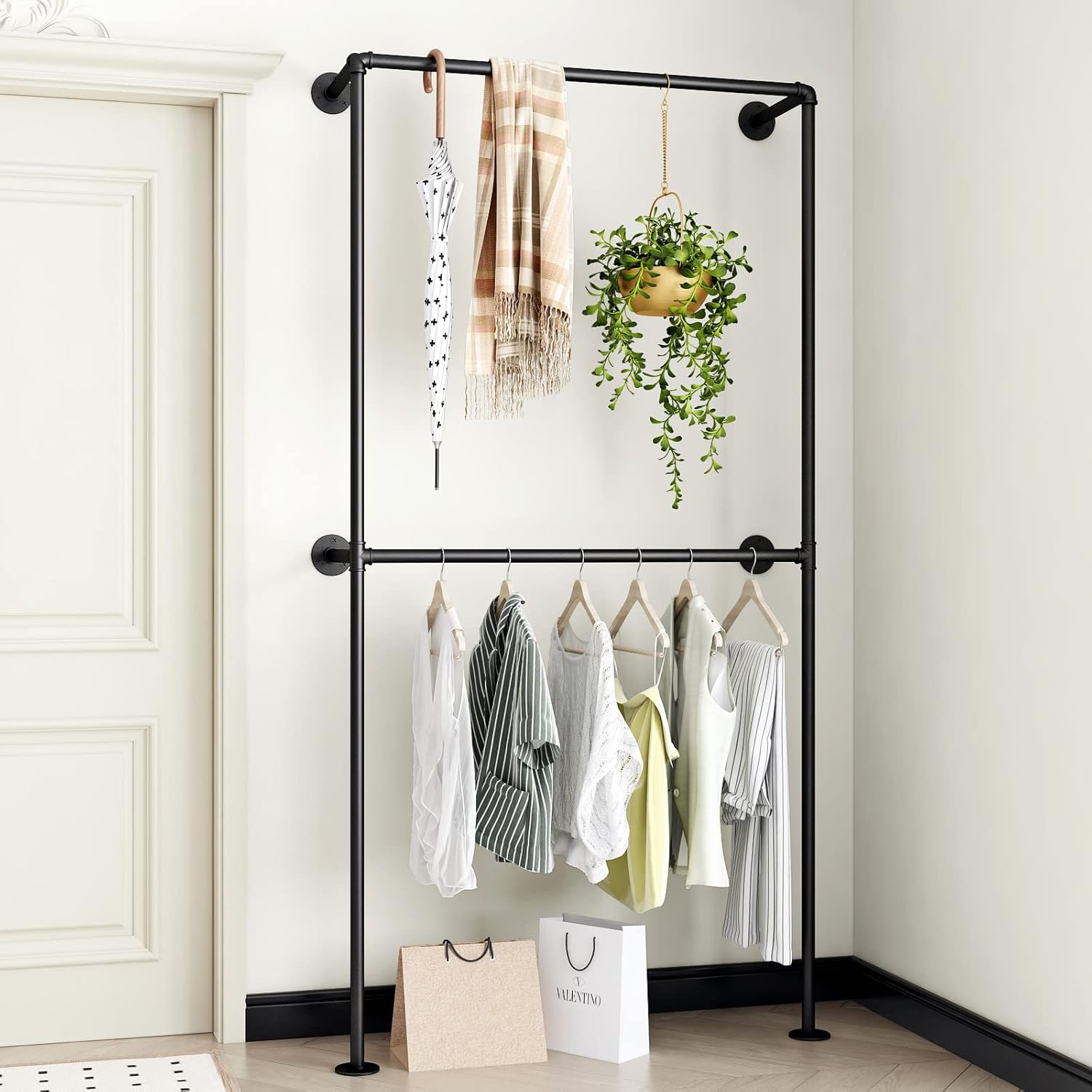 Industrial Pipe Clothes Racks with Black Shelves, Industrial Pipe Black Clothing Rack with Double Hanging Rods, Heavy Duty Wall Mounted Clothing Rack Rod for Closet Storage, Bedroom