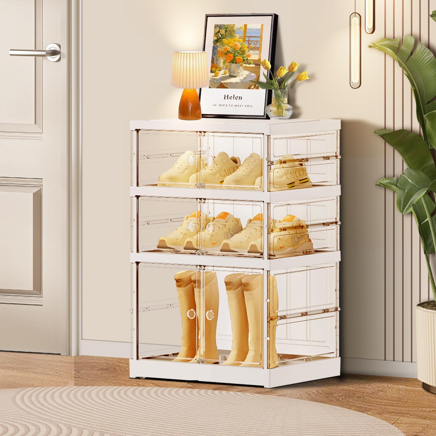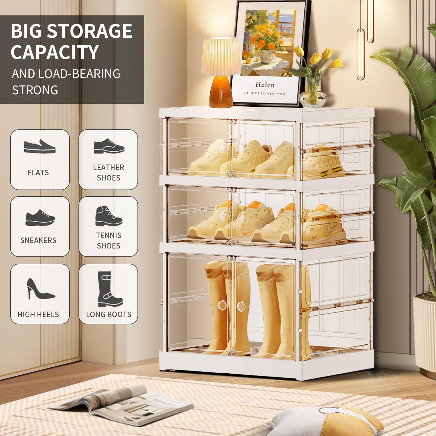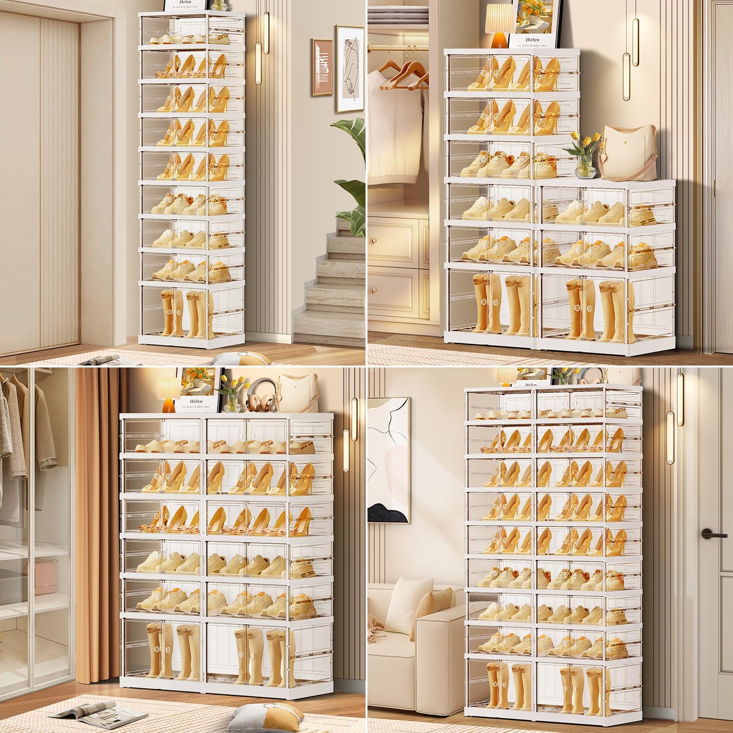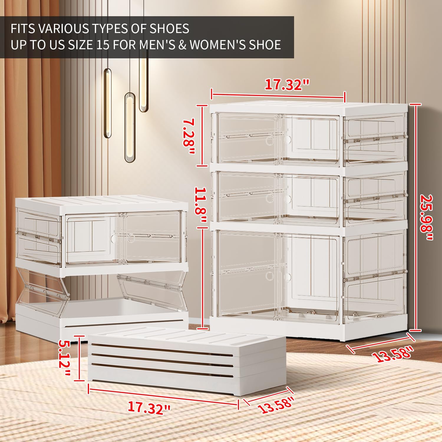 6-Tier Foldable Shoe Rack for Closet Entryway 12-24Pairs,Stackable Clear Shoe Storage Boxes Organizer with Door Plastic Shoe Cabinet Bins with Lids Shoes Shelf Easy Assembly Large White