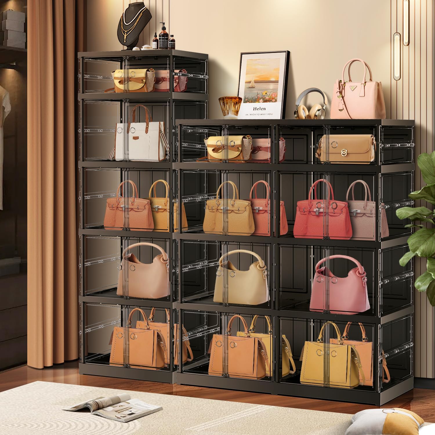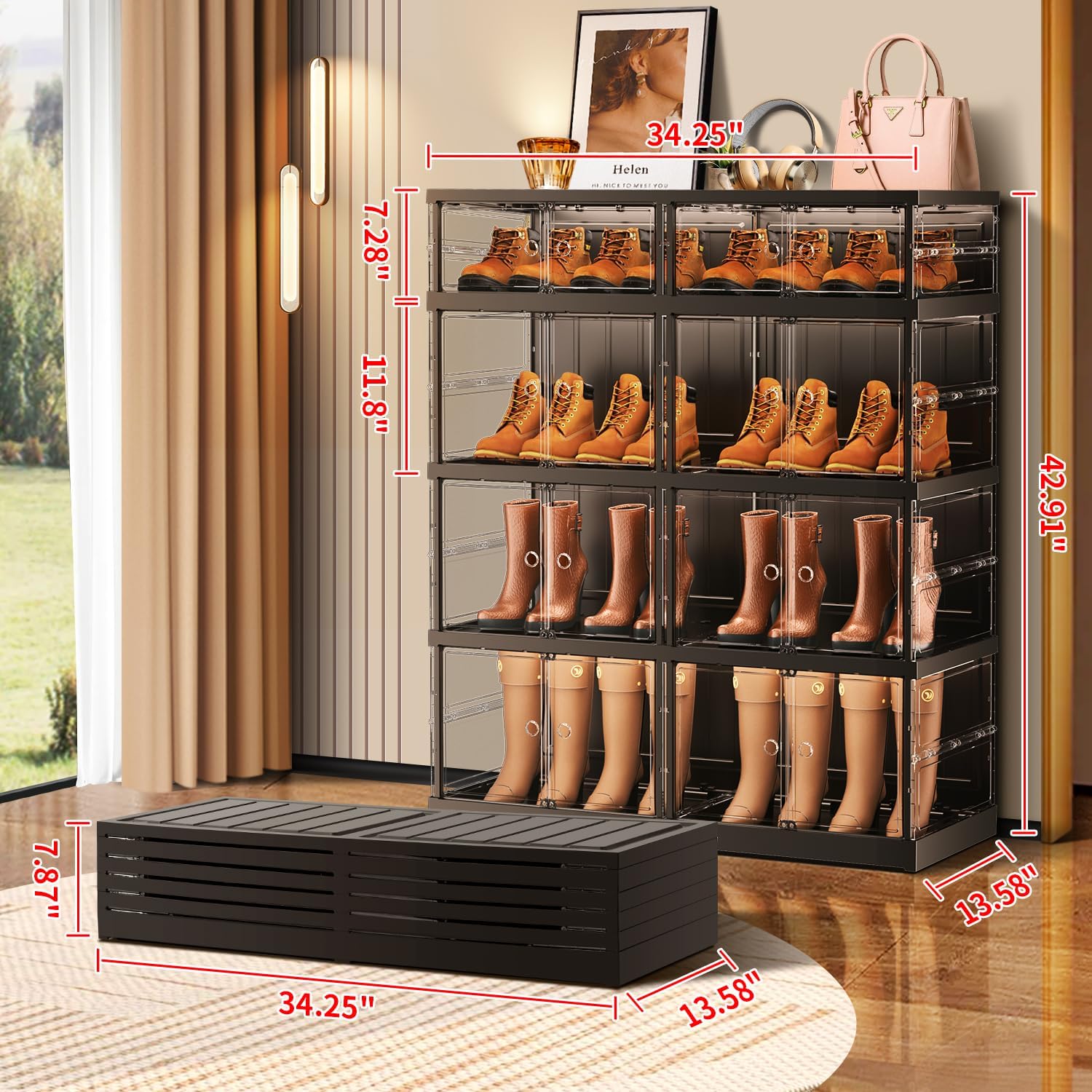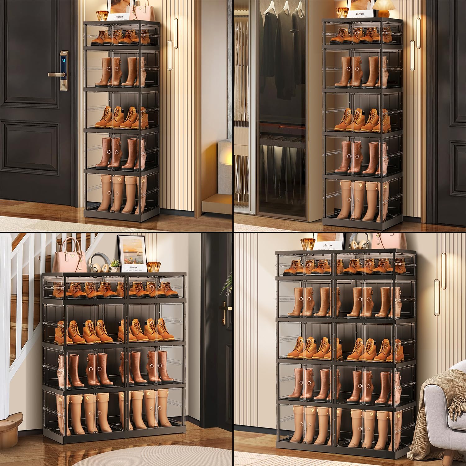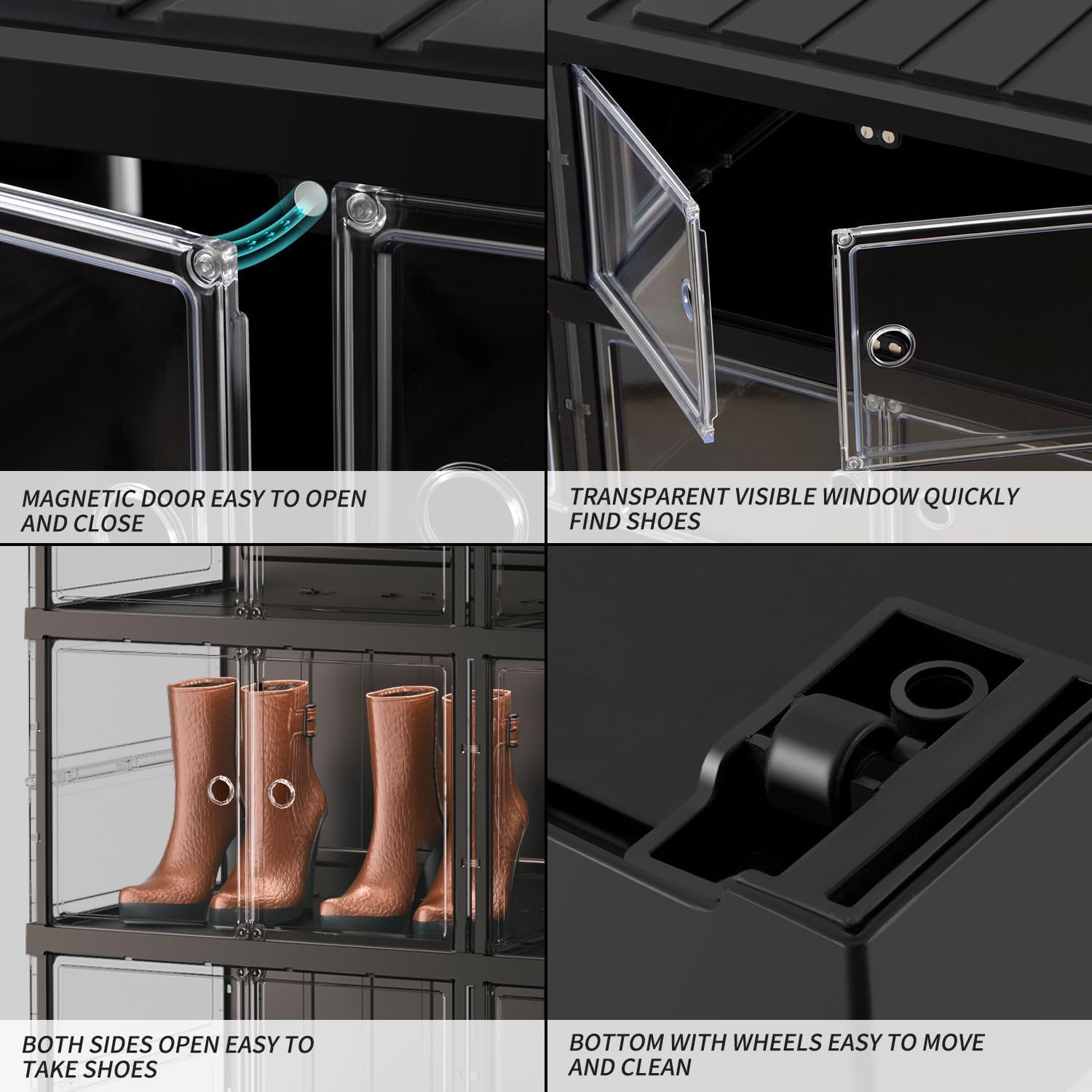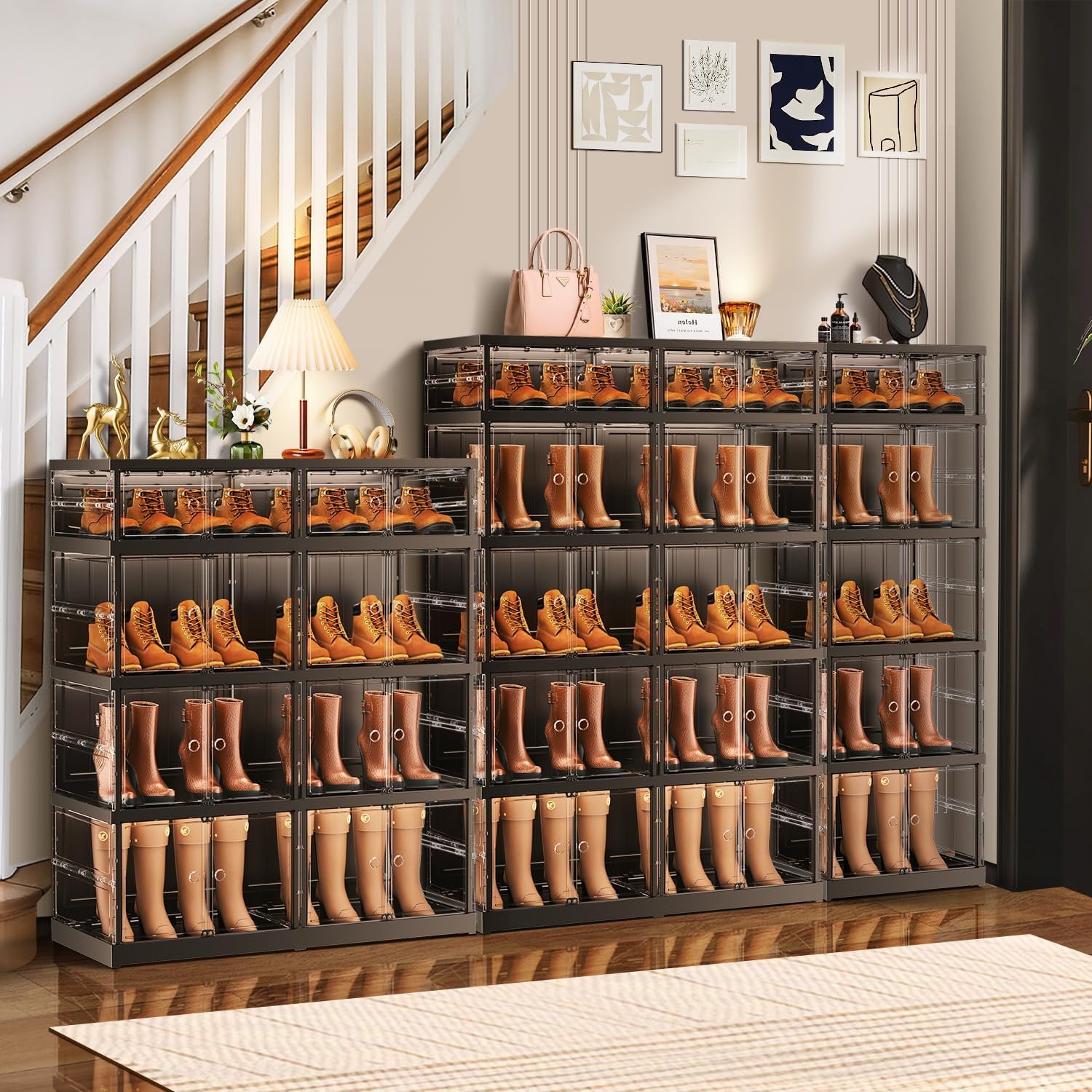 6-Tier Foldable Shoe Rack for Closet Entryway 12-24Pairs,Stackable Clear Shoe Storage Boxes Organizer with Door Plastic Shoe Cabinet Bins with Lids Shoes Shelf Easy Assembly Large White