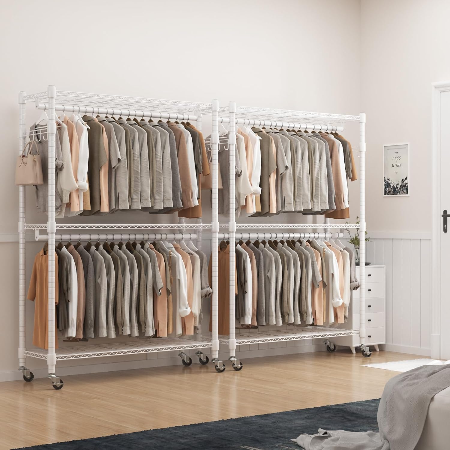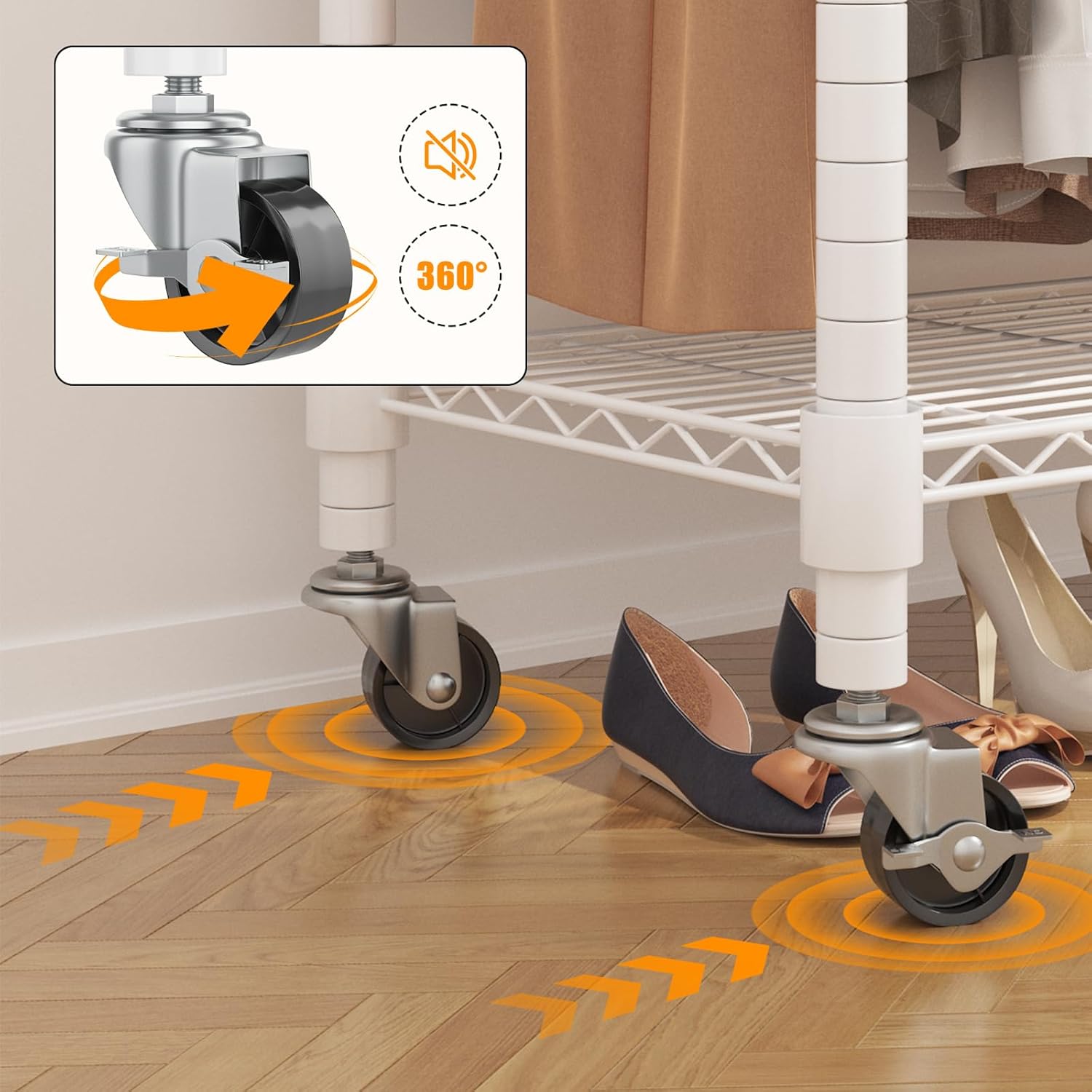 BATHWA Heavy Duty Garment Rack on Wheels, Rolling Clothes Racks for hanging clothes, Modern Closet Wardrobe Clothing Rack with 8 Side Hangers, White