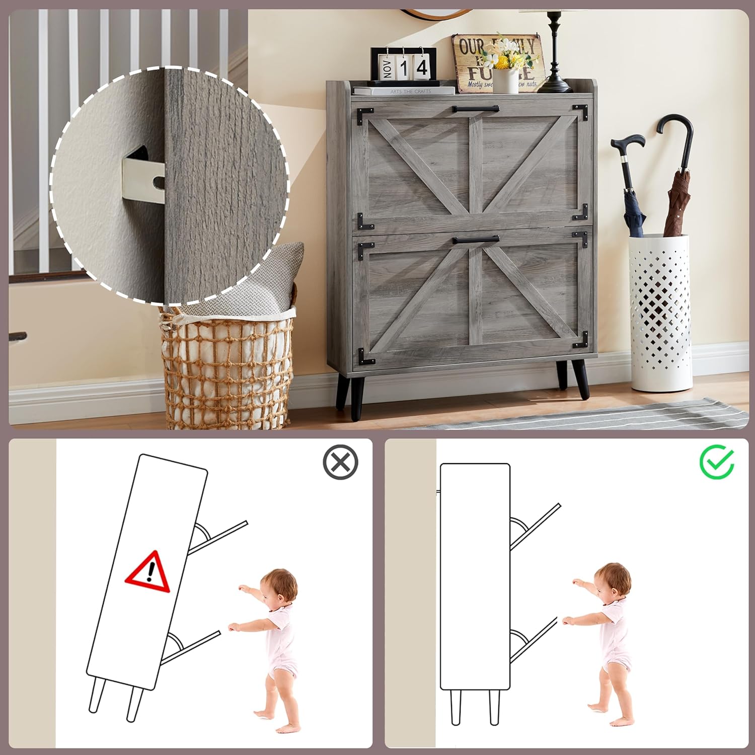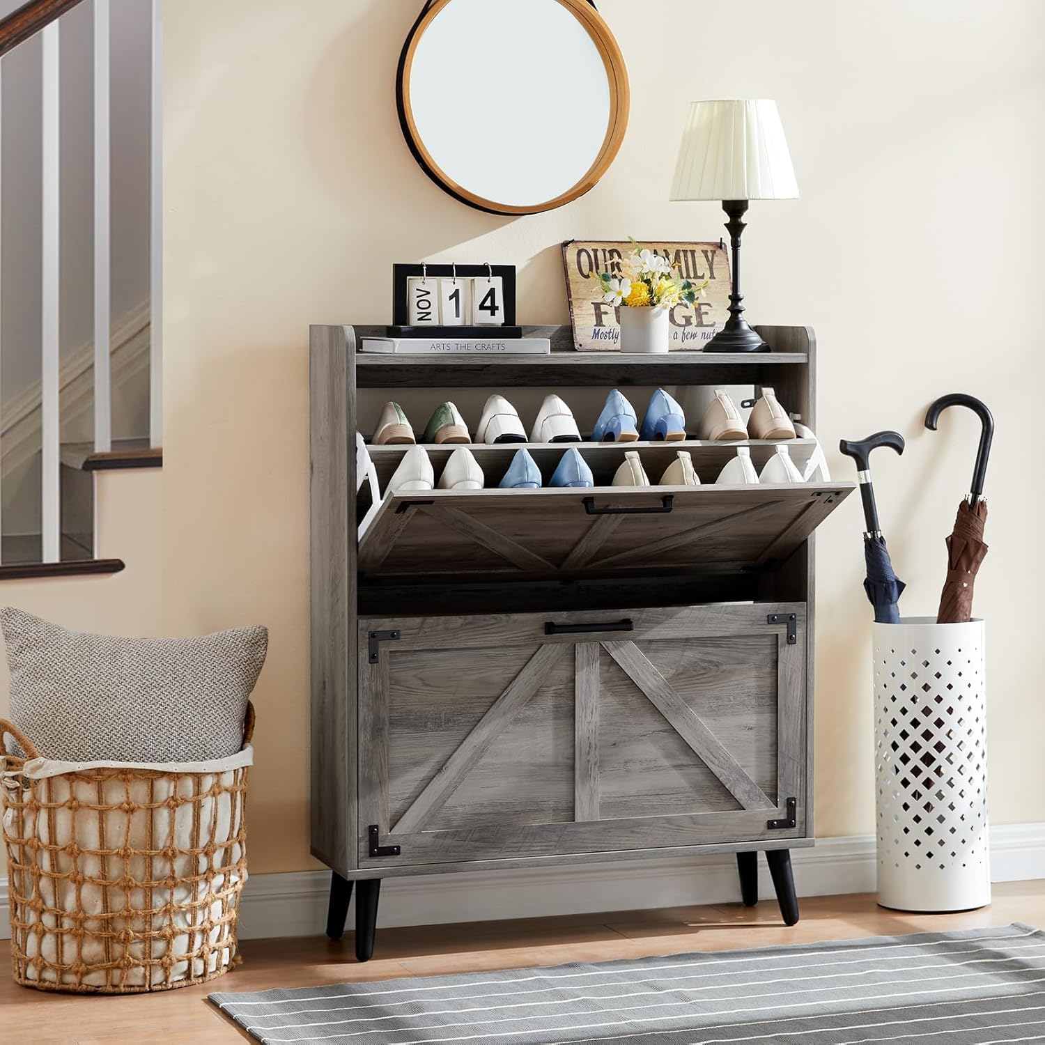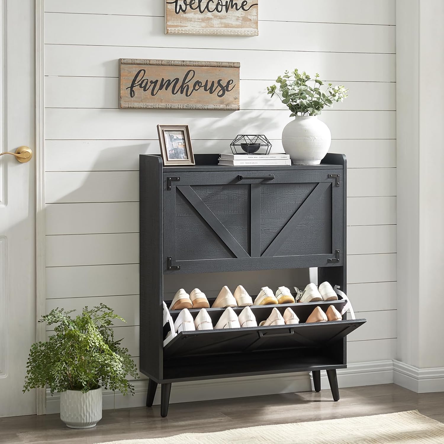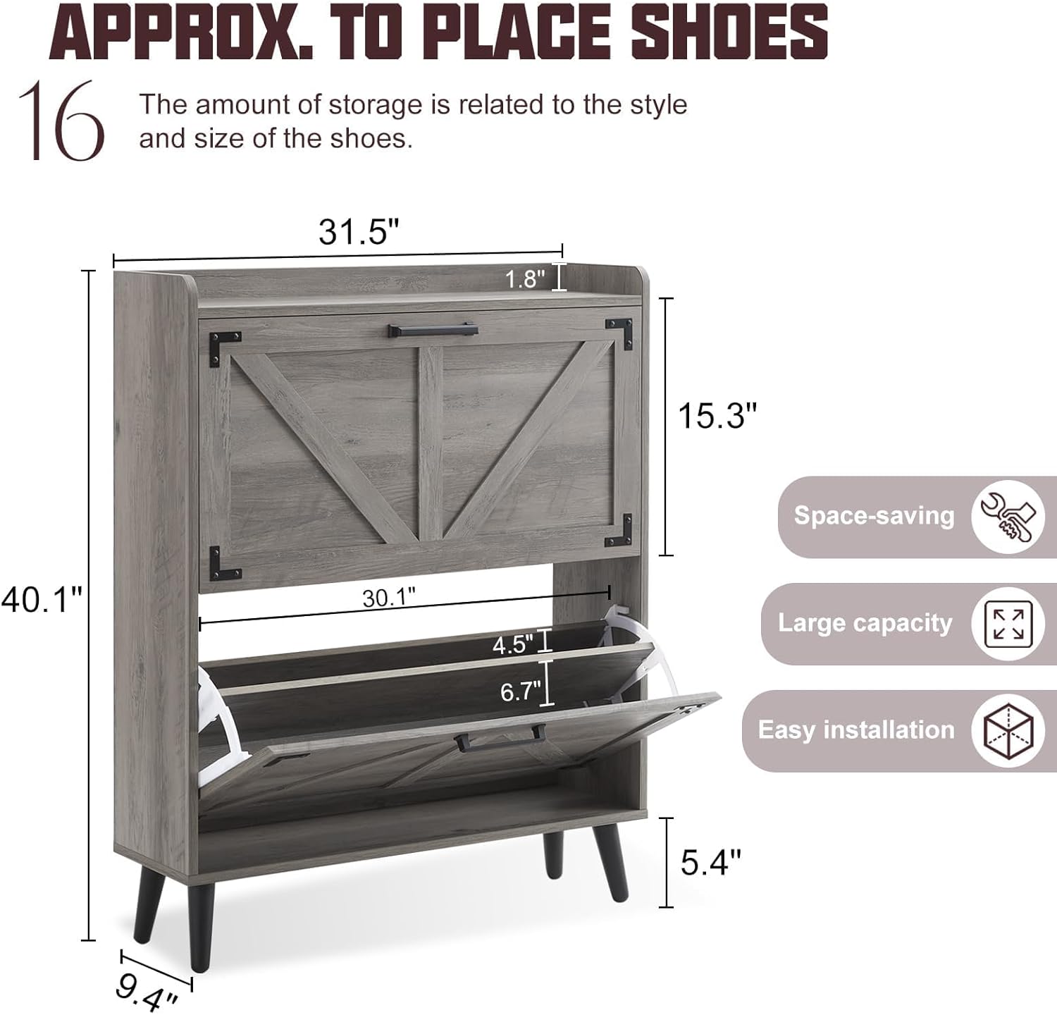 Shoe Storage Cabinet with 2 Flip Drawers, Farmhouse Hidden Shoe Organizer, Narrow Slim Shoe Rack Cabinet for Entryway Hallway,Washed Gray