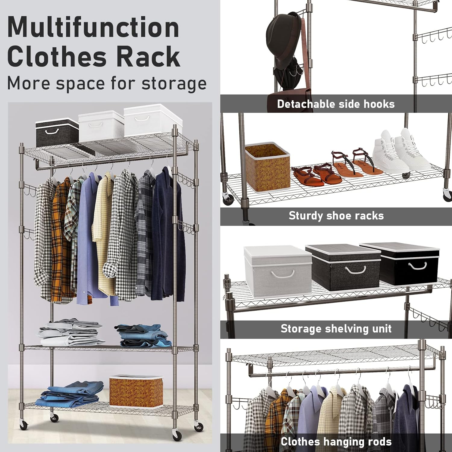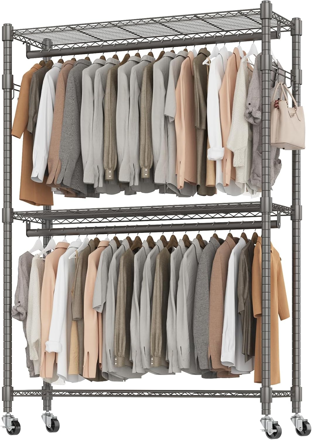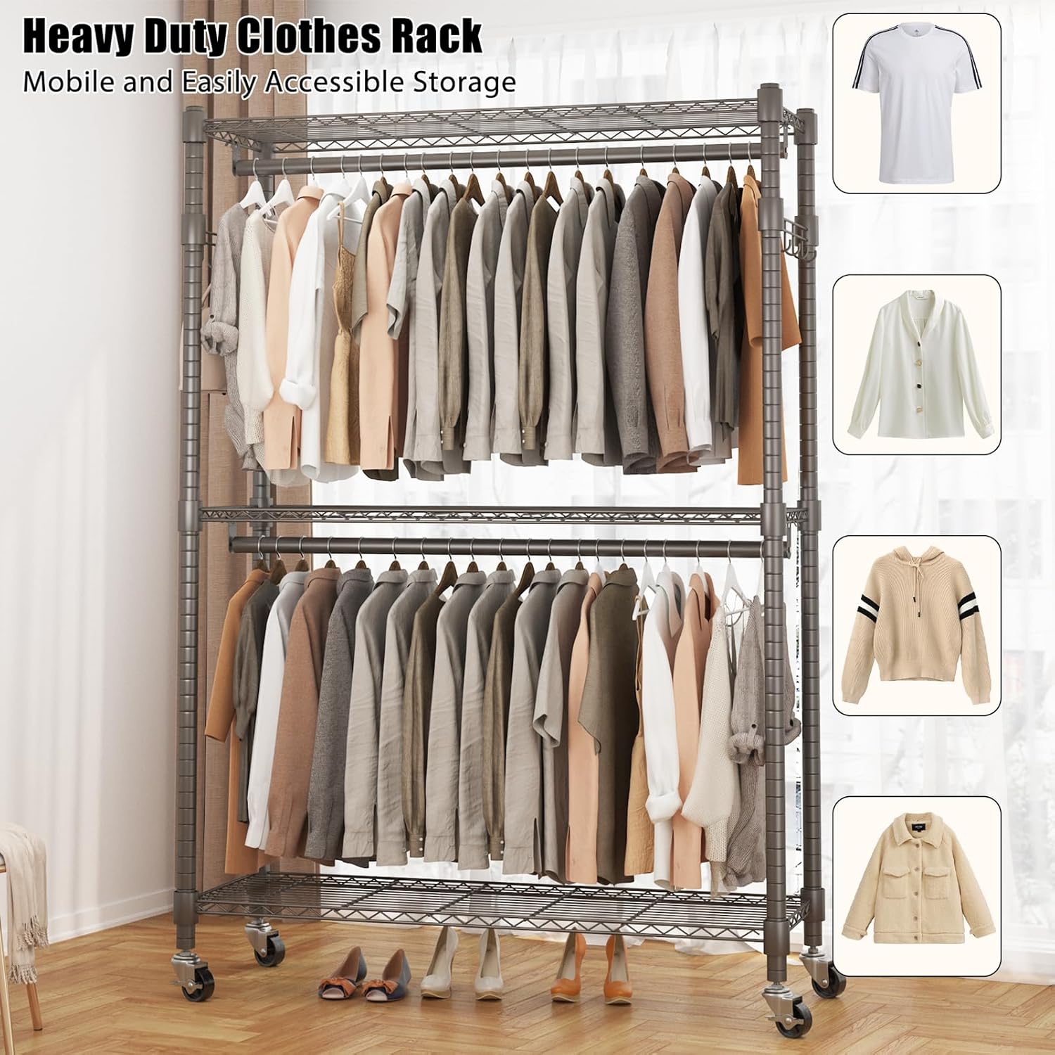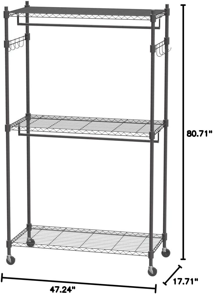 BATHWA Heavy Duty Garment Rack on Wheels, Rolling Clothes Racks for Hanging Storage, Simple Sturdy Metal Wardrobe Closet with Double Rods, 8 Side Hangers, 3 Shelves, Black