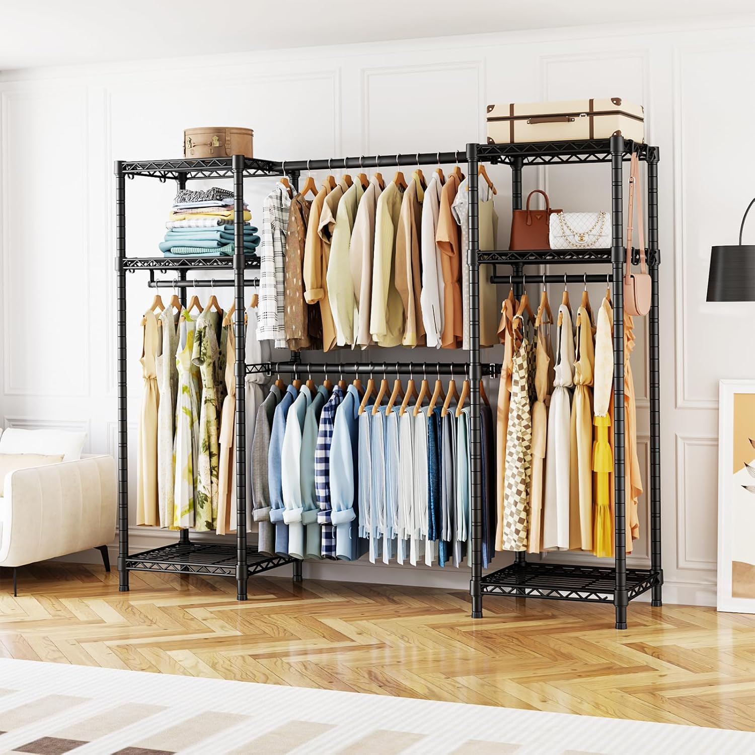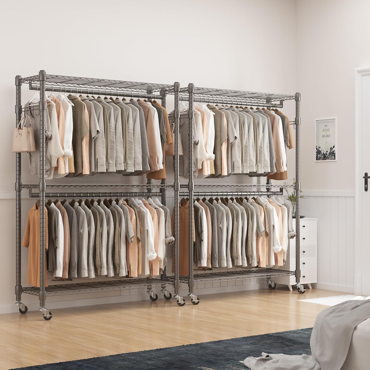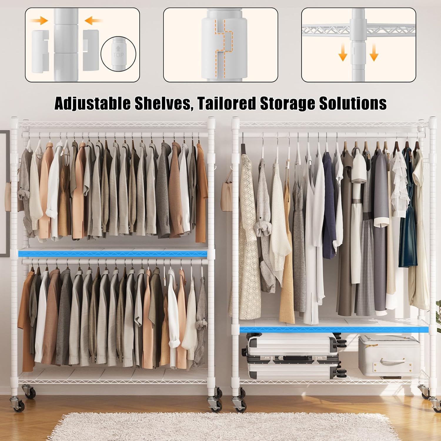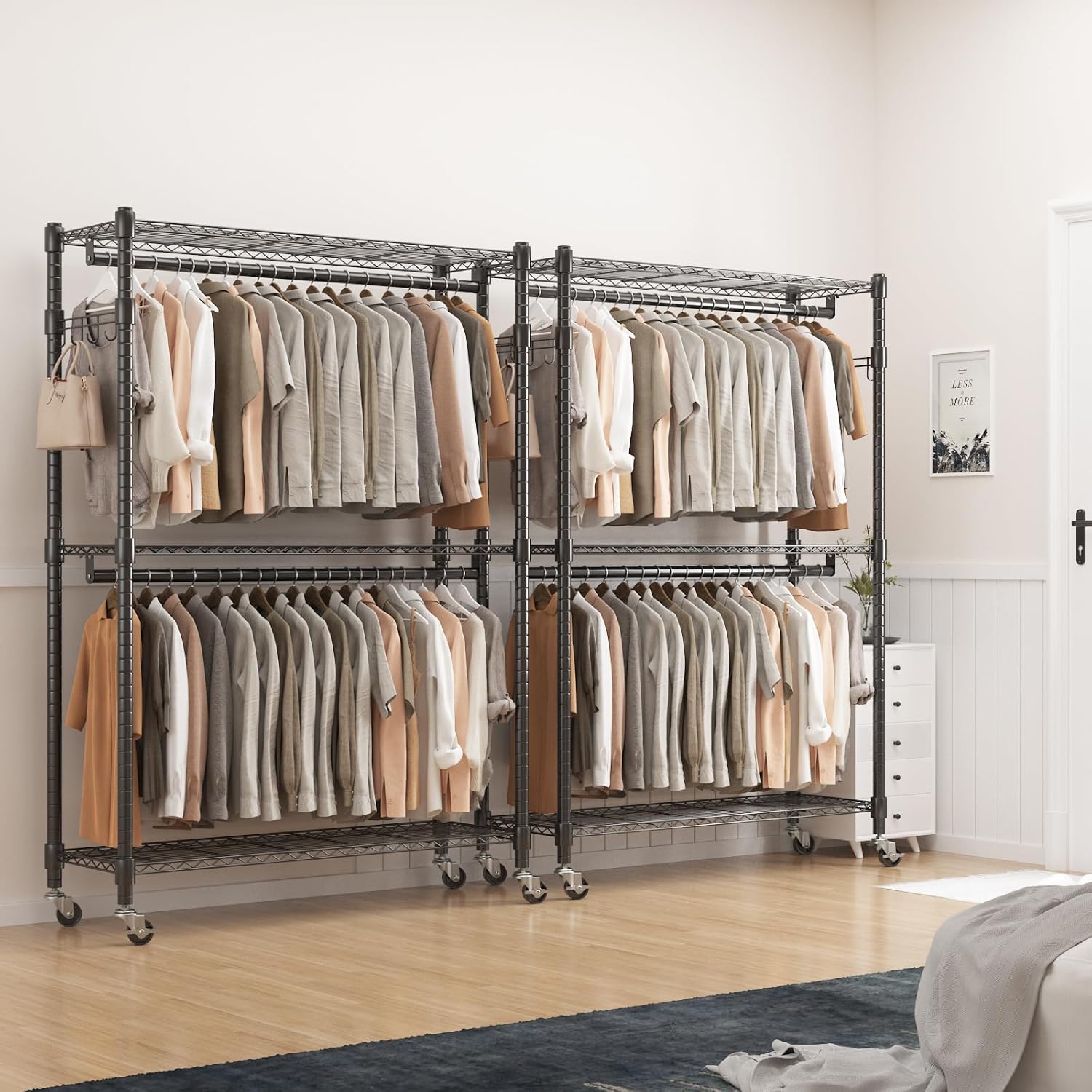 BATHWA Heavy Duty Garment Rack on Wheels, Rolling Clothes Racks for Hanging Storage, Simple Sturdy Metal Wardrobe Closet with Double Rods, 8 Side Hangers, 3 Shelves, Black