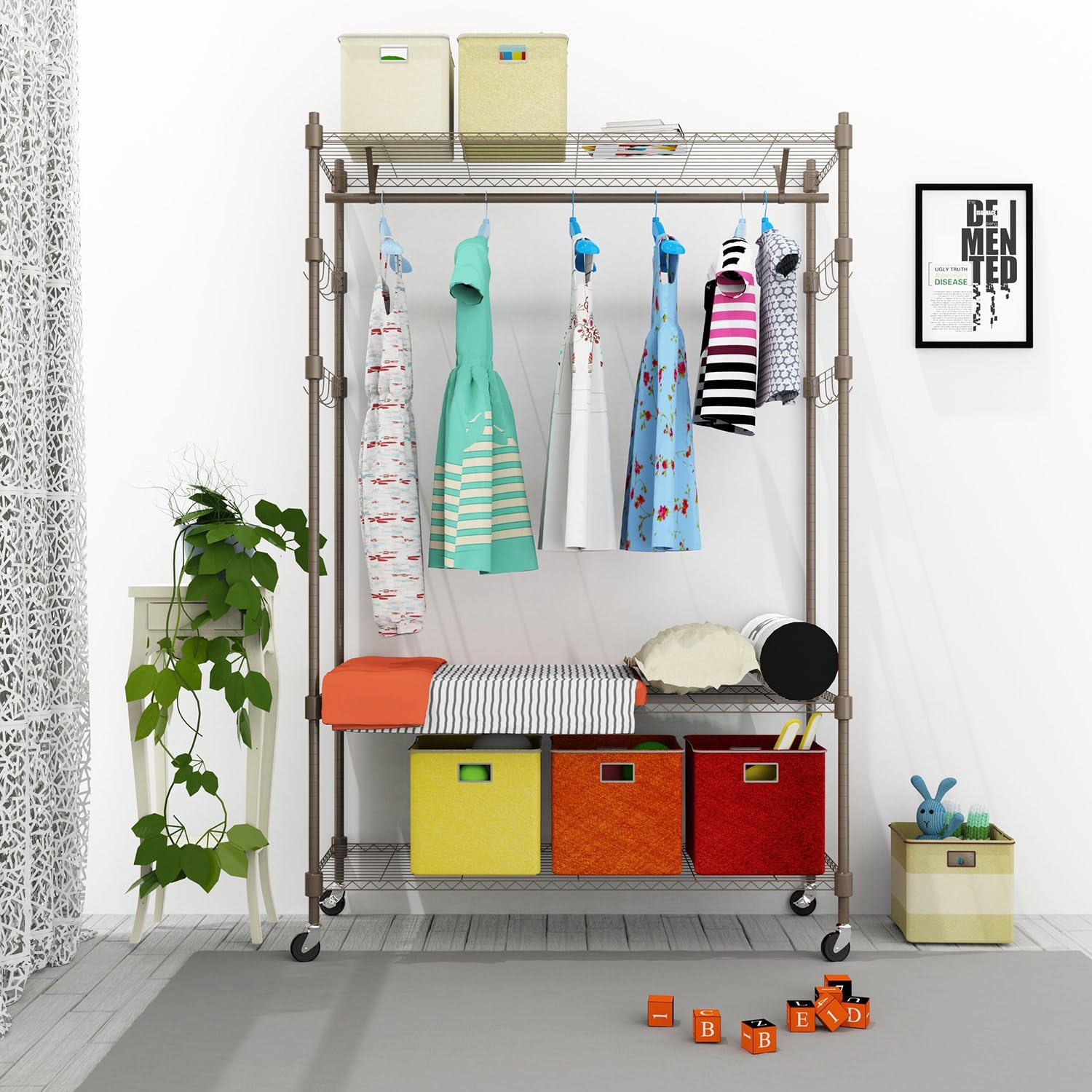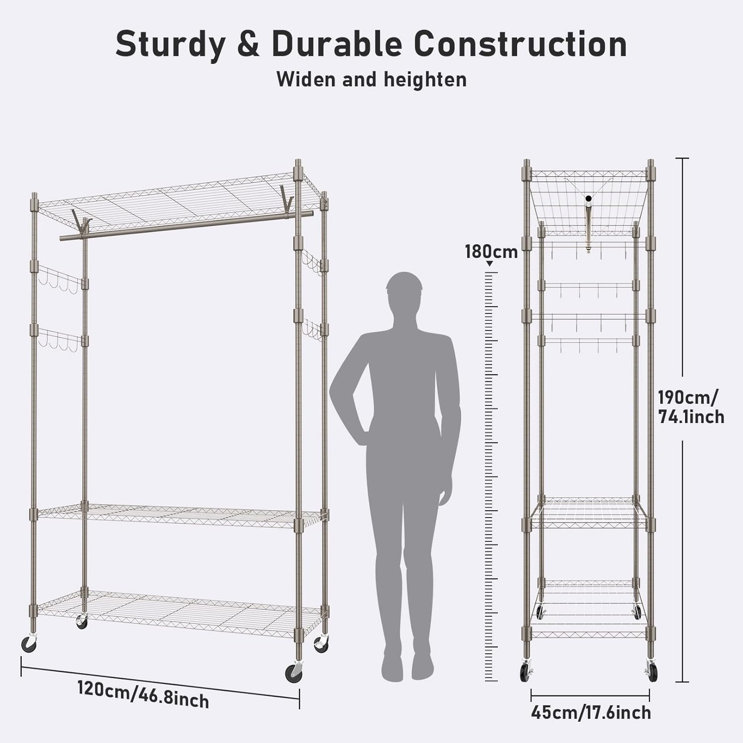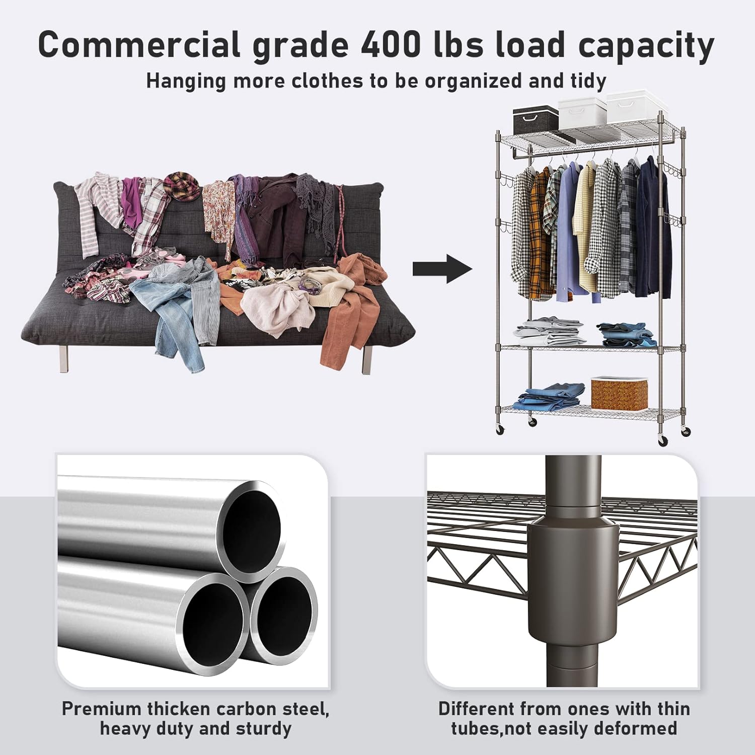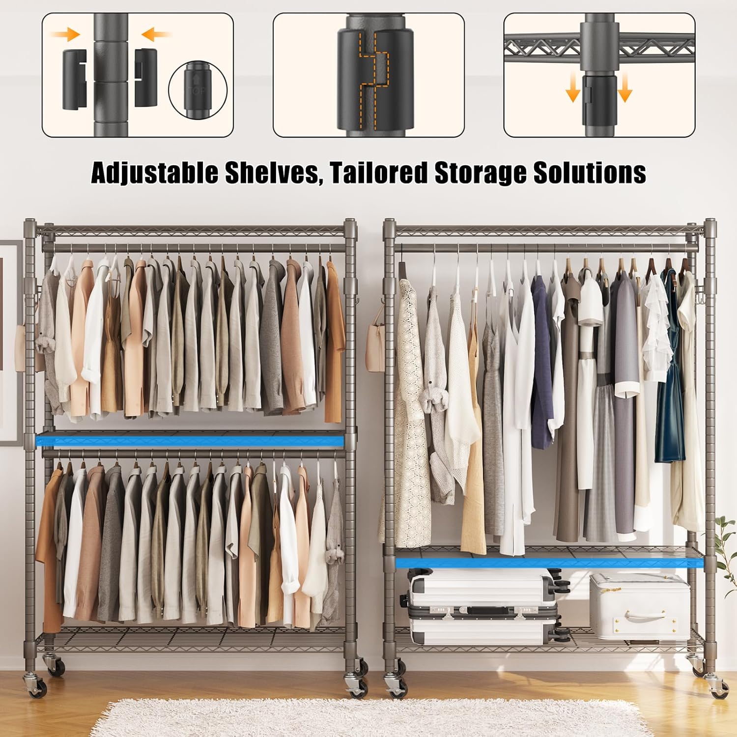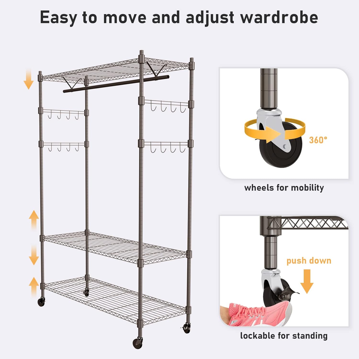 BATHWA Heavy Duty Garment Rack on Wheels, Rolling Clothes Racks for hanging clothes, Simple Sturdy Wardrobe Rack with Double Hanging Rods, 8 Side Hangers, Gray