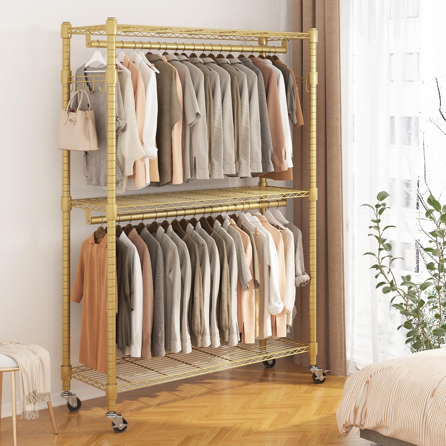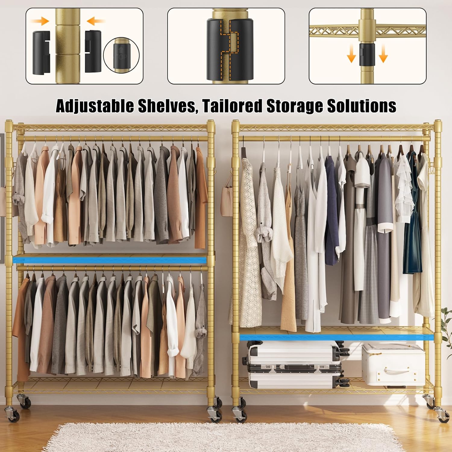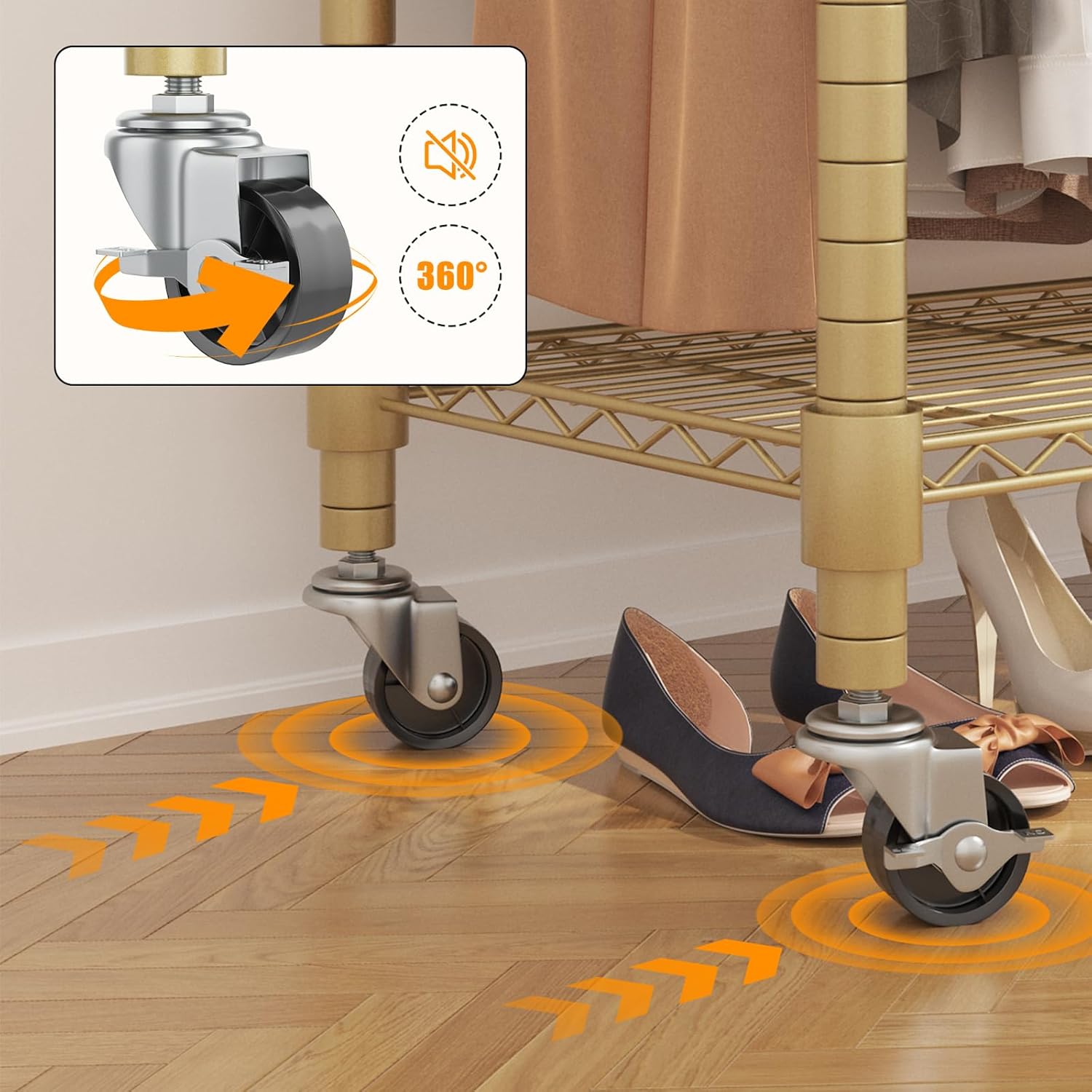 BATHWA Heavy Duty Garment Rack on Wheels, Rolling Clothes Racks for hanging clothes, Modern Closet Wardrobe Clothing Rack with 8 Side Hangers, Gold