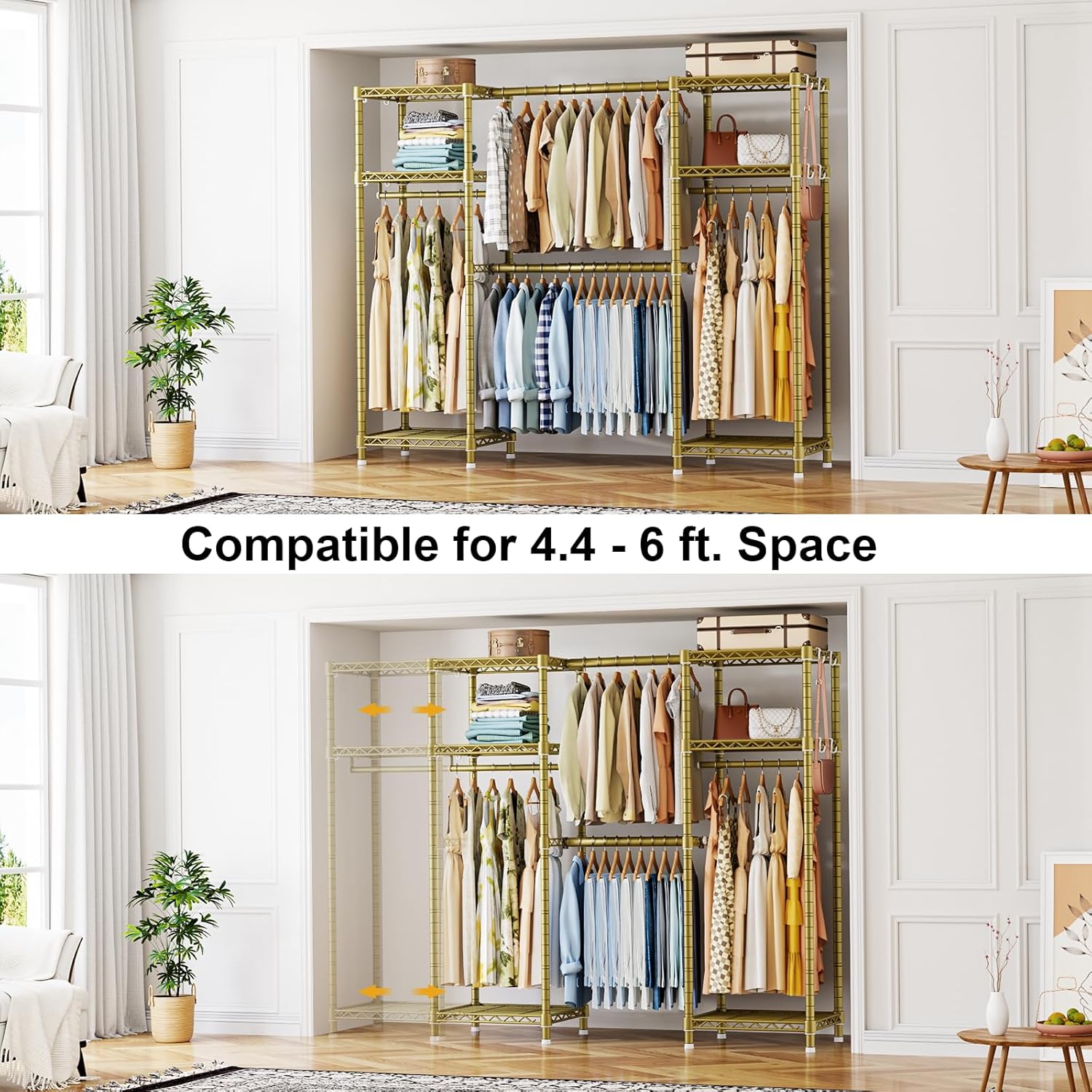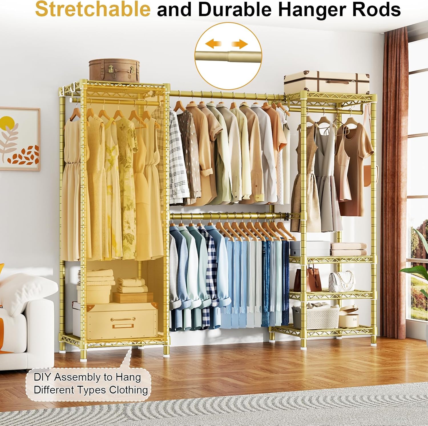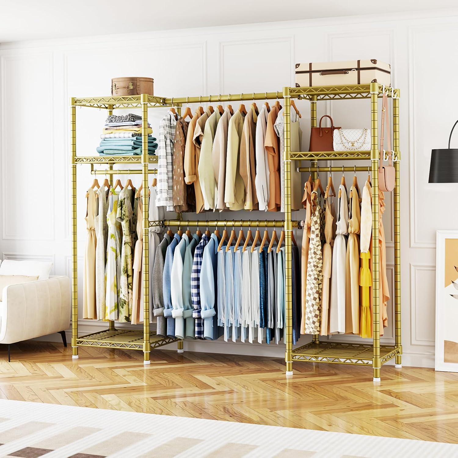 BATHWA Heavy Duty Garment Rack on Wheels, Rolling Clothes Racks for hanging clothes, Modern Closet Wardrobe Clothing Rack with 8 Side Hangers, Gold