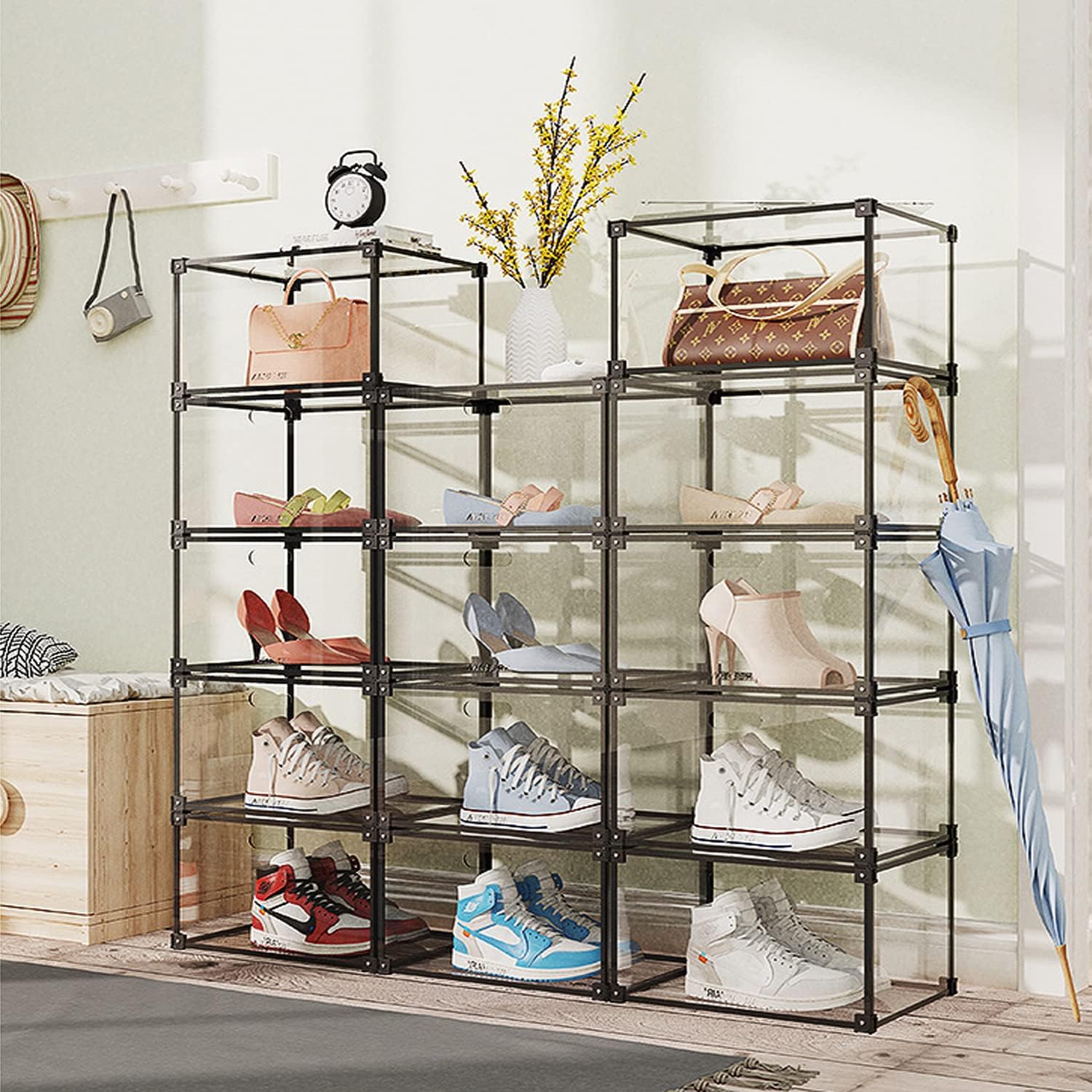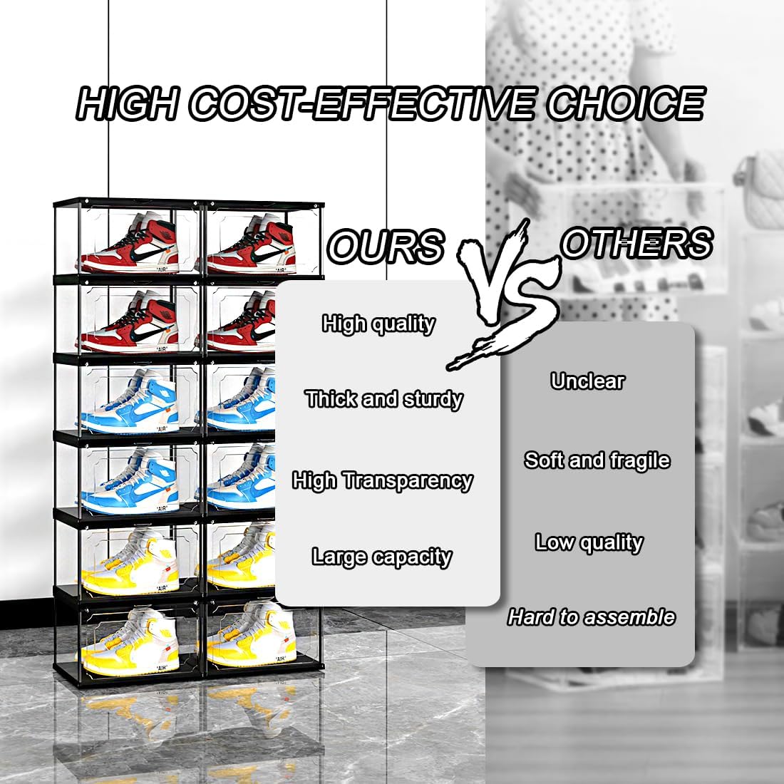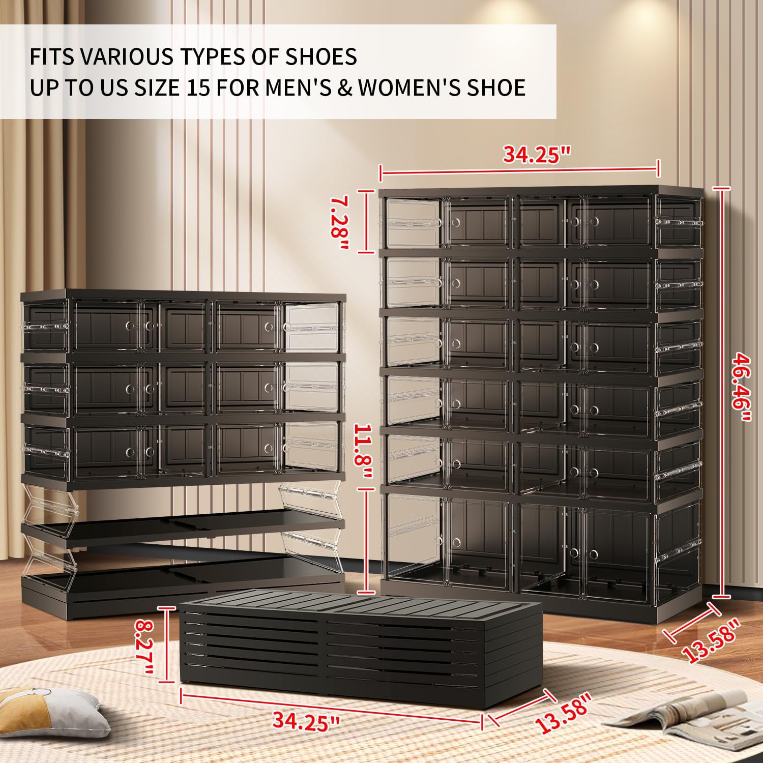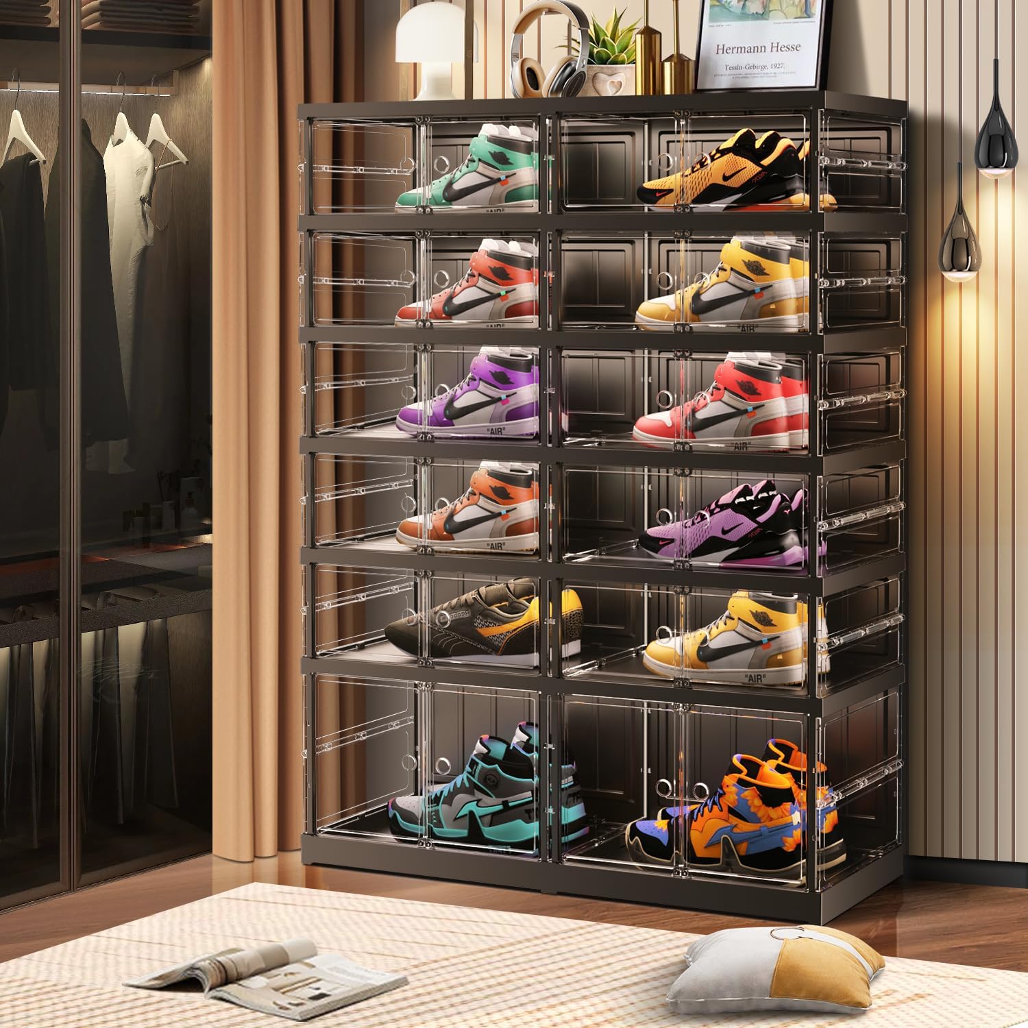 6-Tier Foldable Shoe Rack for Closet Entryway 12-24Pairs,Stackable Clear Shoe Storage Boxes Organizer with Door Plastic Shoe Cabinet Bins with Lids Shoes Shelf Easy Assembly Large Black