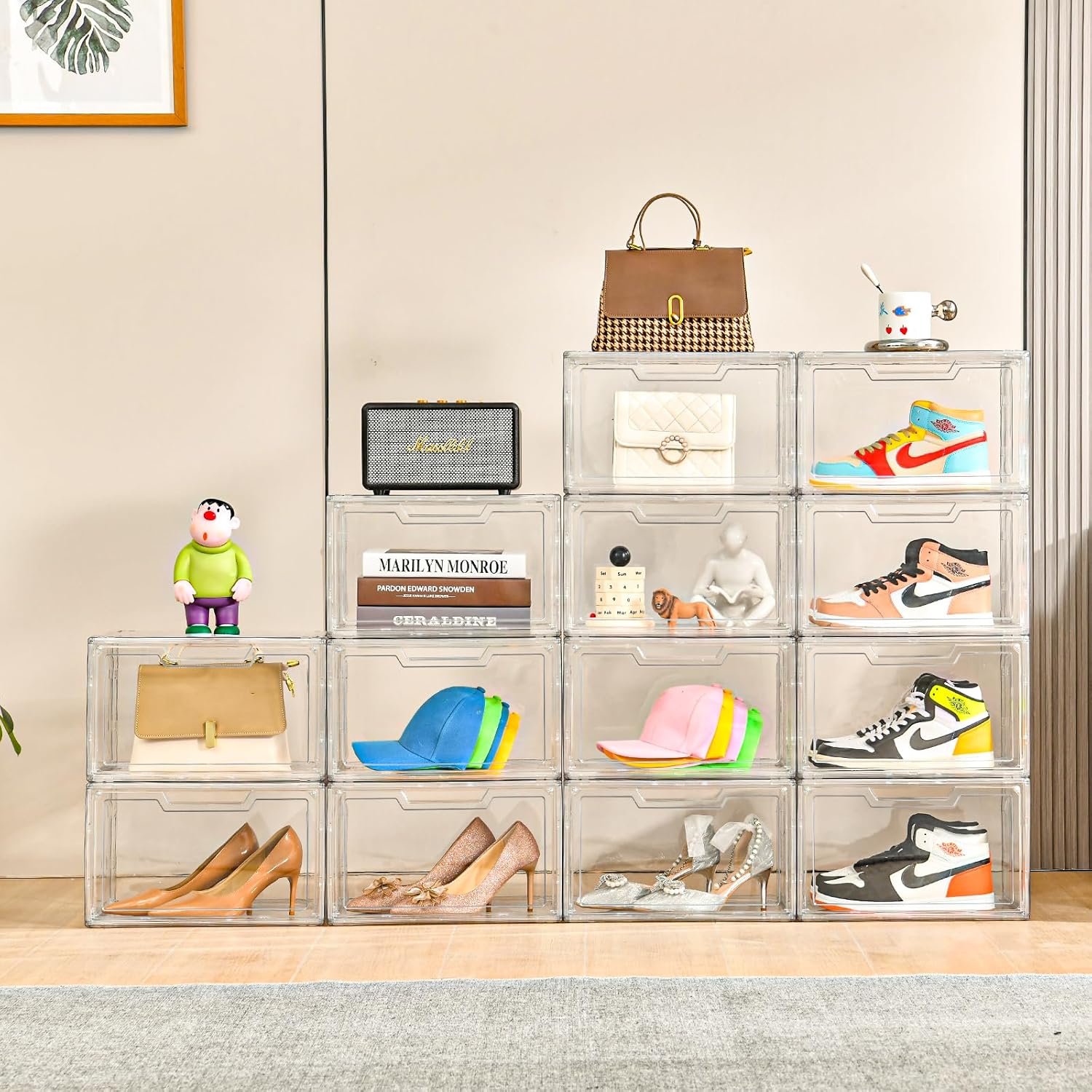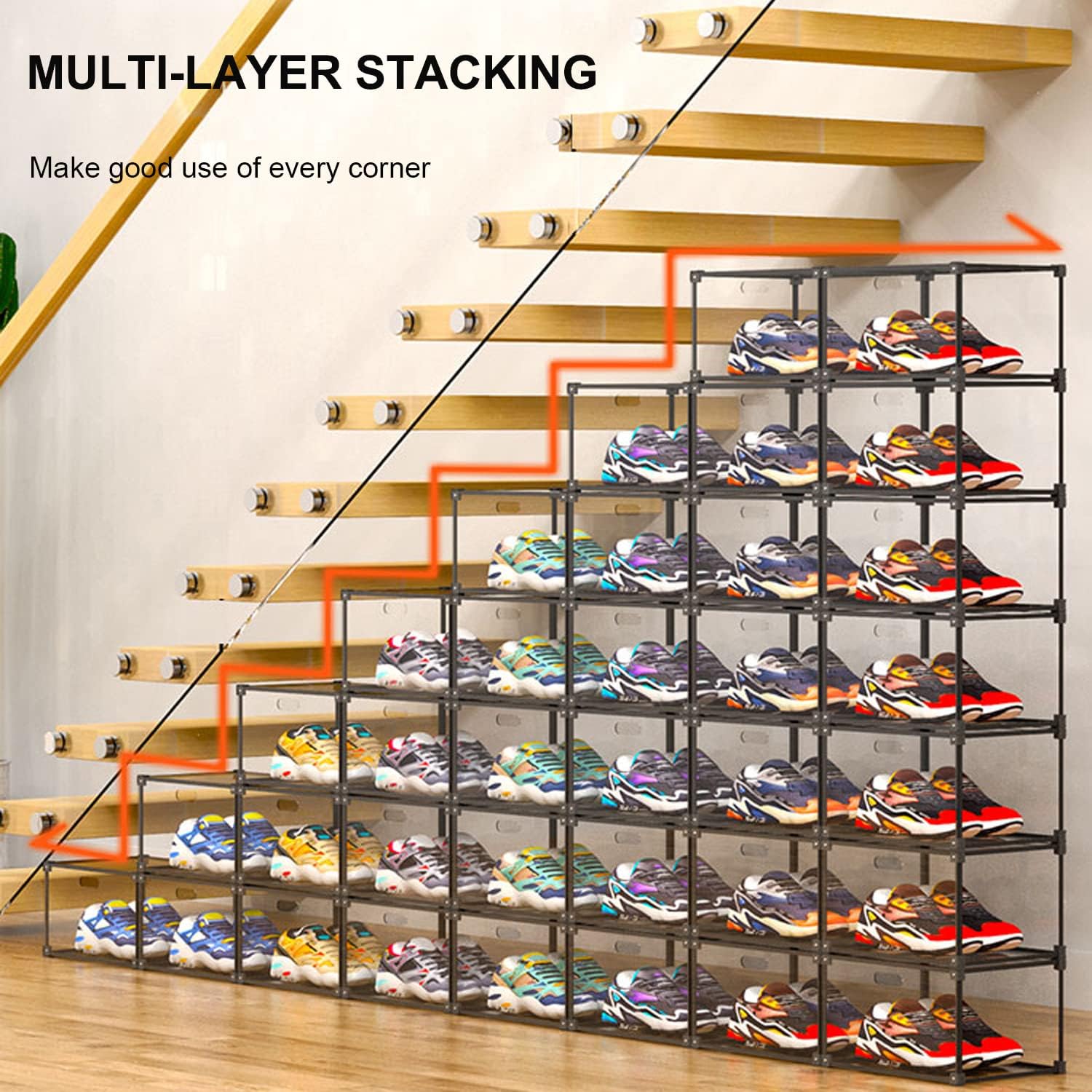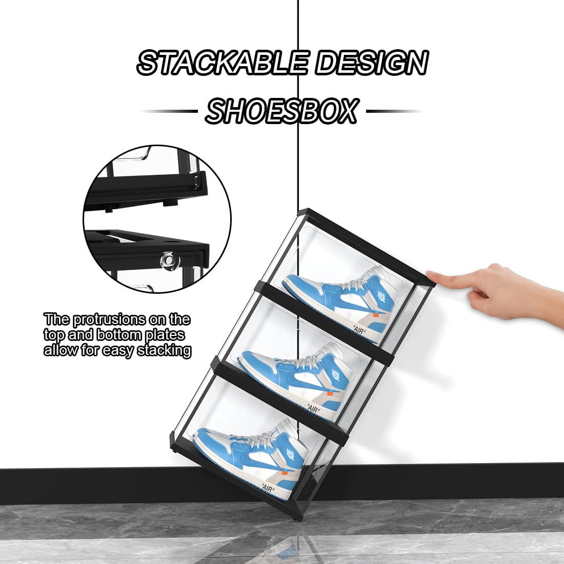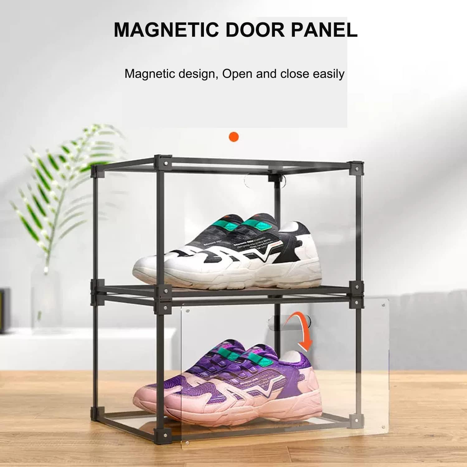 6-Tier Foldable Shoe Rack for Closet Entryway 12-24Pairs,Stackable Clear Shoe Storage Boxes Organizer with Door Plastic Shoe Cabinet Bins with Lids Shoes Shelf Easy Assembly Large Black