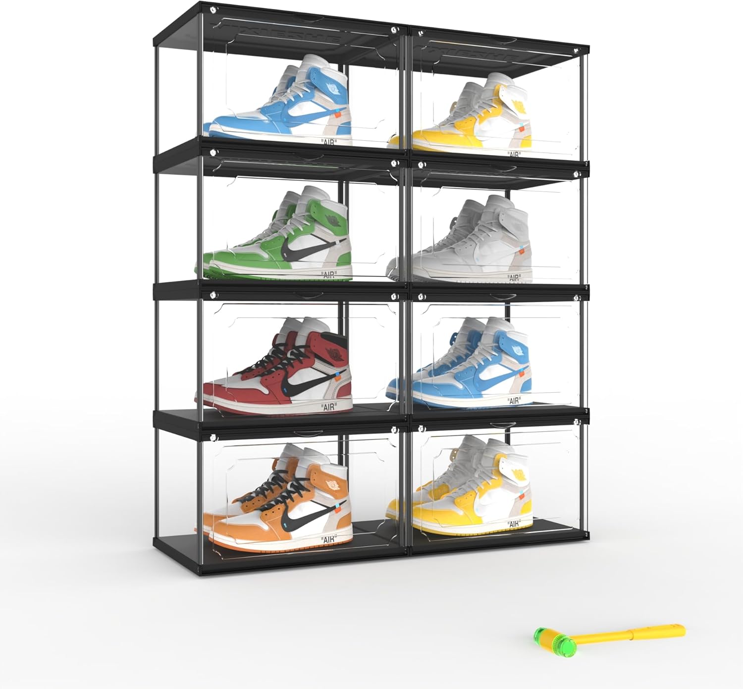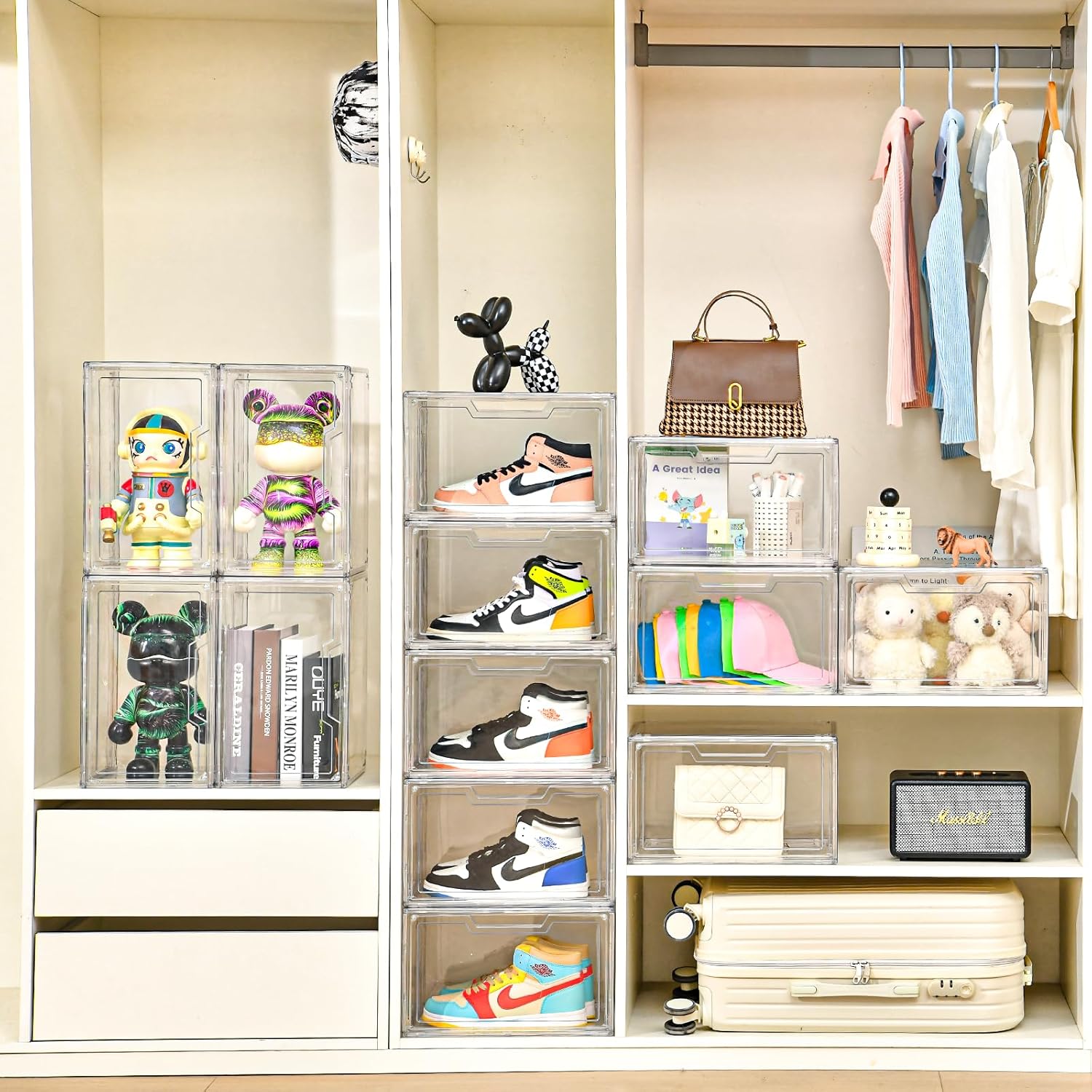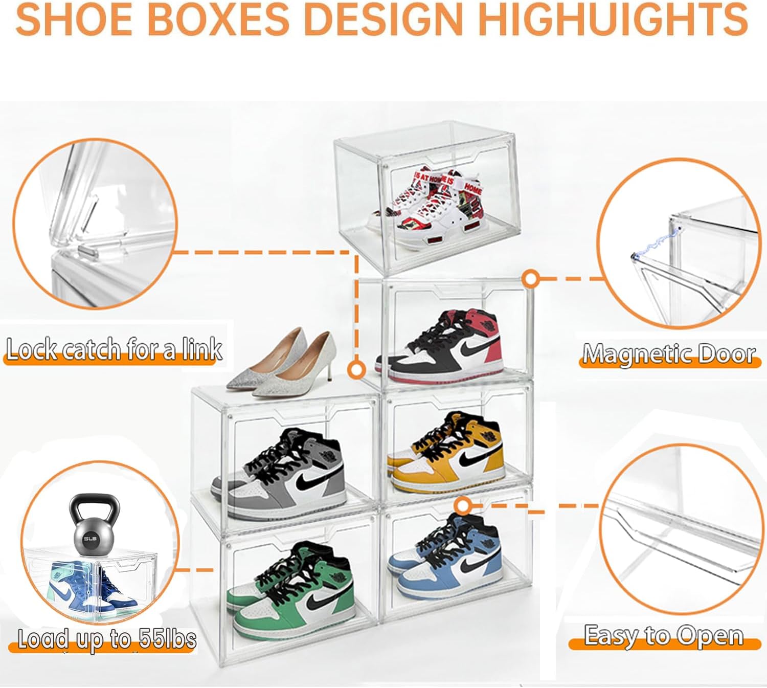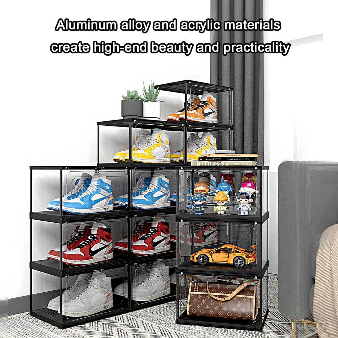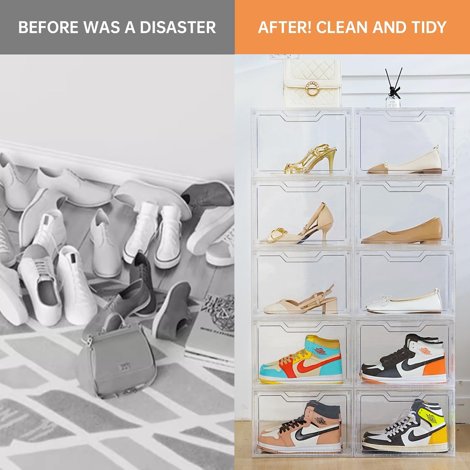6-Tier Foldable Shoe Rack for Closet Entryway 12-24Pairs,Stackable Clear Shoe Storage Boxes Organizer with Door Plastic Shoe Cabinet Bins with Lids Shoes Shelf Easy Assembly Large Black