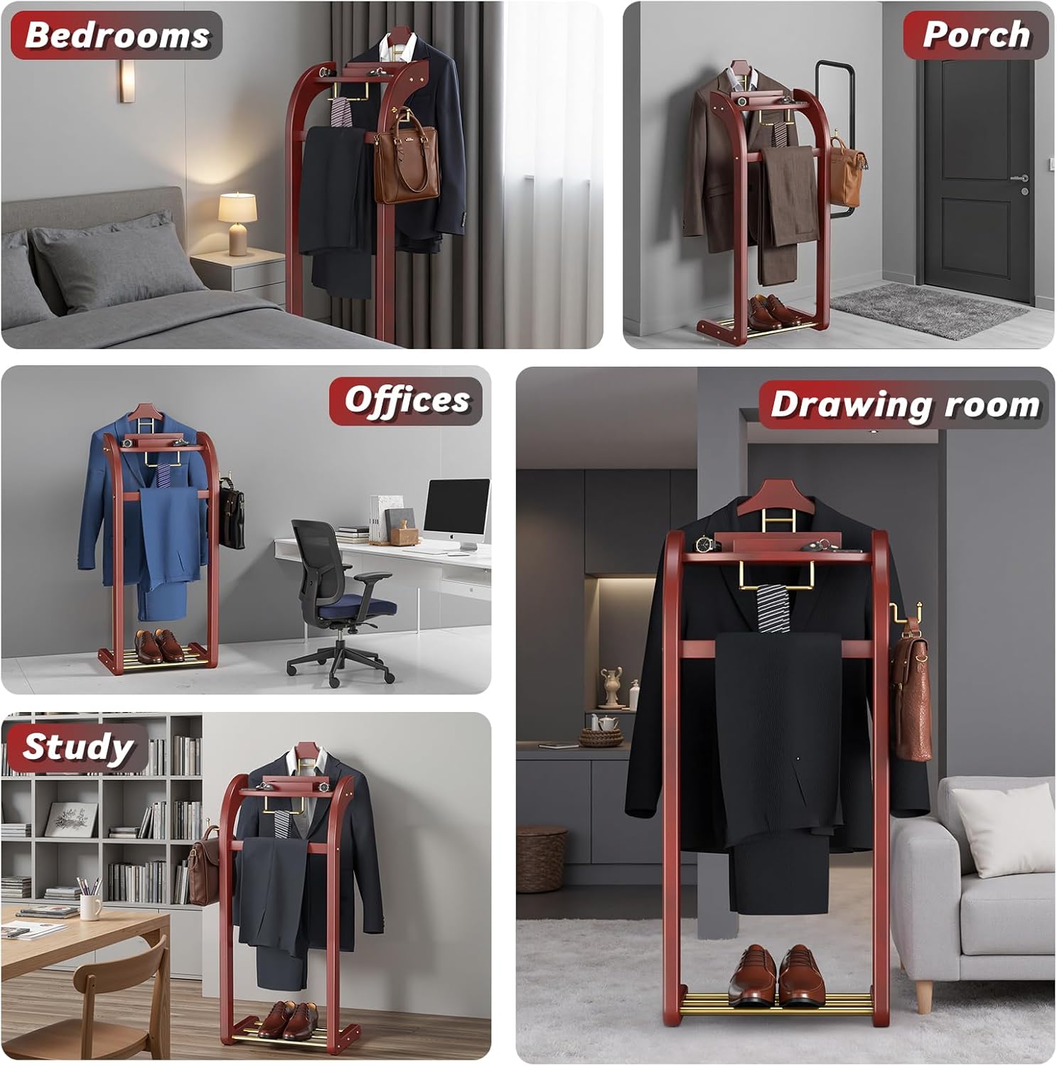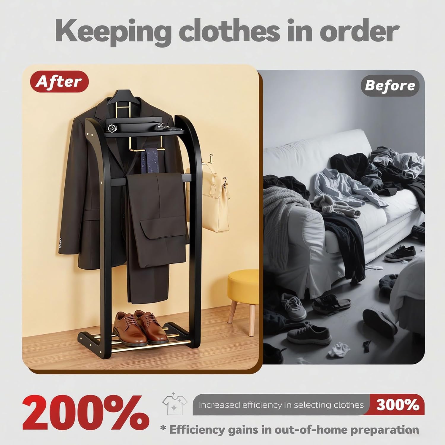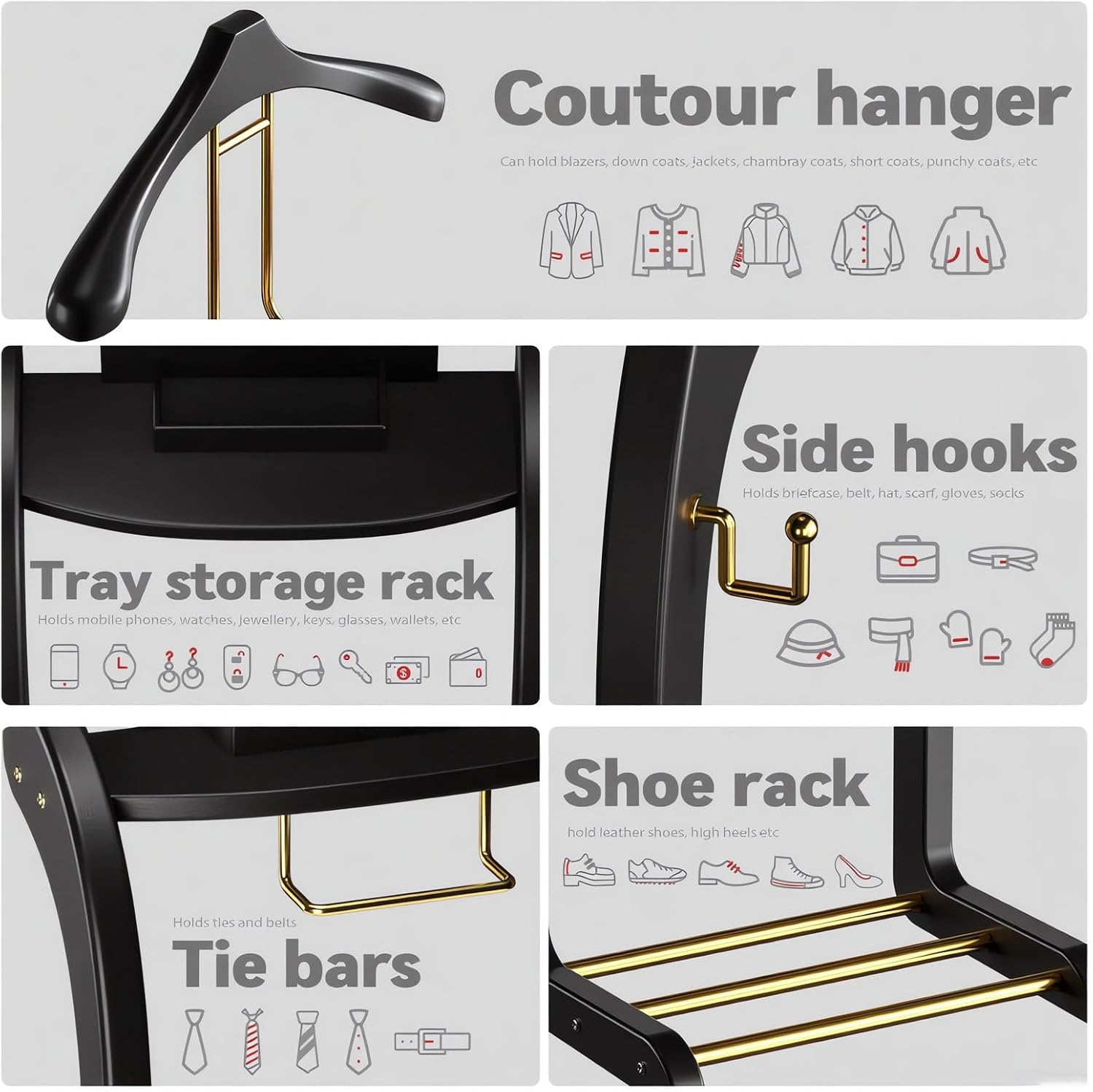Suit Valet Stand for Men, Wood Mens Valet Stand with Base, Contour Hanger, Tray, Trouser Bar and Tie Bar, Clothes Valet Stand for Bedroom Entryway Home Living Room Office (Black)