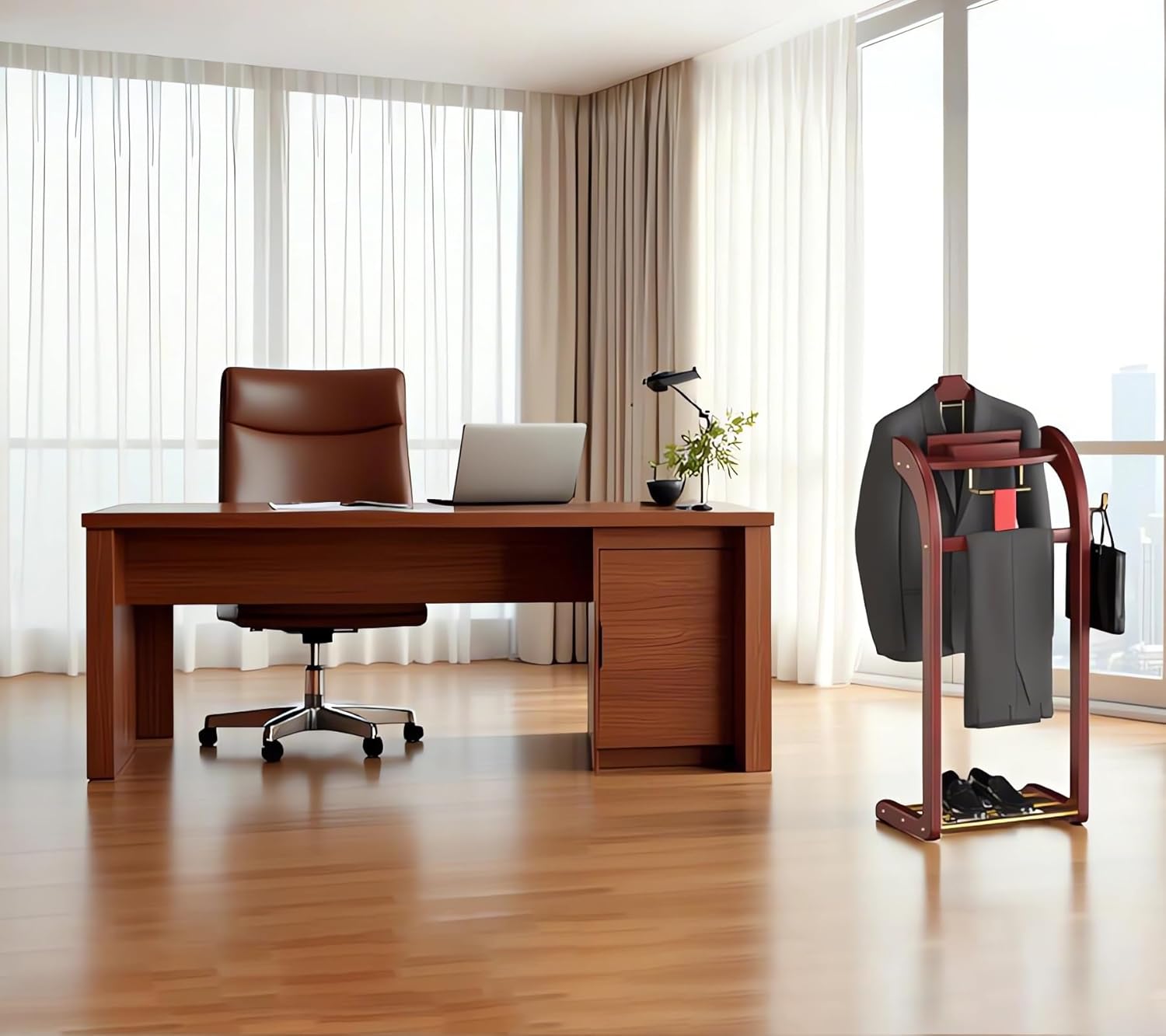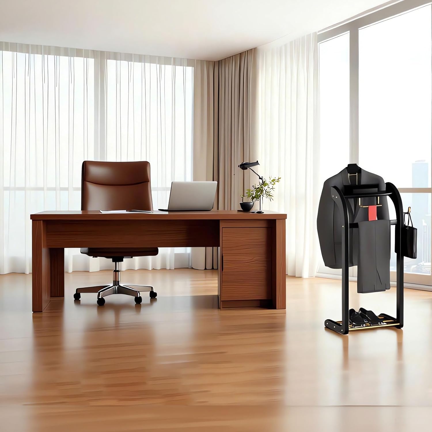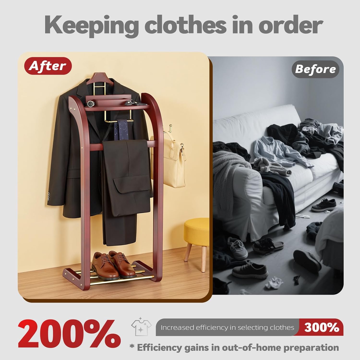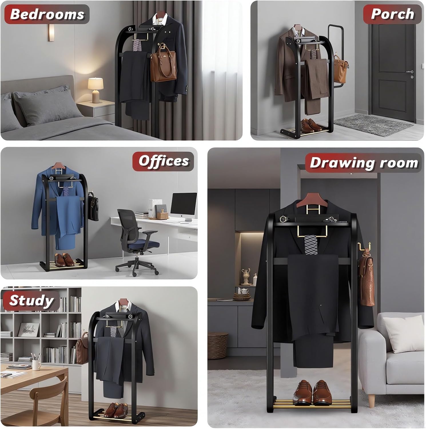 Suit Valet Stand for Men, Wood Mens Valet Stand with Base, Contour Hanger, Tray, Trouser Bar and Tie Bar, Clothes Valet Stand for Bedroom Entryway Home Living Room Office (Black)