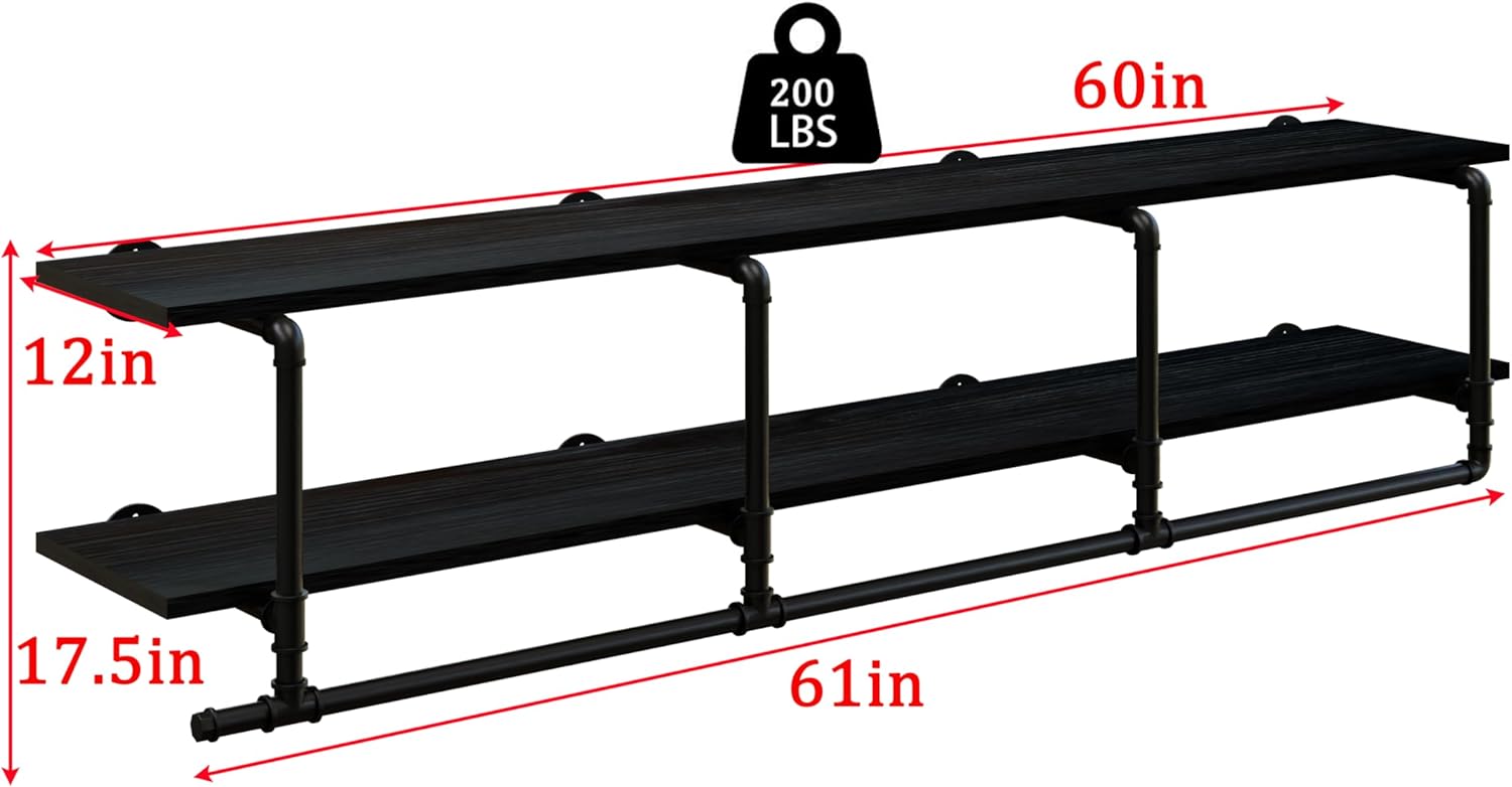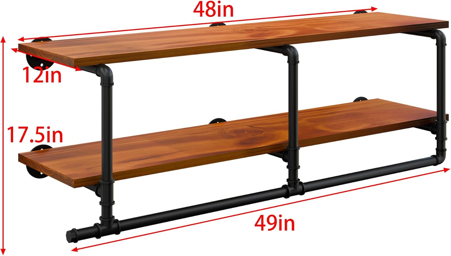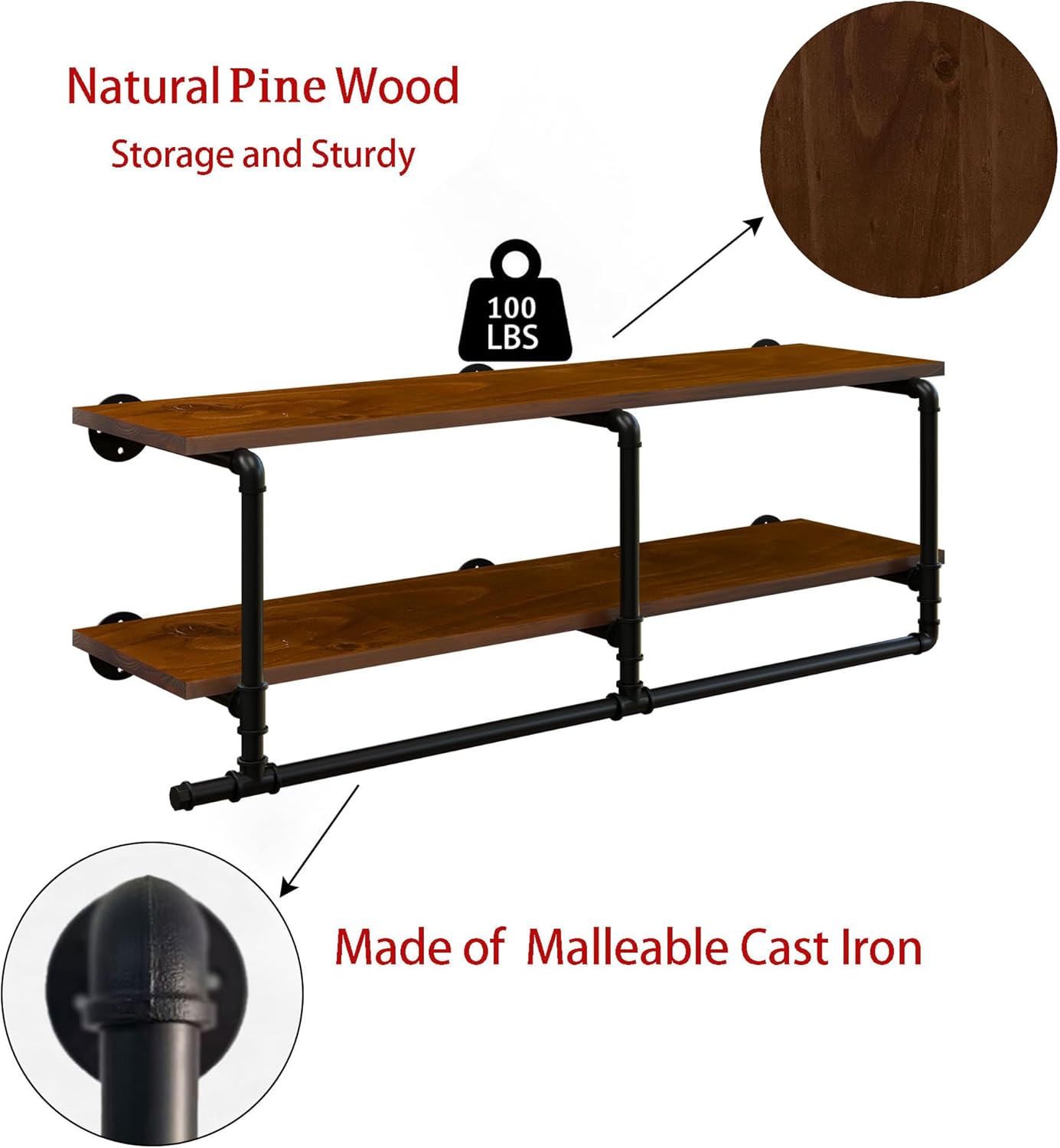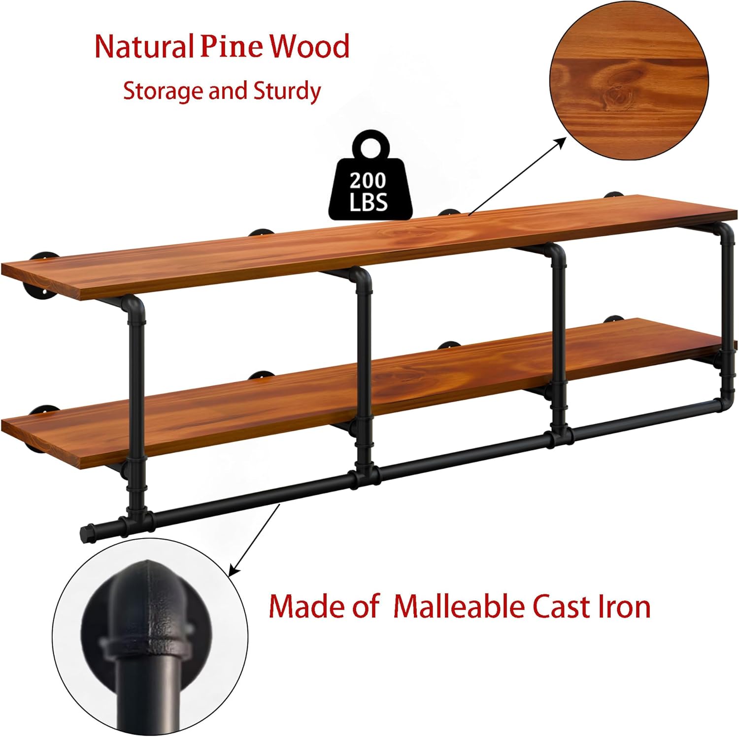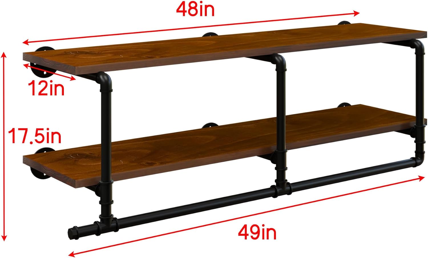 Wall Mounted Clothes Rack 12 Inch Deep, 60 Inch Heavy Duty Garment Rack with Real Brown Wood Shelf, Multi-Purpose Hanging Rod & Space-Saving Closet Storage Organizer