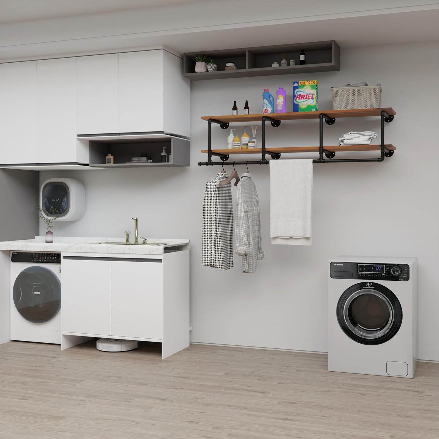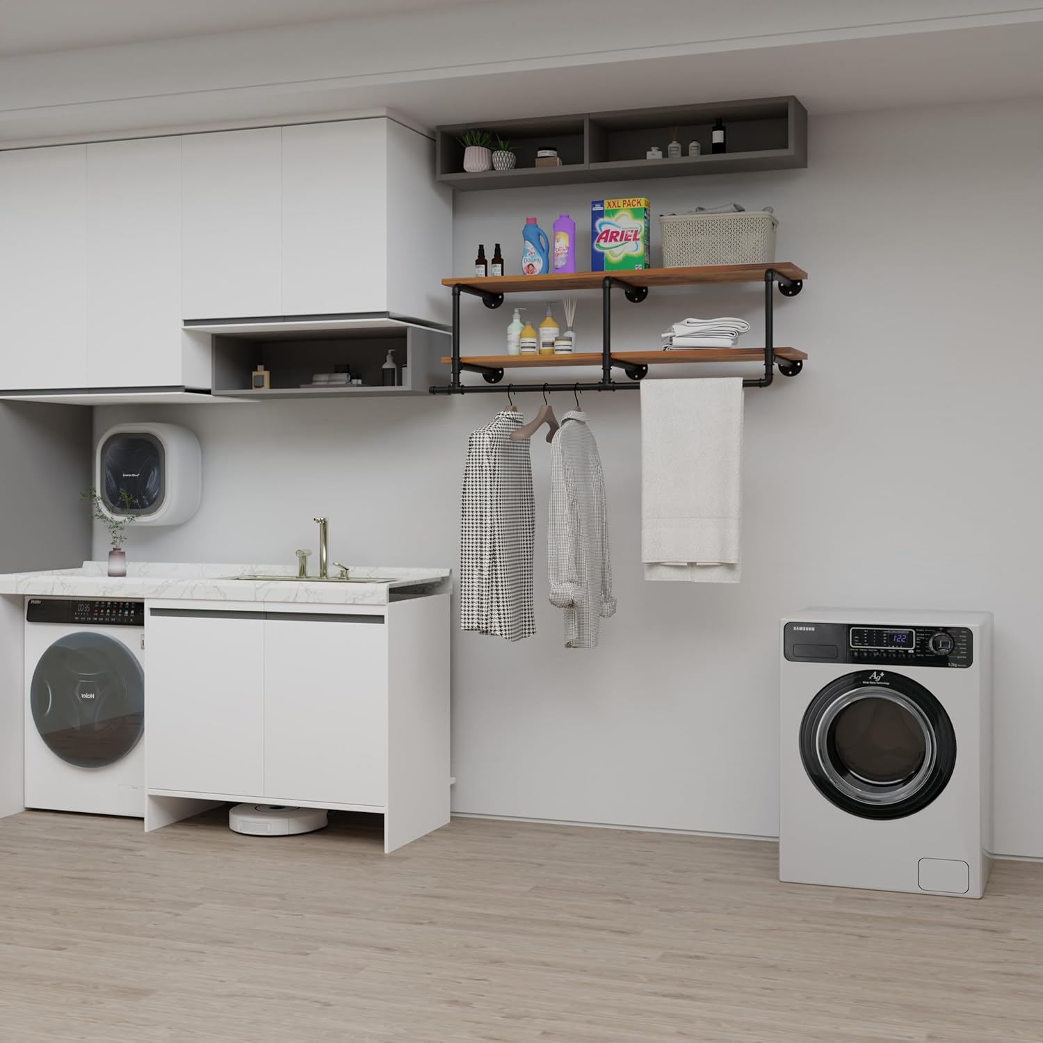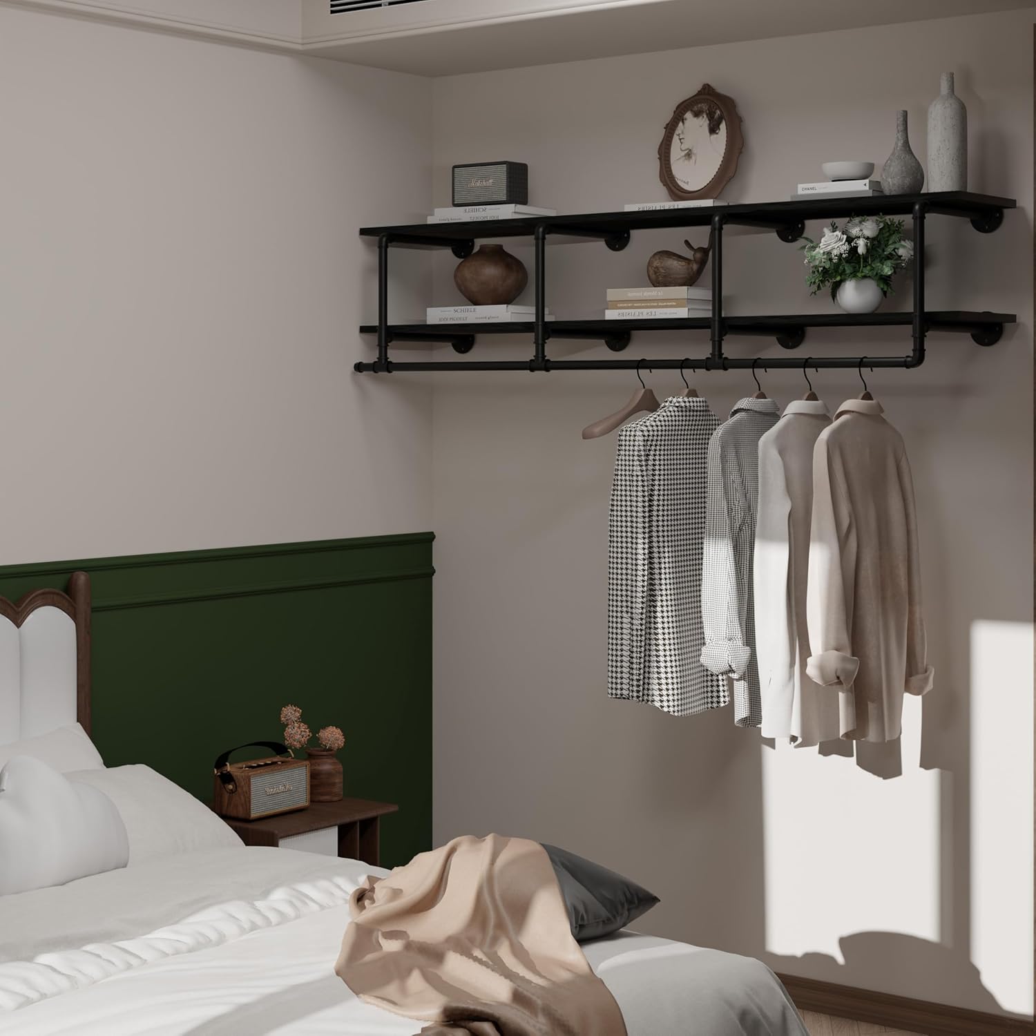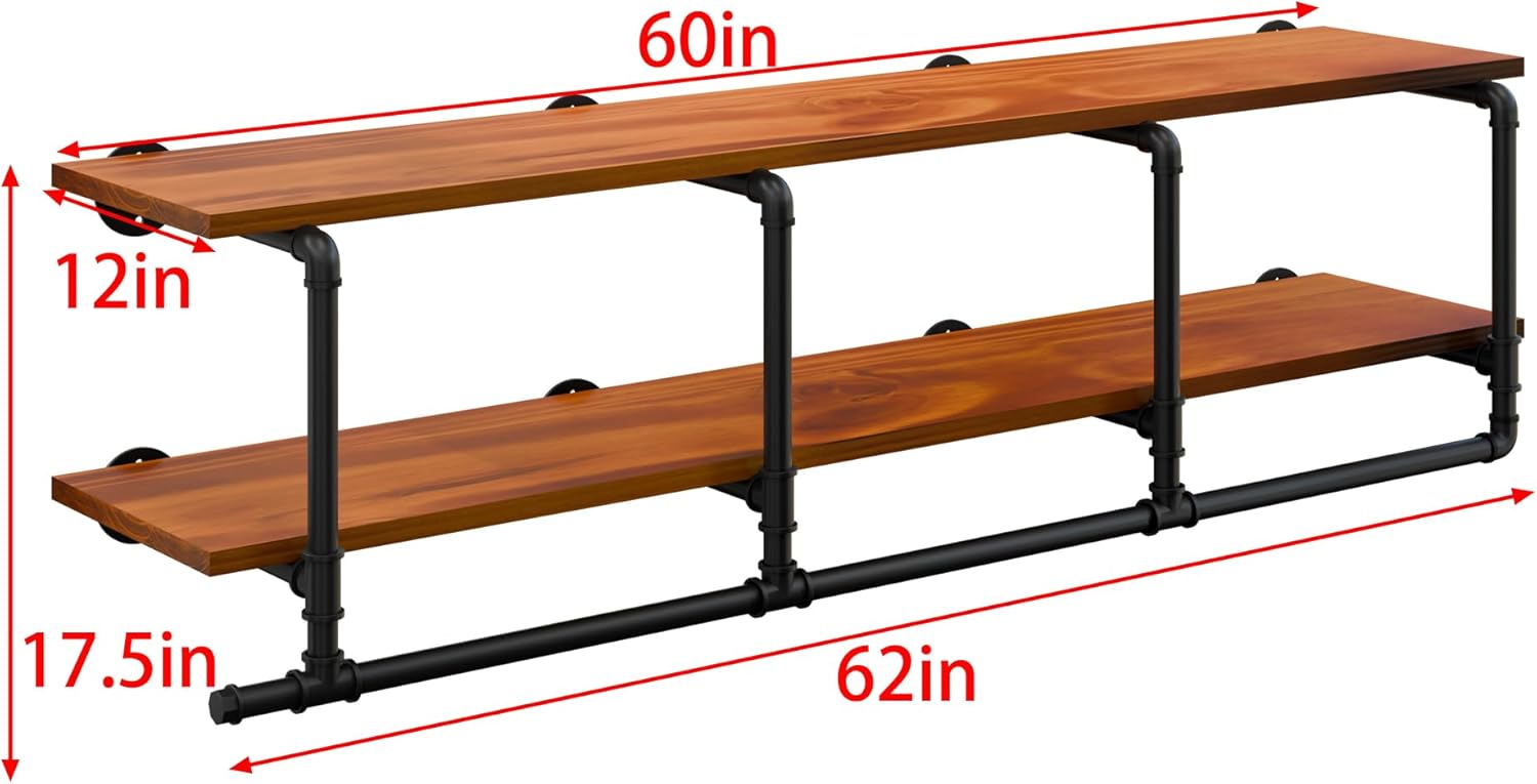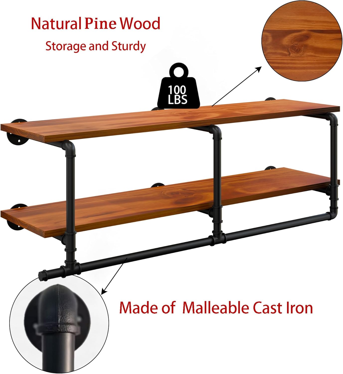 Wall Mounted Clothes Rack 12 Inch Deep, 60 Inch Heavy Duty Garment Rack with Real Brown Wood Shelf, Multi-Purpose Hanging Rod & Space-Saving Closet Storage Organizer