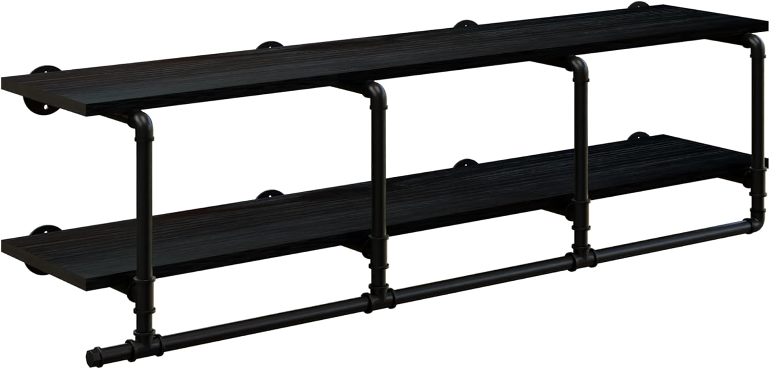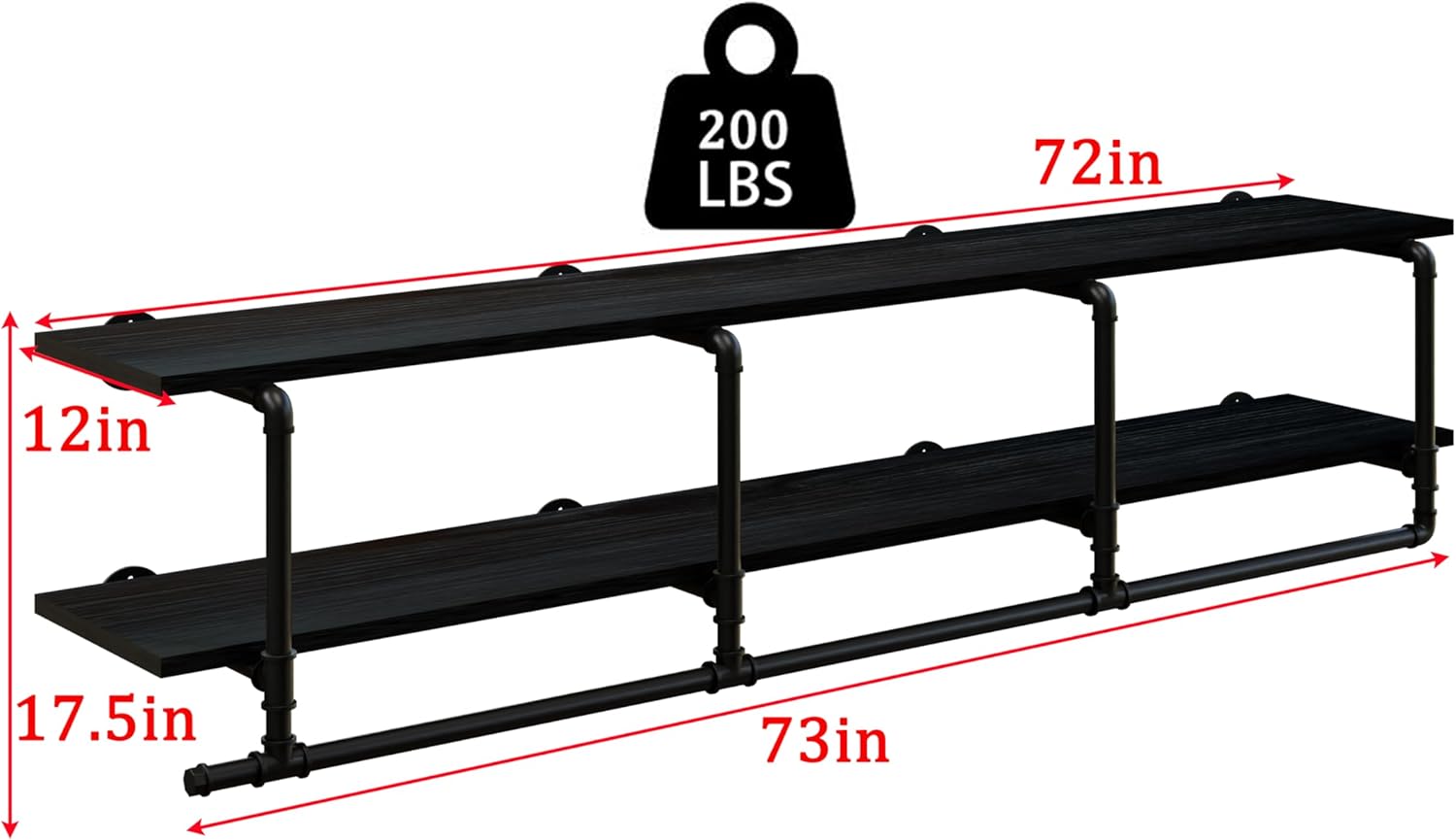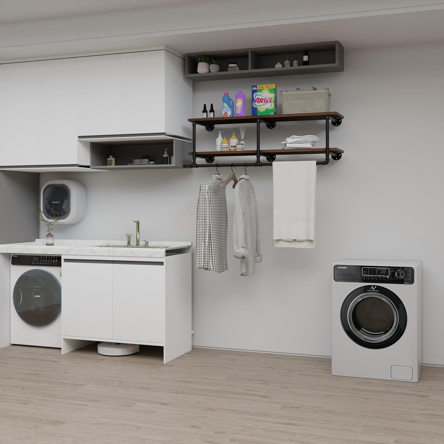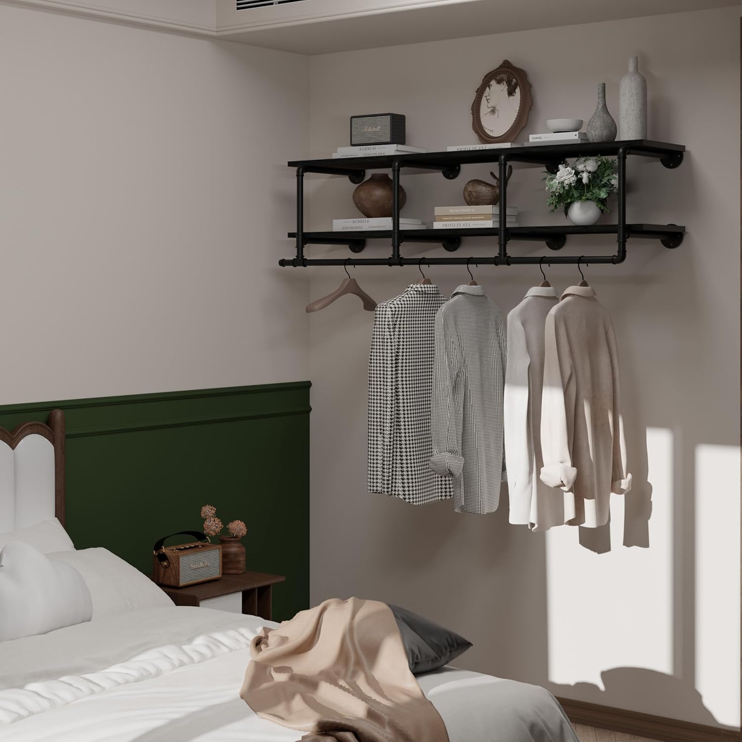 Wall Mounted Clothes Rack 12 Inch Deep, 60 Inch Heavy Duty Garment Rack with Real Brown Wood Shelf, Multi-Purpose Hanging Rod & Space-Saving Closet Storage Organizer