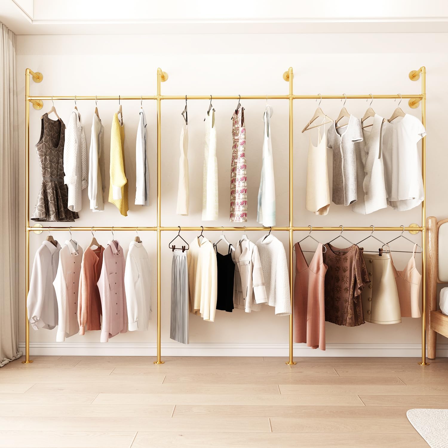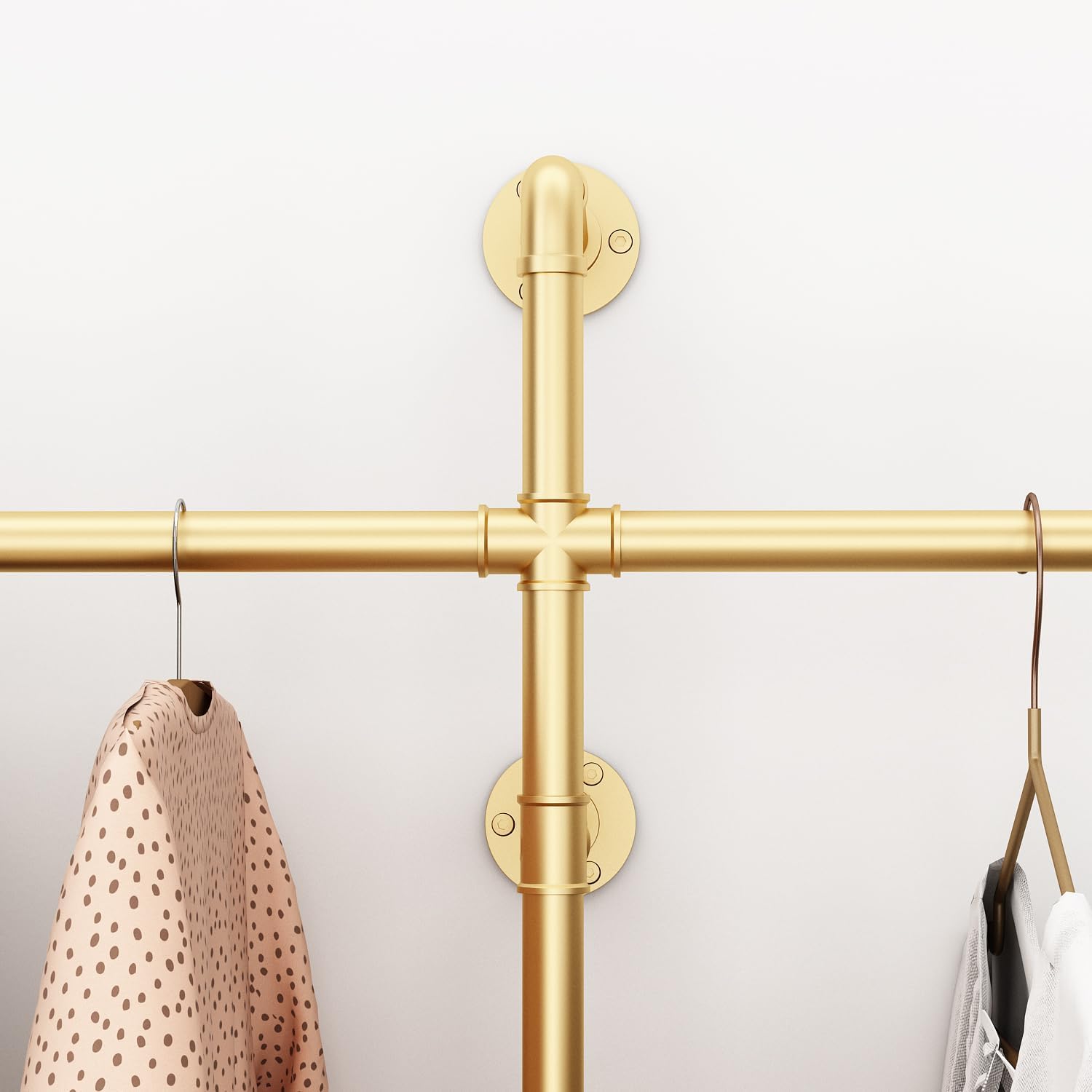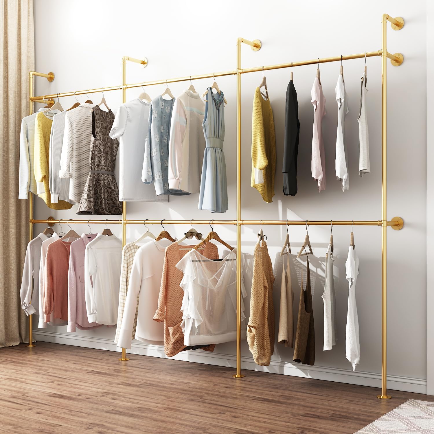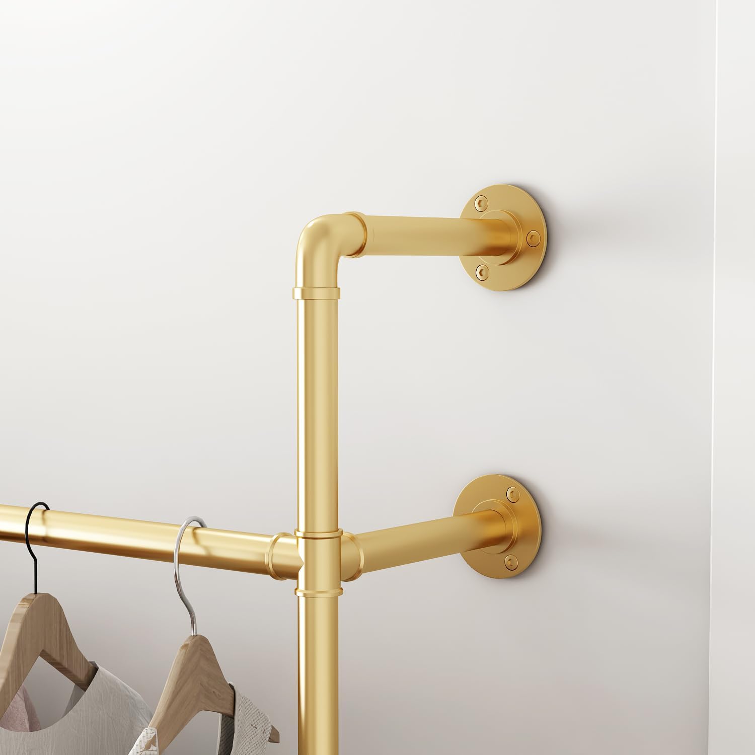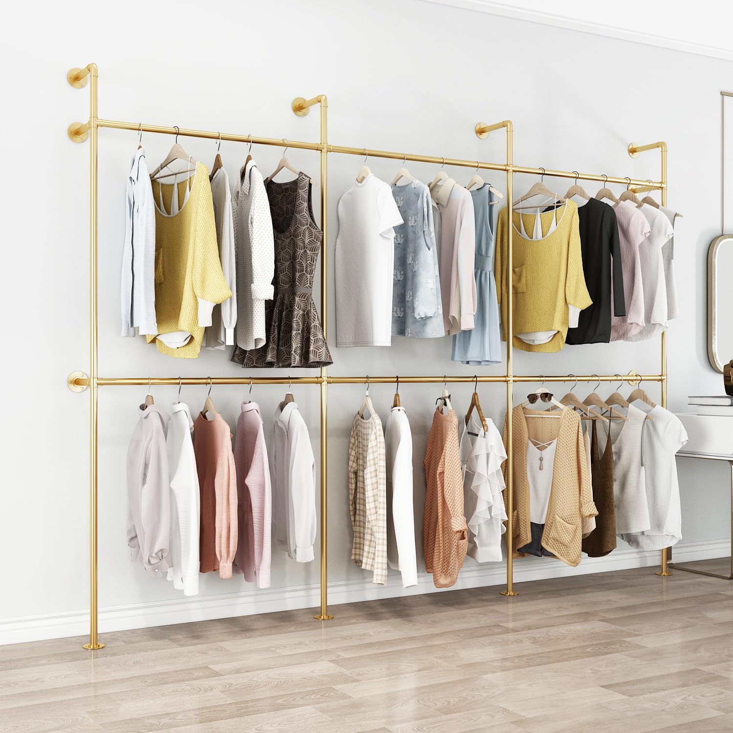 Industrial Pipe Clothing Rack, Heavy Duty Metal Clothes Rack with Double Rods for Hanging Clothes, Wall Mount Space-Saving Garment Display Rack (Three, Gold)