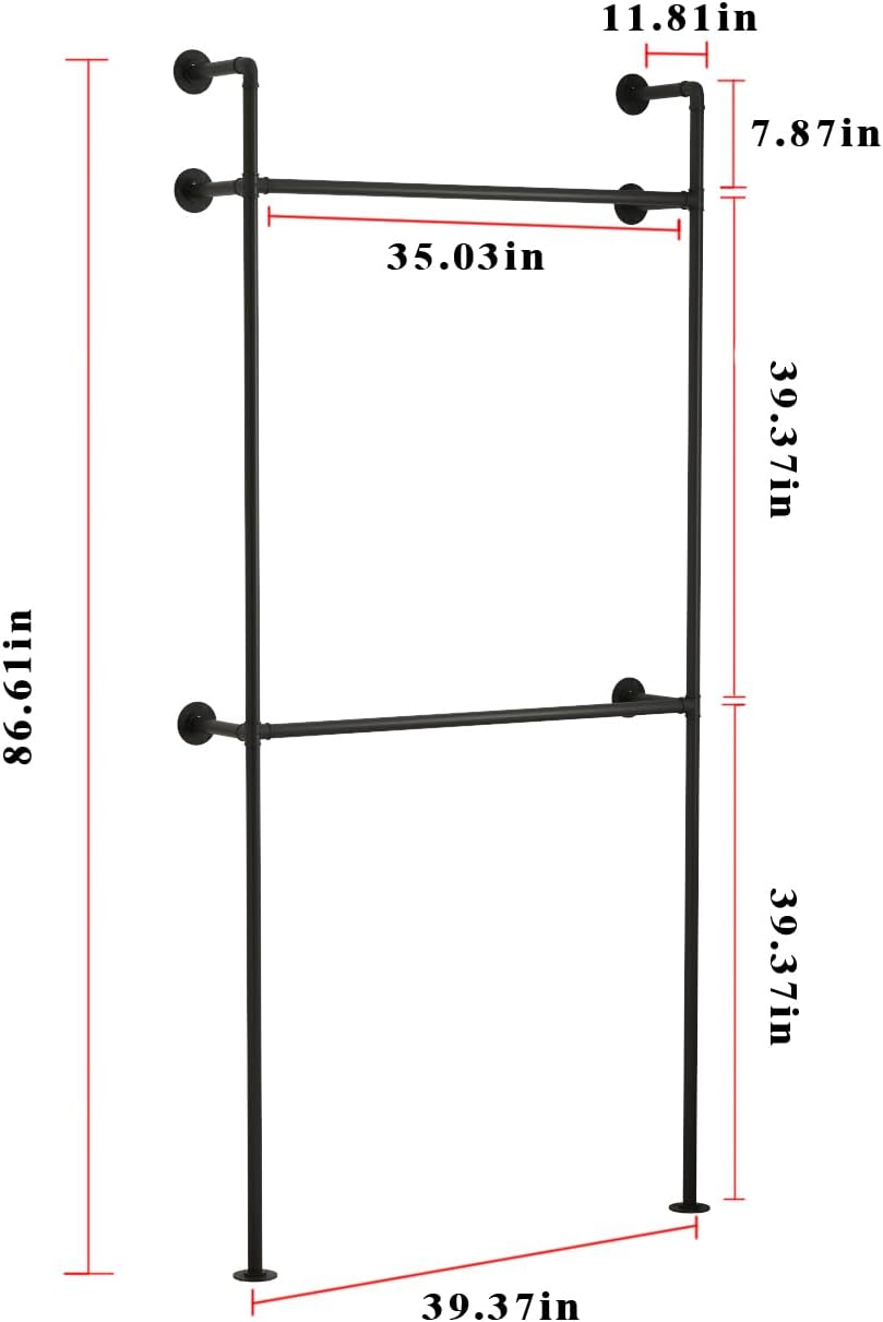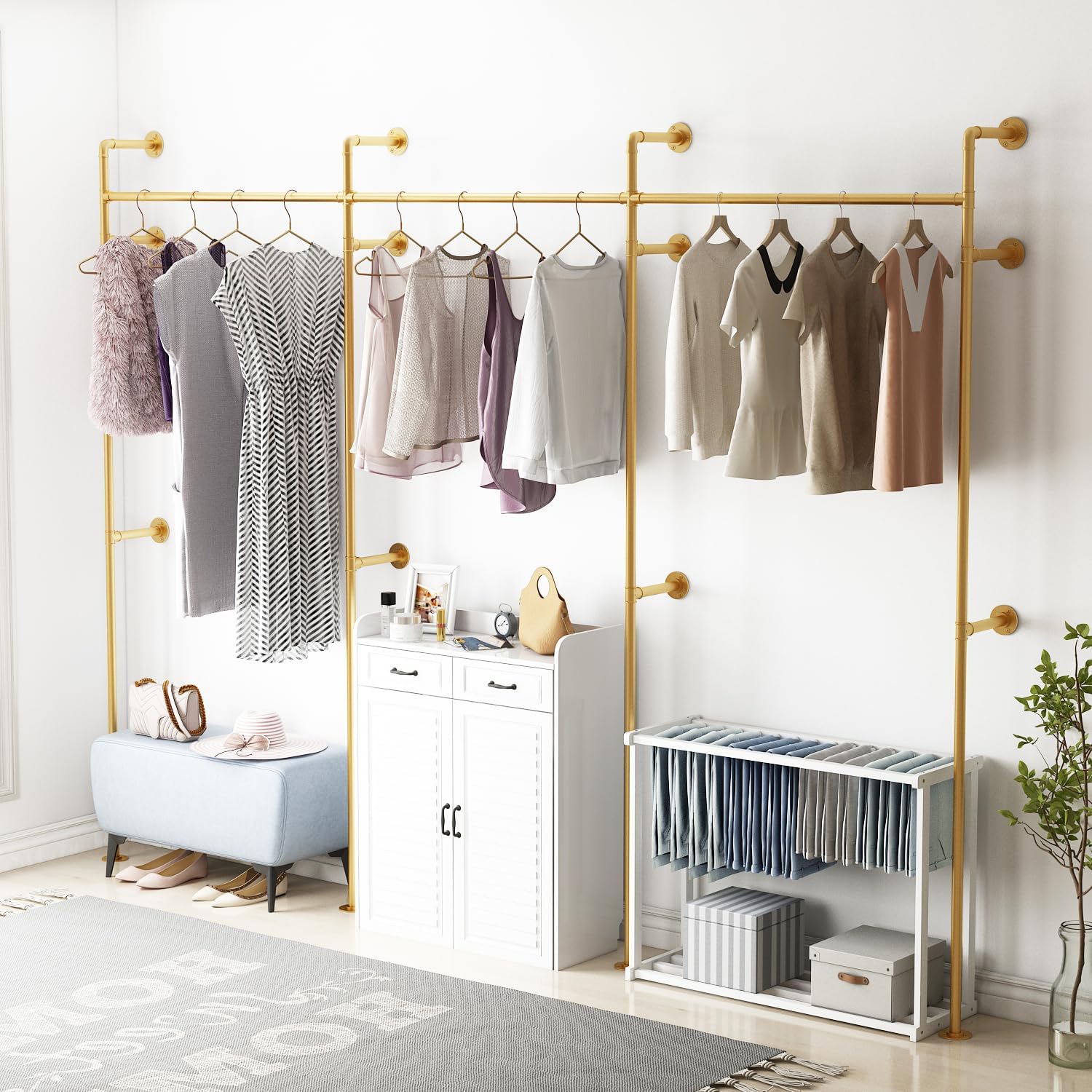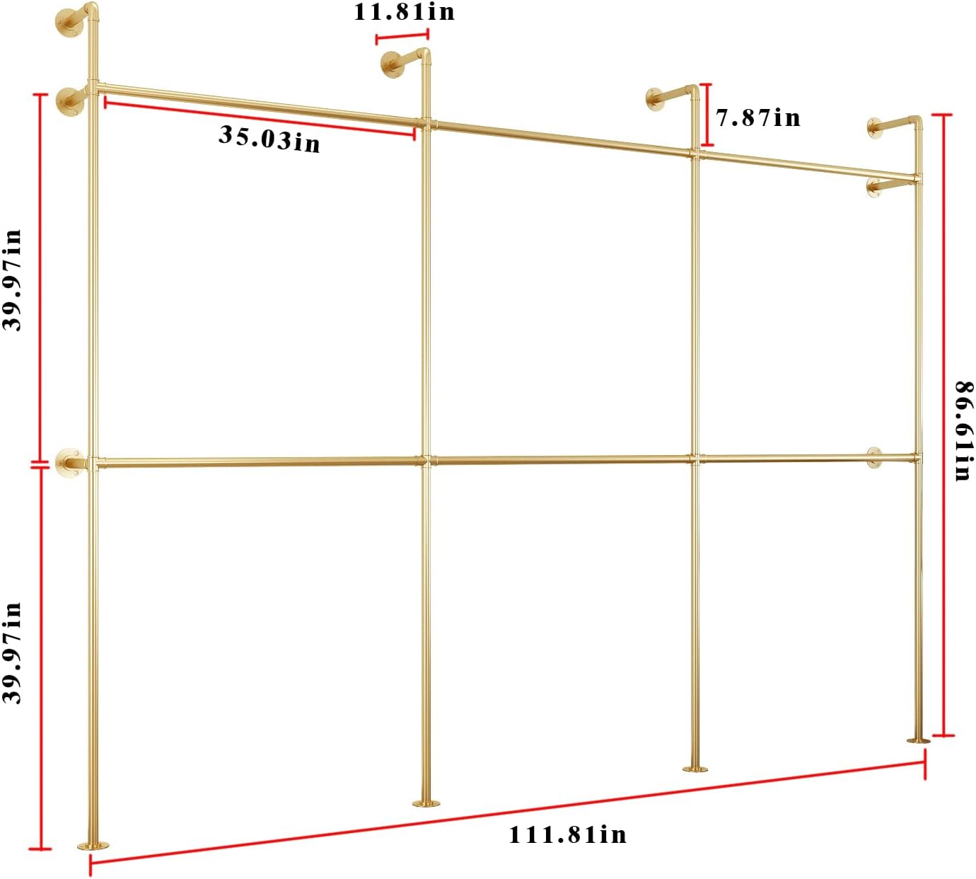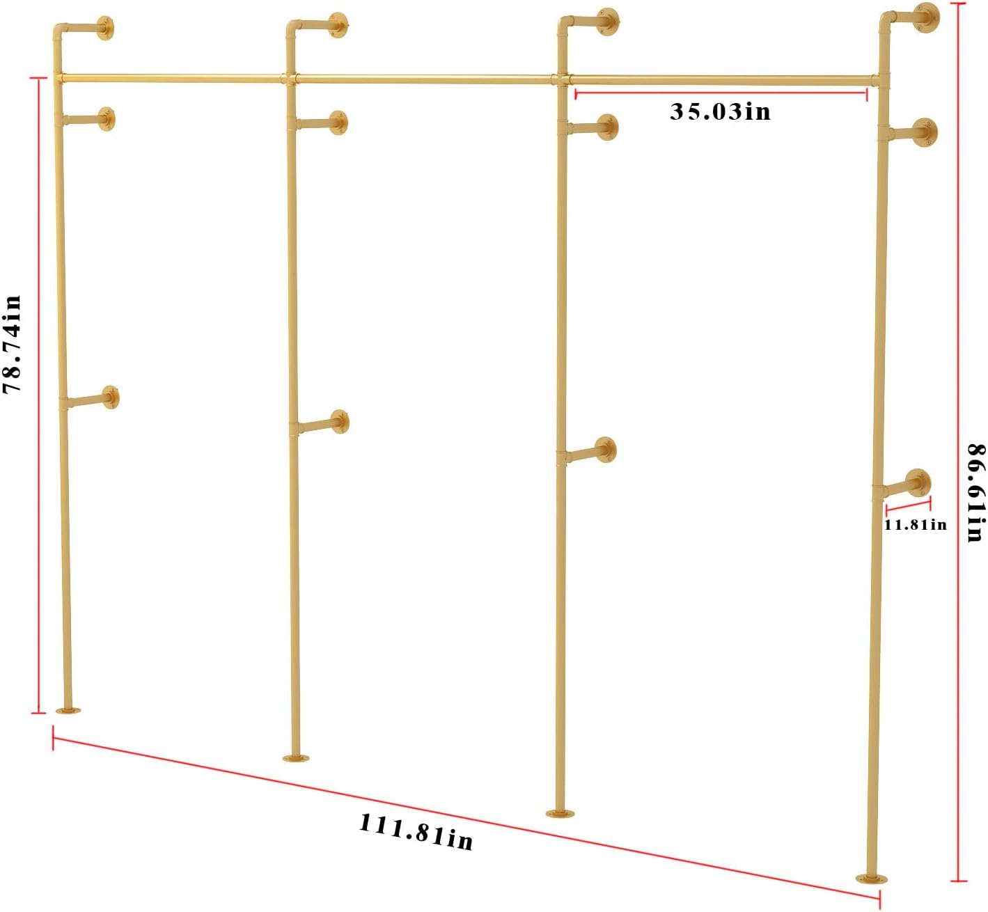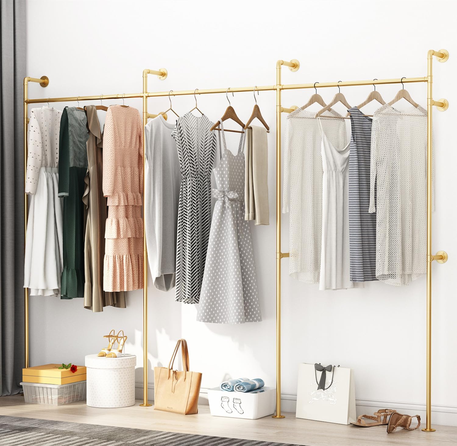 Industrial Pipe Clothing Rack, Heavy Duty Metal Clothes Rack with Double Rods for Hanging Clothes, Wall Mount Space-Saving Garment Display Rack (Three, Gold)