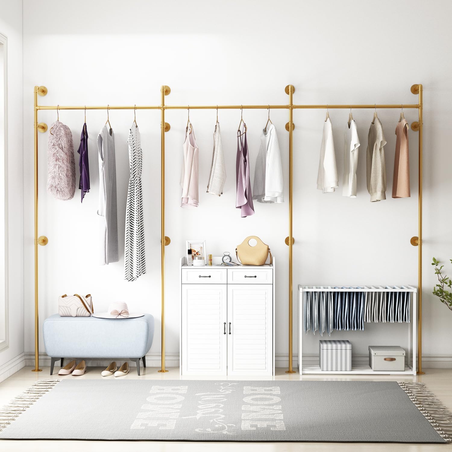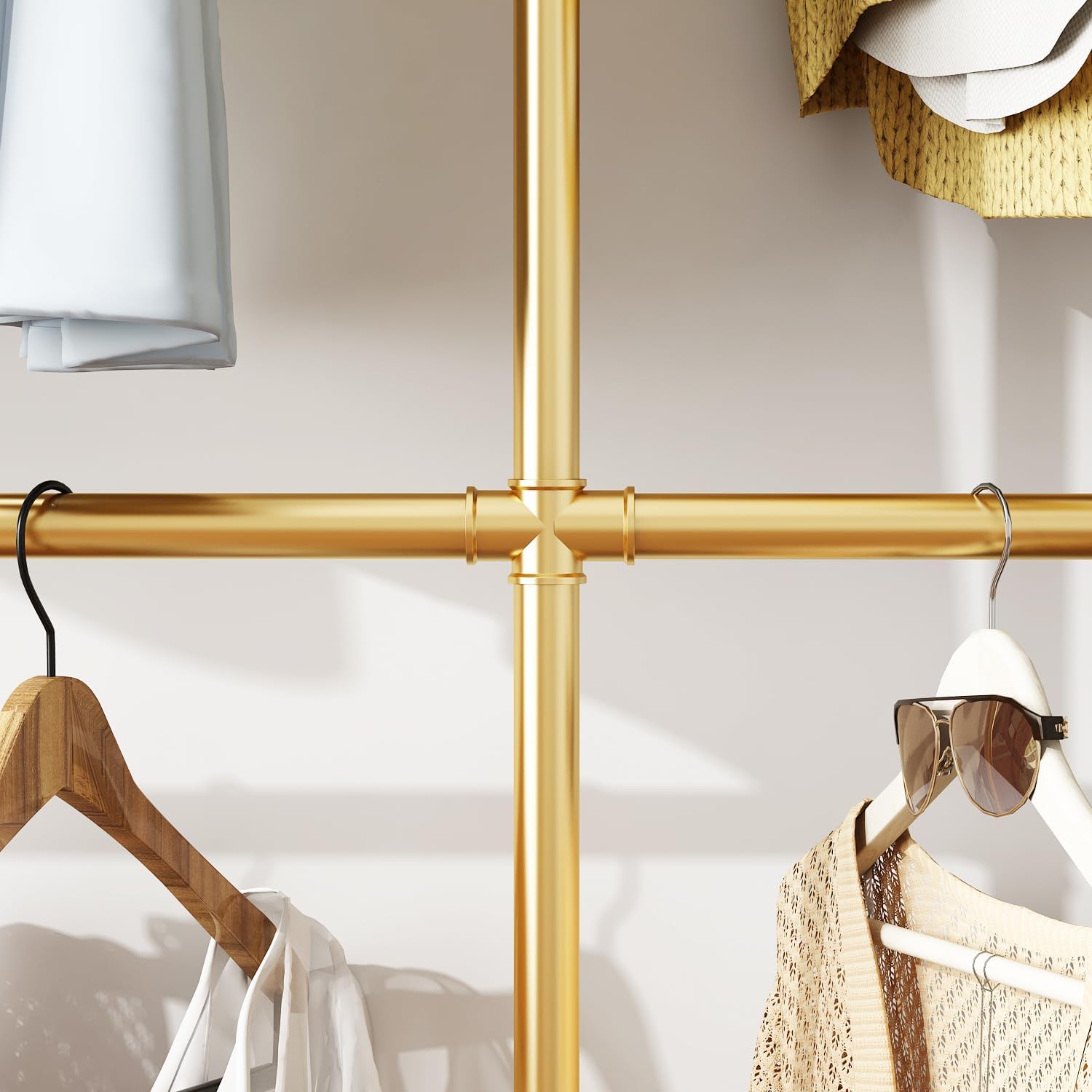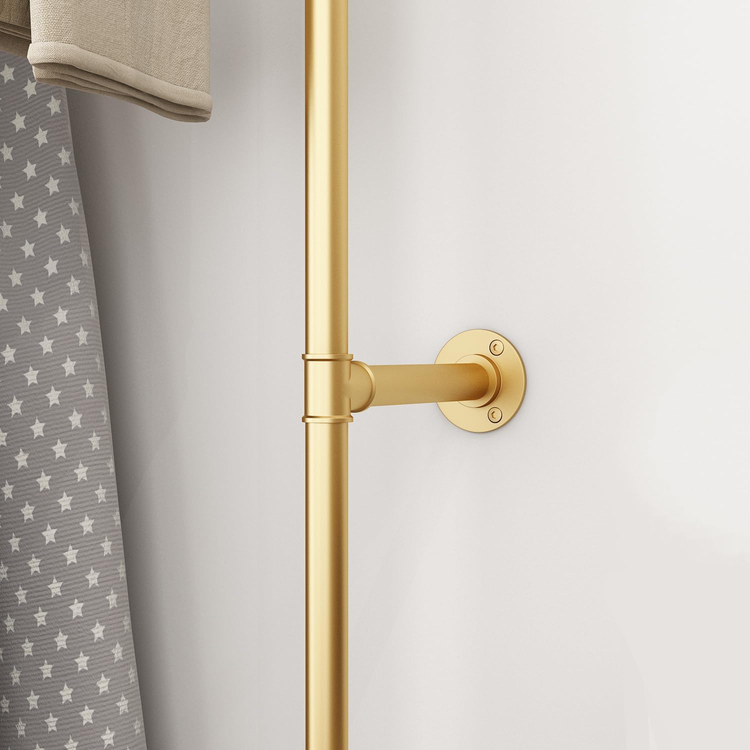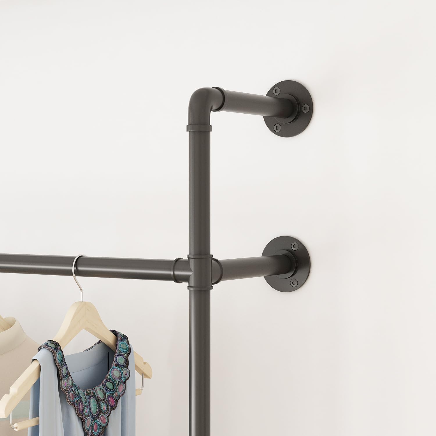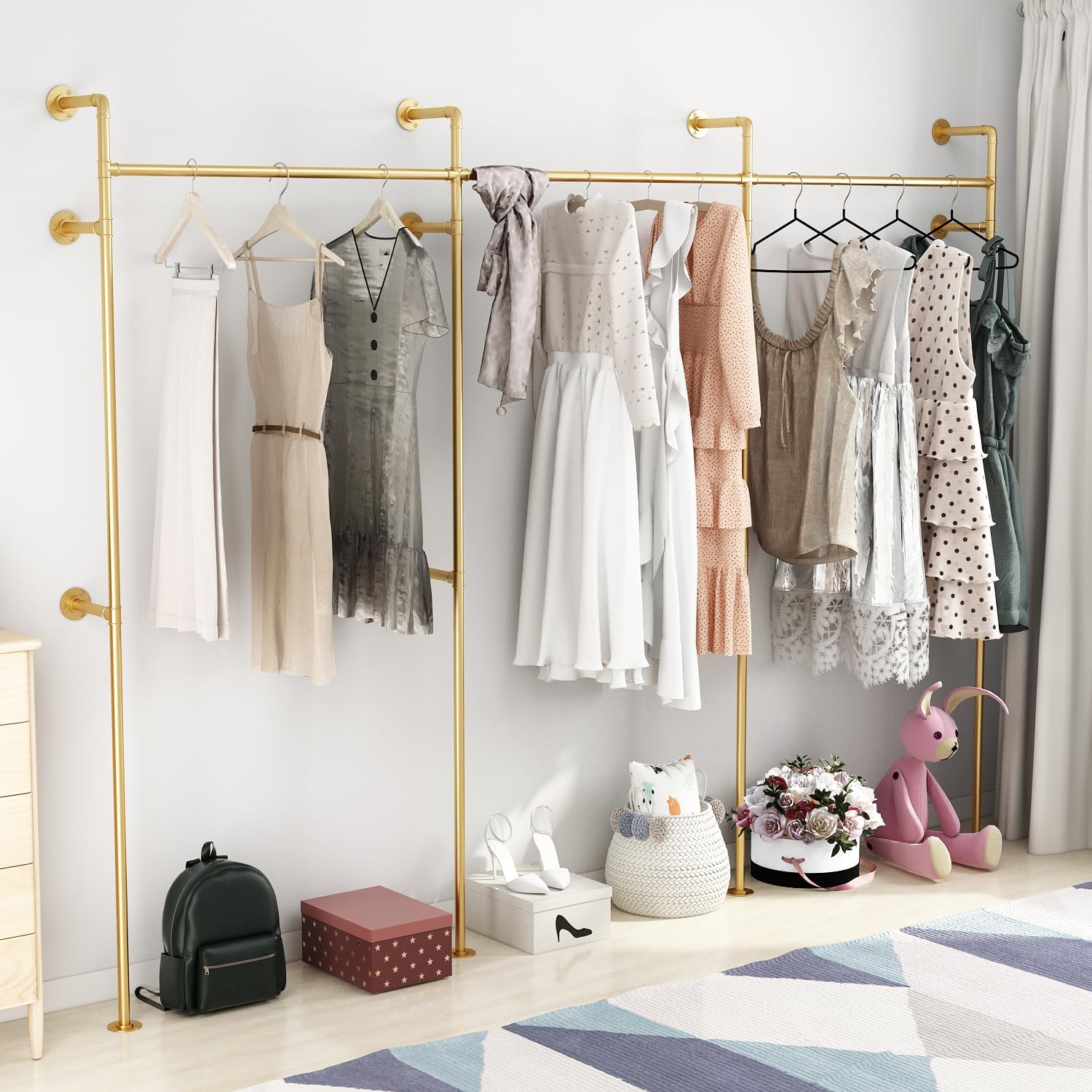 Industrial Pipe Clothing Rack, Heavy Duty Metal Clothes Rack with Double Rods for Hanging Clothes, Wall Mount Space-Saving Garment Display Rack (Three, Gold)