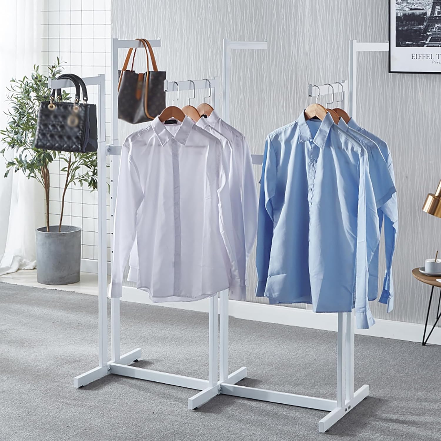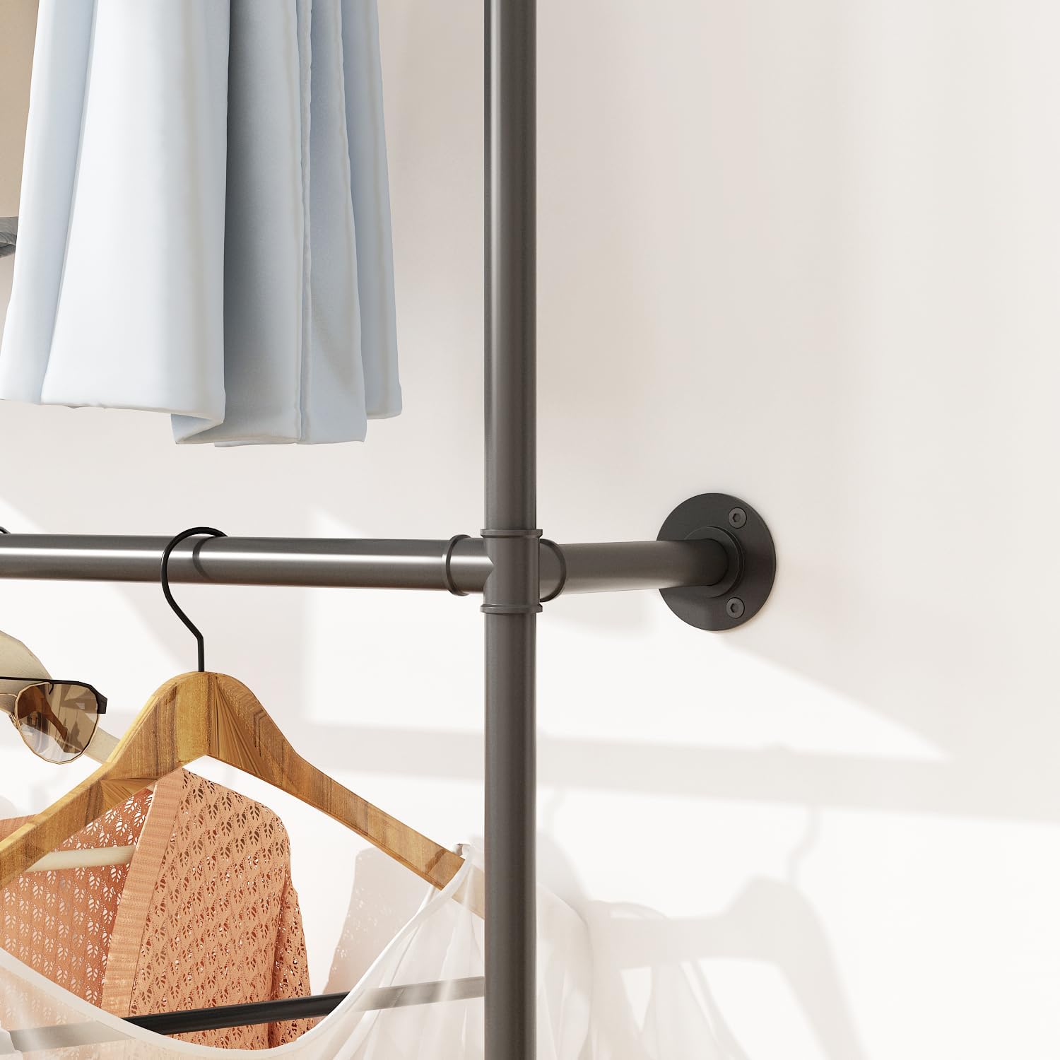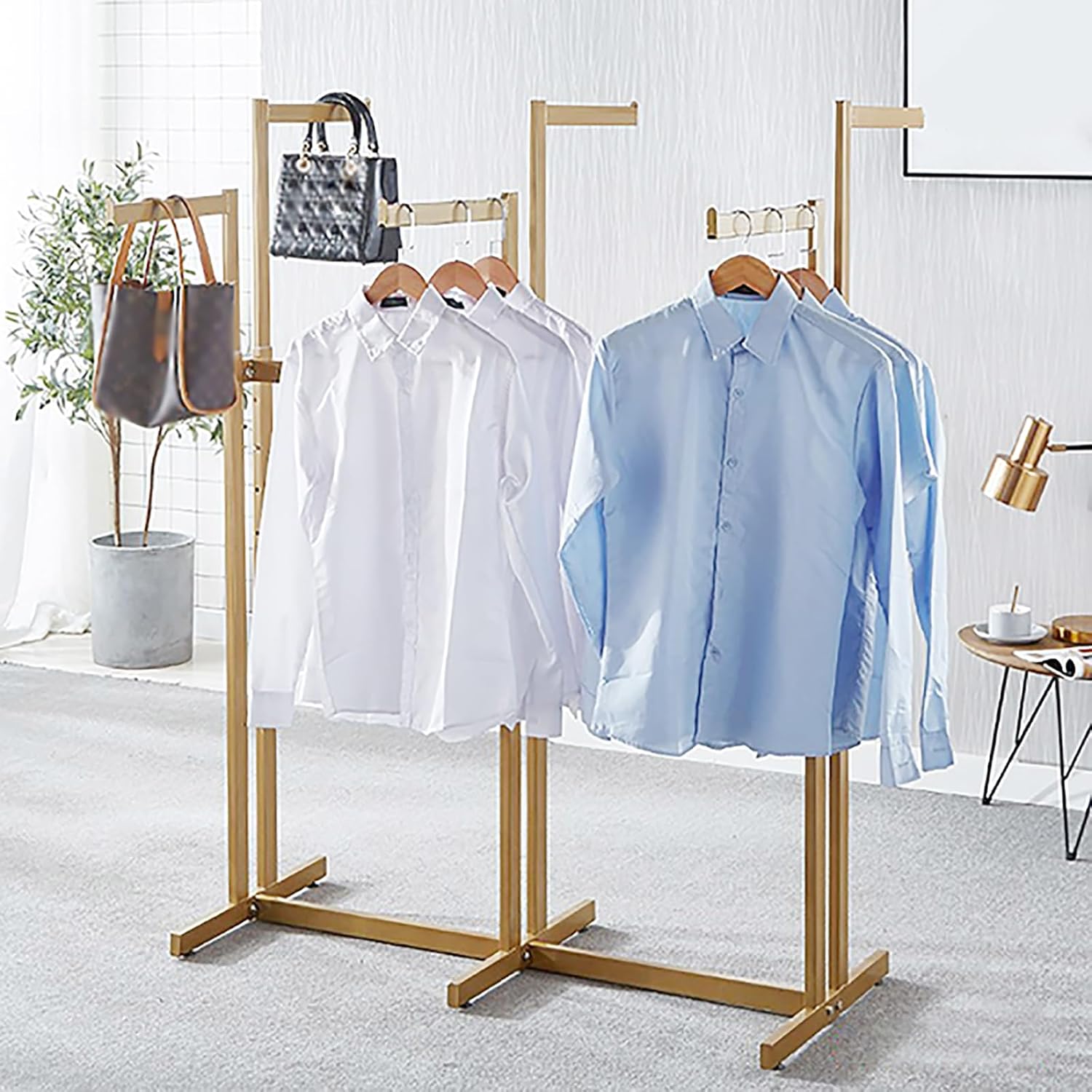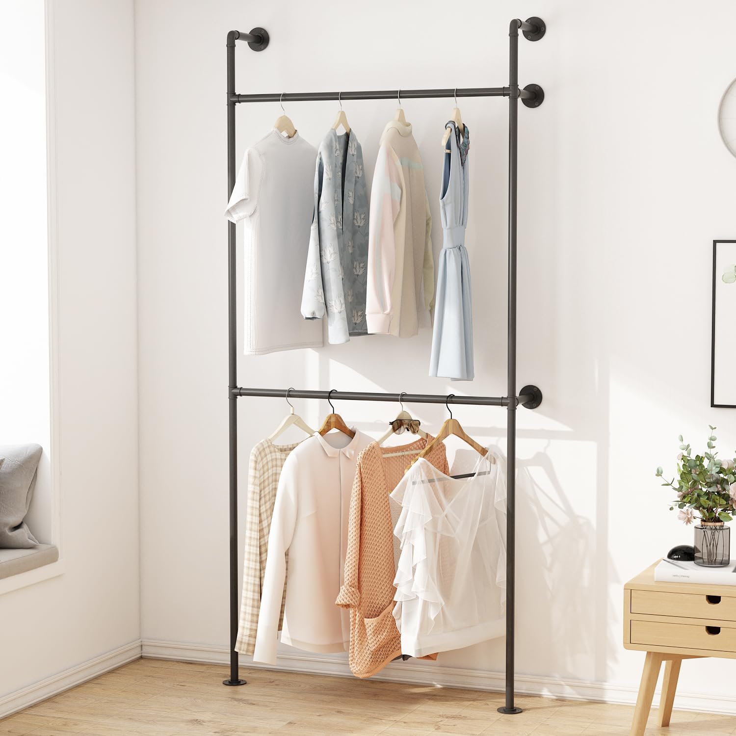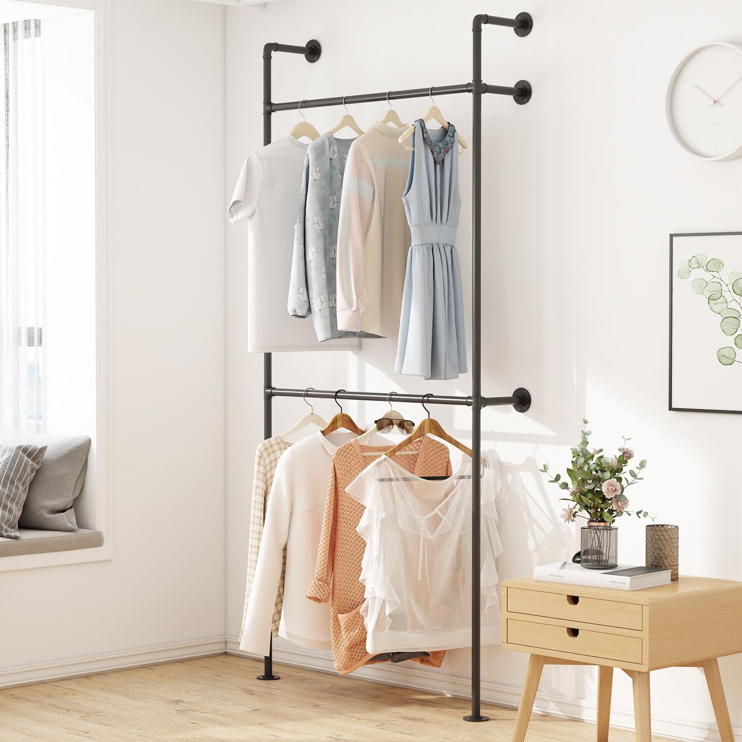Industrial Pipe Clothing Rack, Heavy Duty Metal Clothes Rack with Double Rods for Hanging Clothes, Wall Mount Space-Saving Garment Display Rack (Three, Gold)