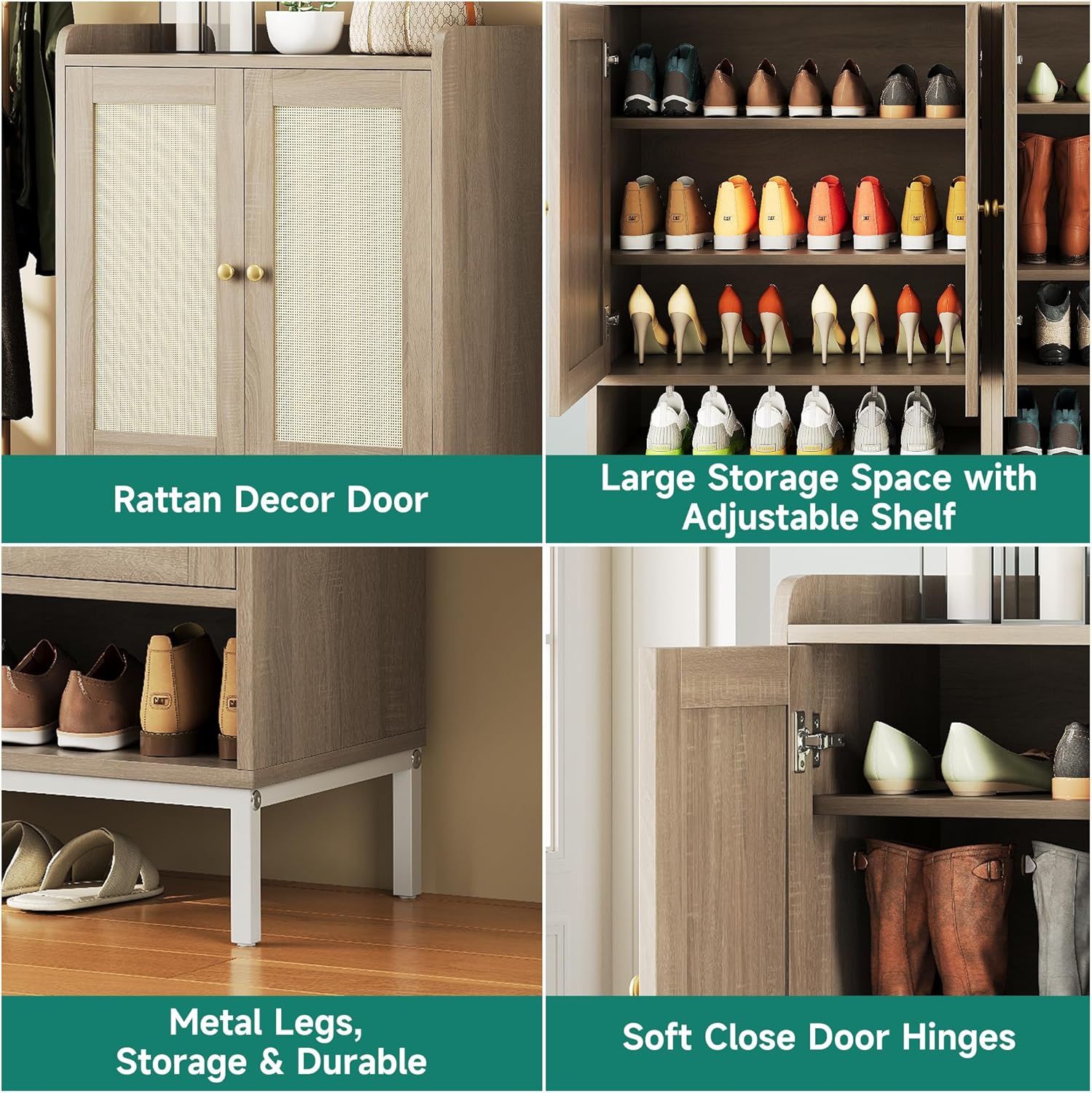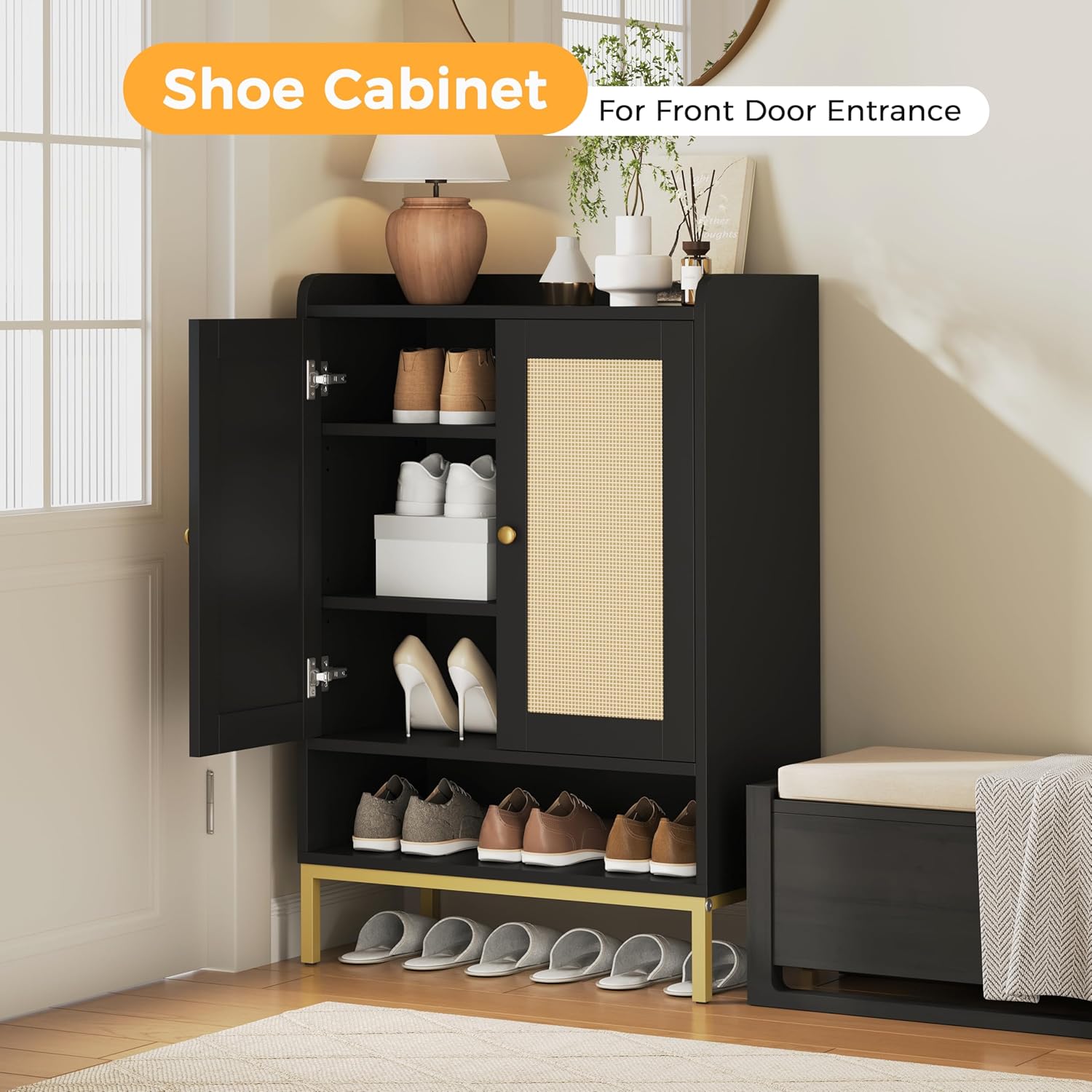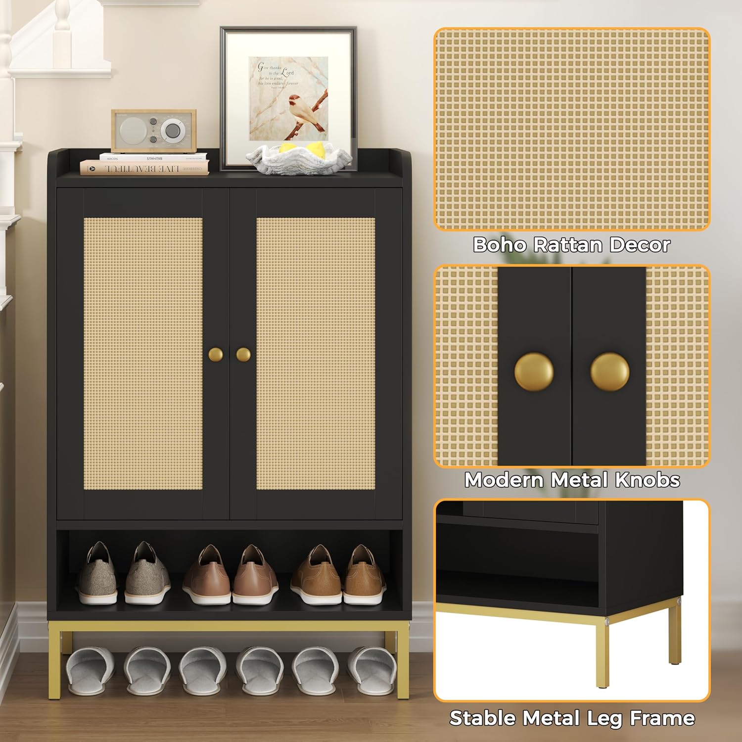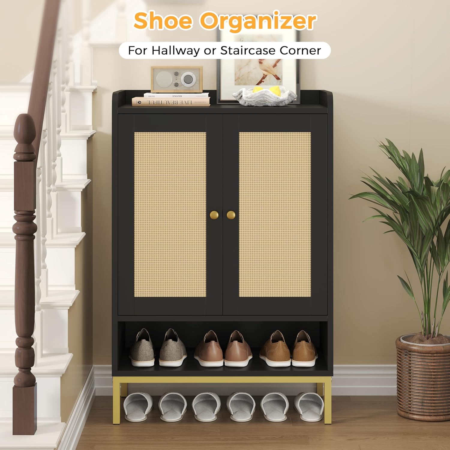 JASIWAY Rattan Shoe Cabinet Storage for Entryway, Shoe Cabinet with Adjustable Shelves for Entryway, 5-Tier, 20 Pair Shoe Rack Storage for Hallway, Closet, Living Room, Black