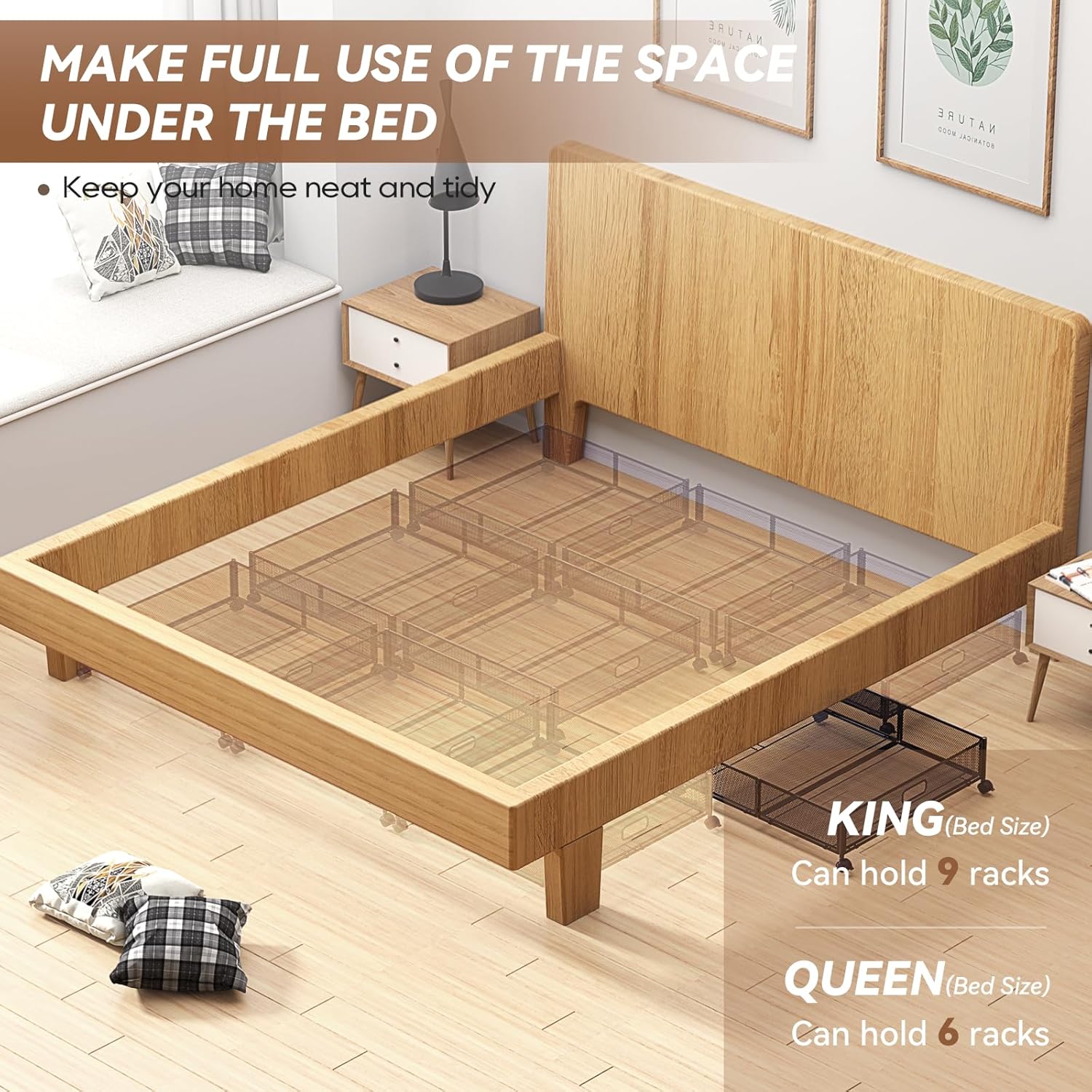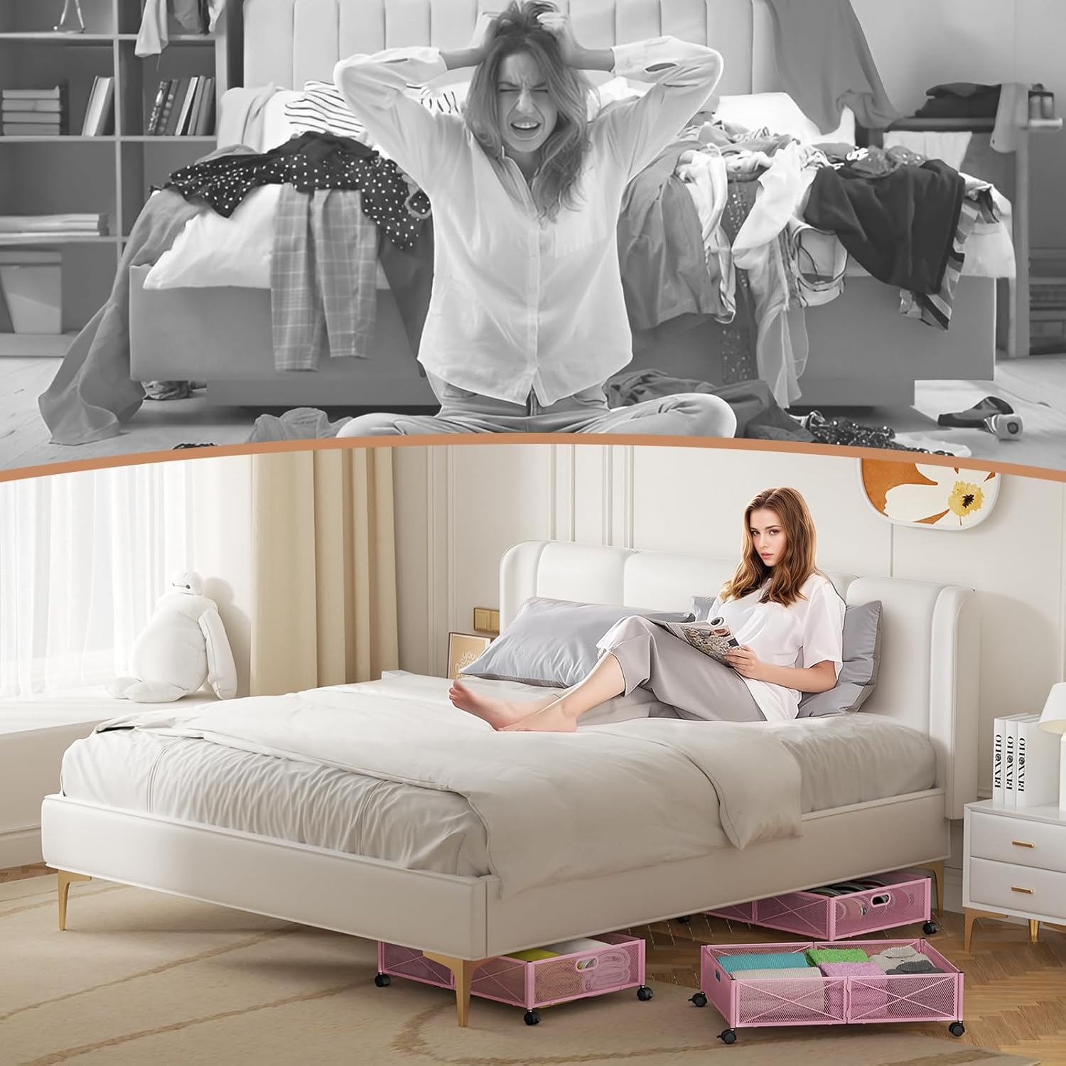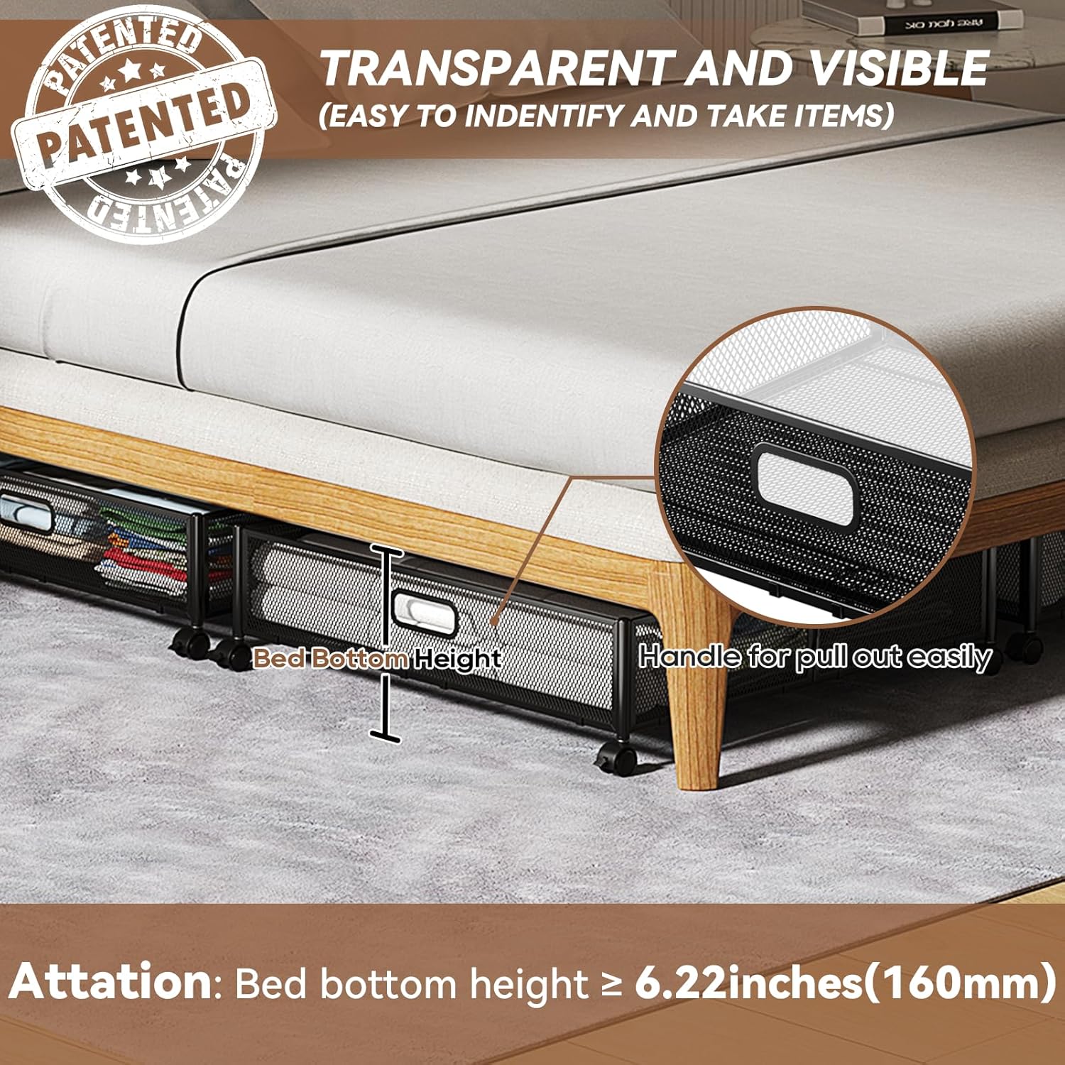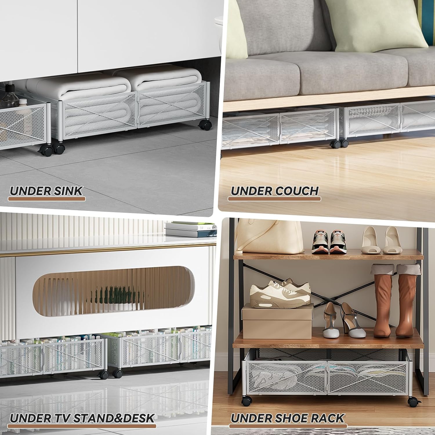 Under Bed Storage Containers with Wheels - Shoe Storage Organizer Drawer, Tool-free Assembly Metal Underbed Storage for Bedroom Clothes, Shoes, Blankets - 4Pack