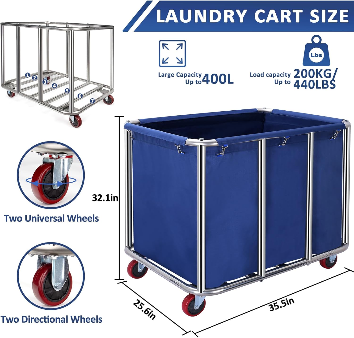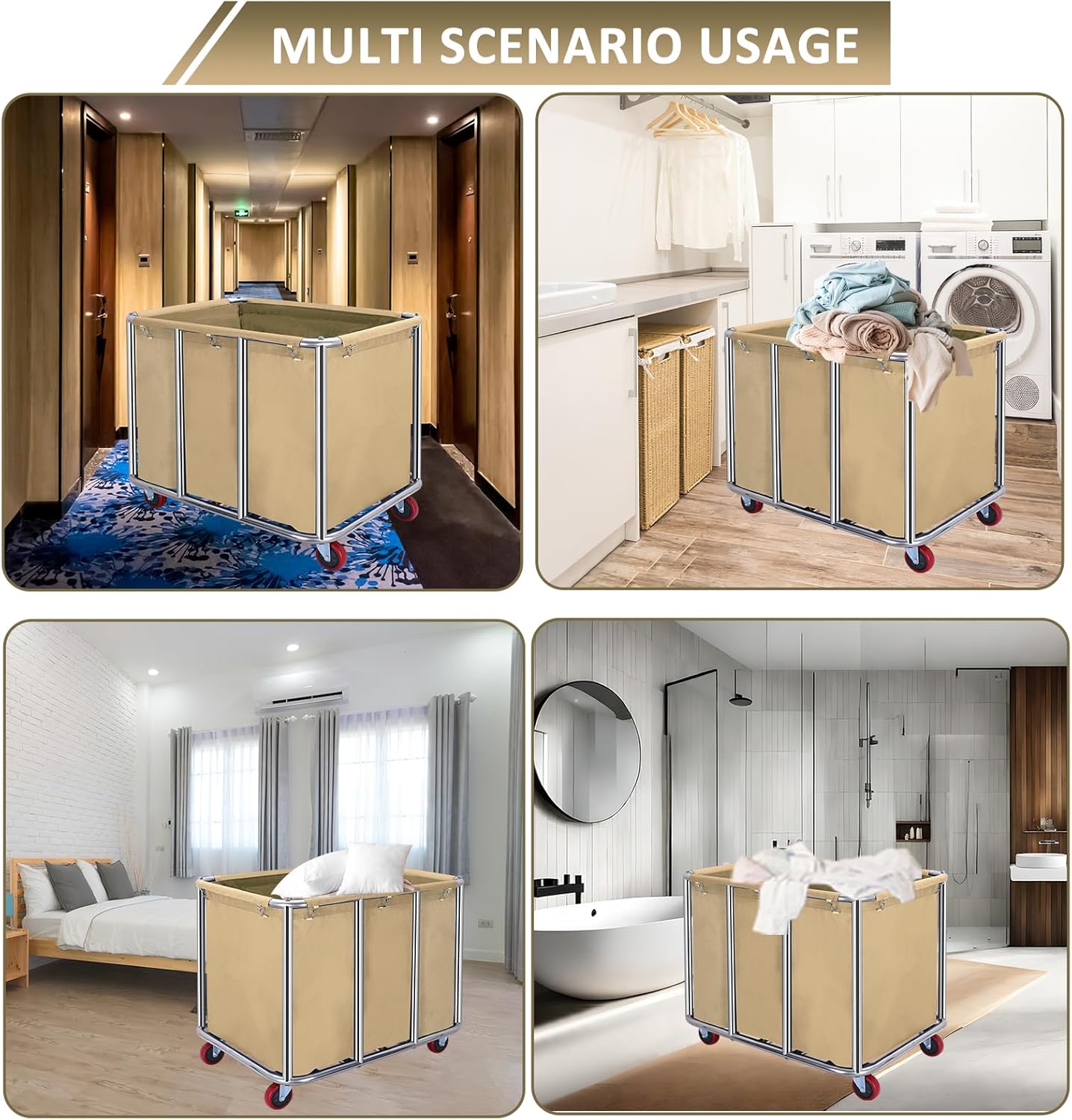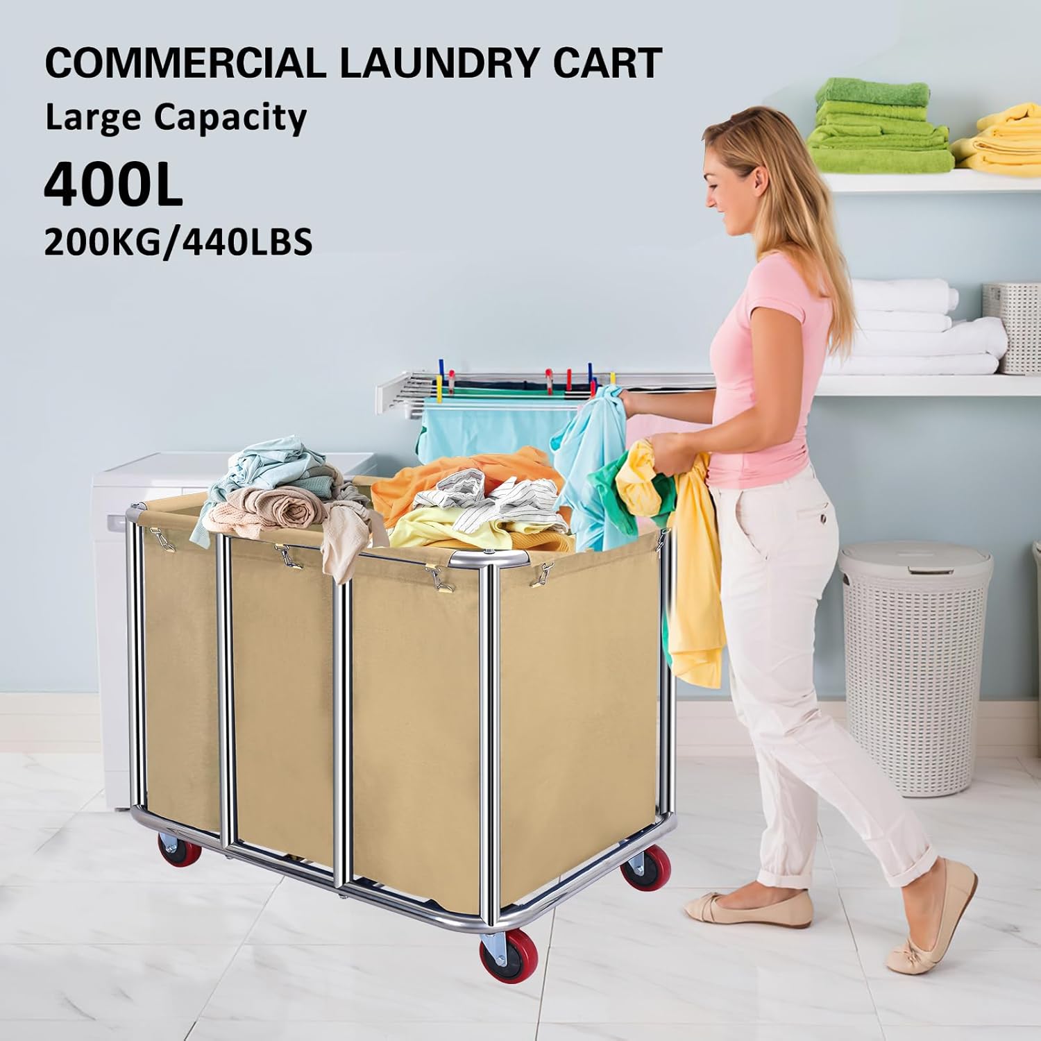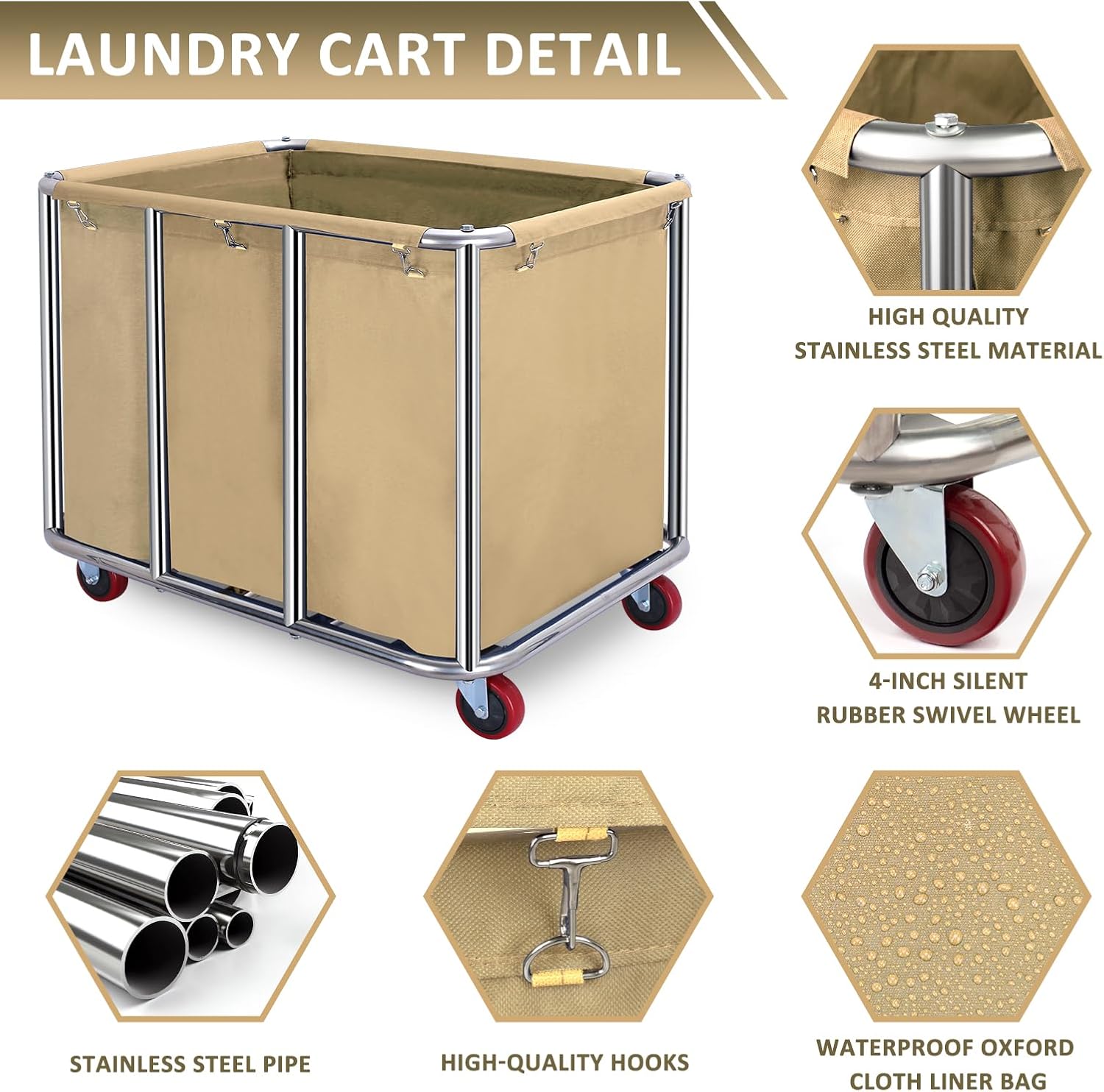 Commercial Laundry Cart with Wheels,Commercial Laundry Basket 11.35 Bushel(400L),Industrial Laundry Cart with Stainless Steel Frame and Oxford Cloth,440LB Load(Beige)