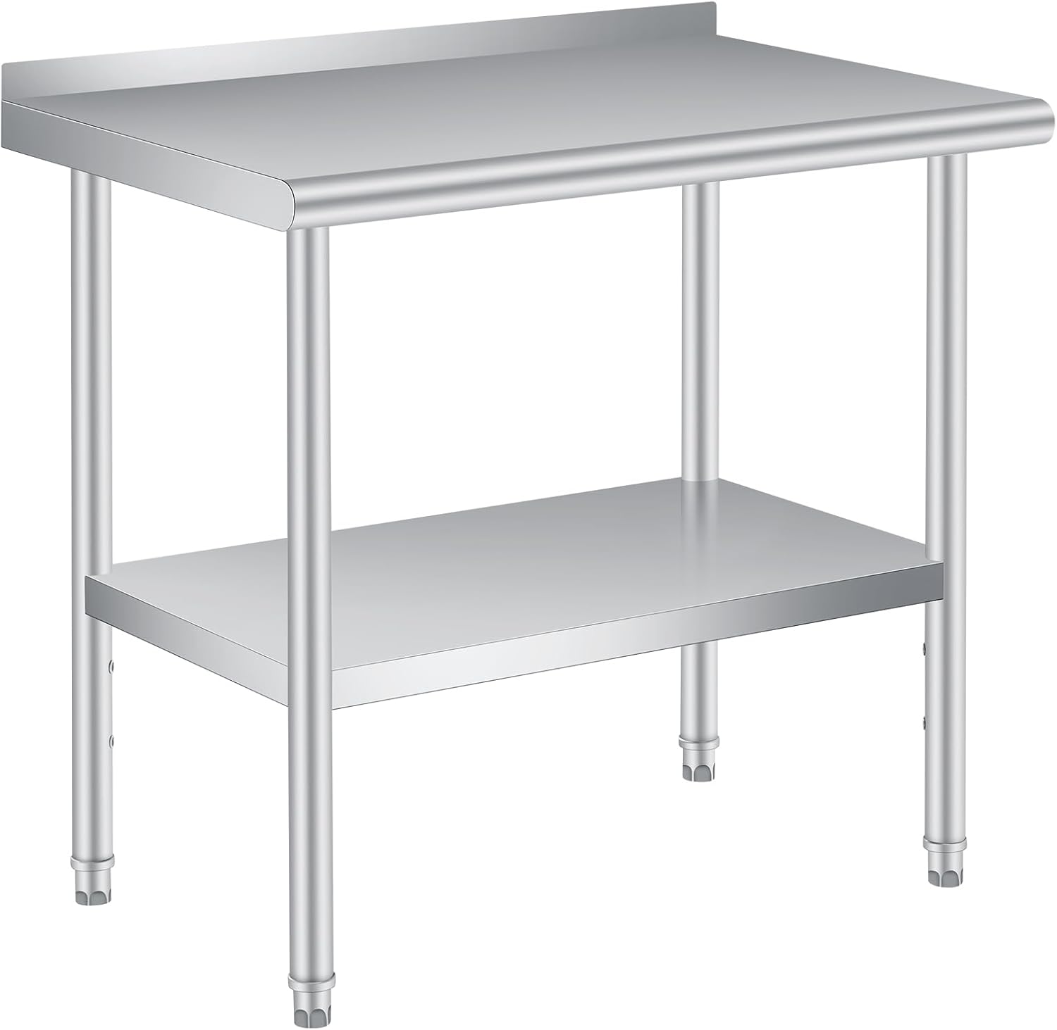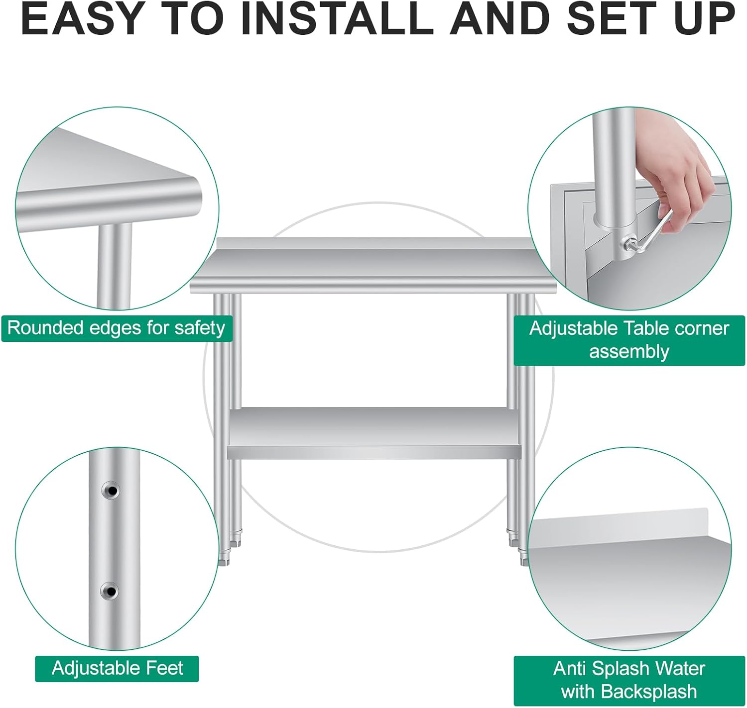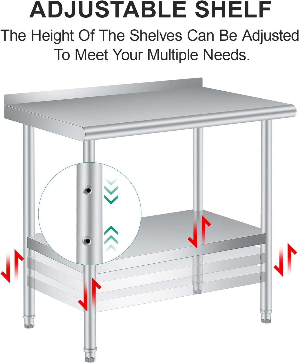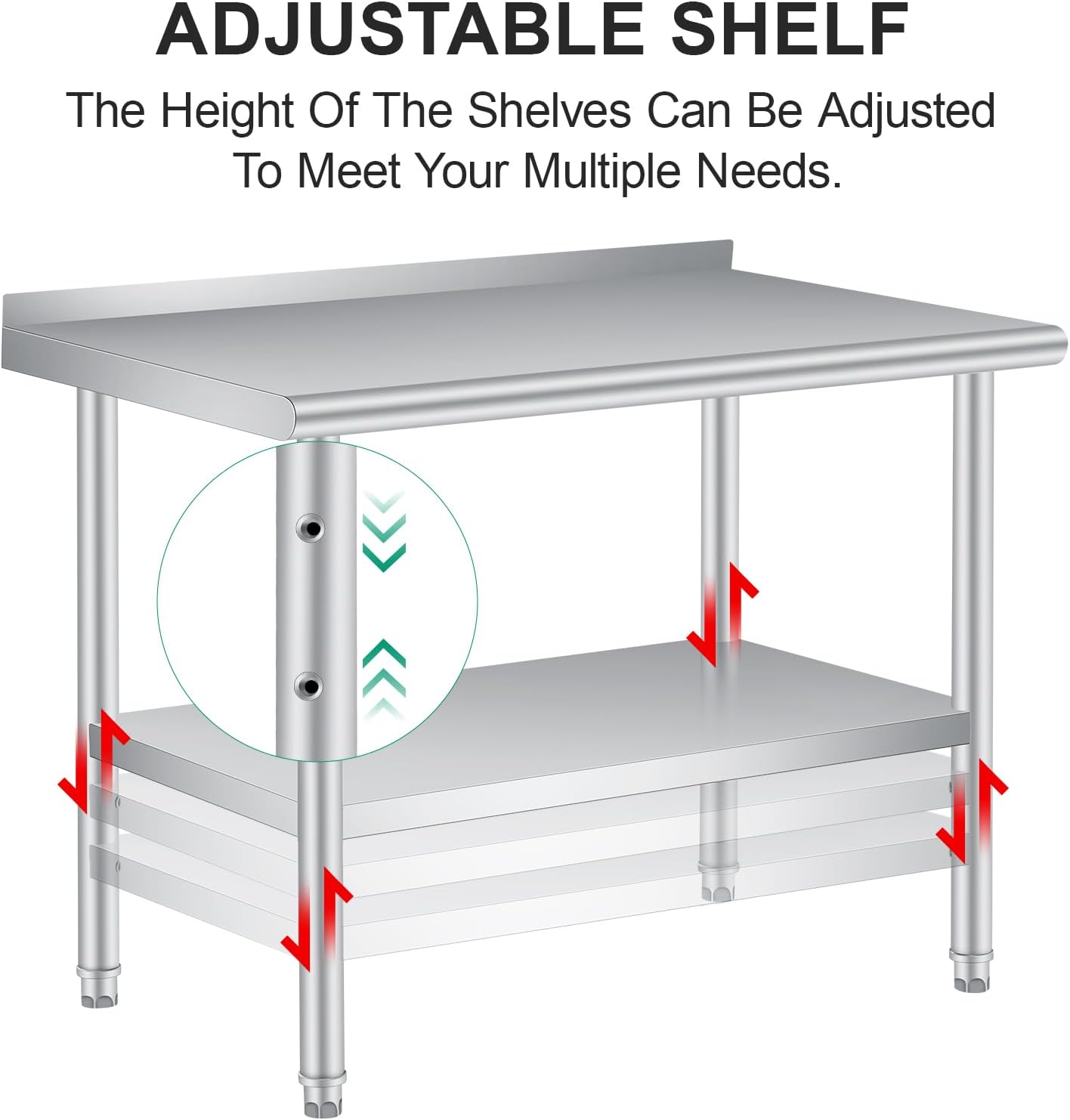 Stainless Steel Prep Table, 48 x 24 in, with Backsplash, Adjustable Undershelf, Commercial Heavy Duty Table with Adjustable Under Shelf for Outdoor Use,Restaurants,Hotels,Works