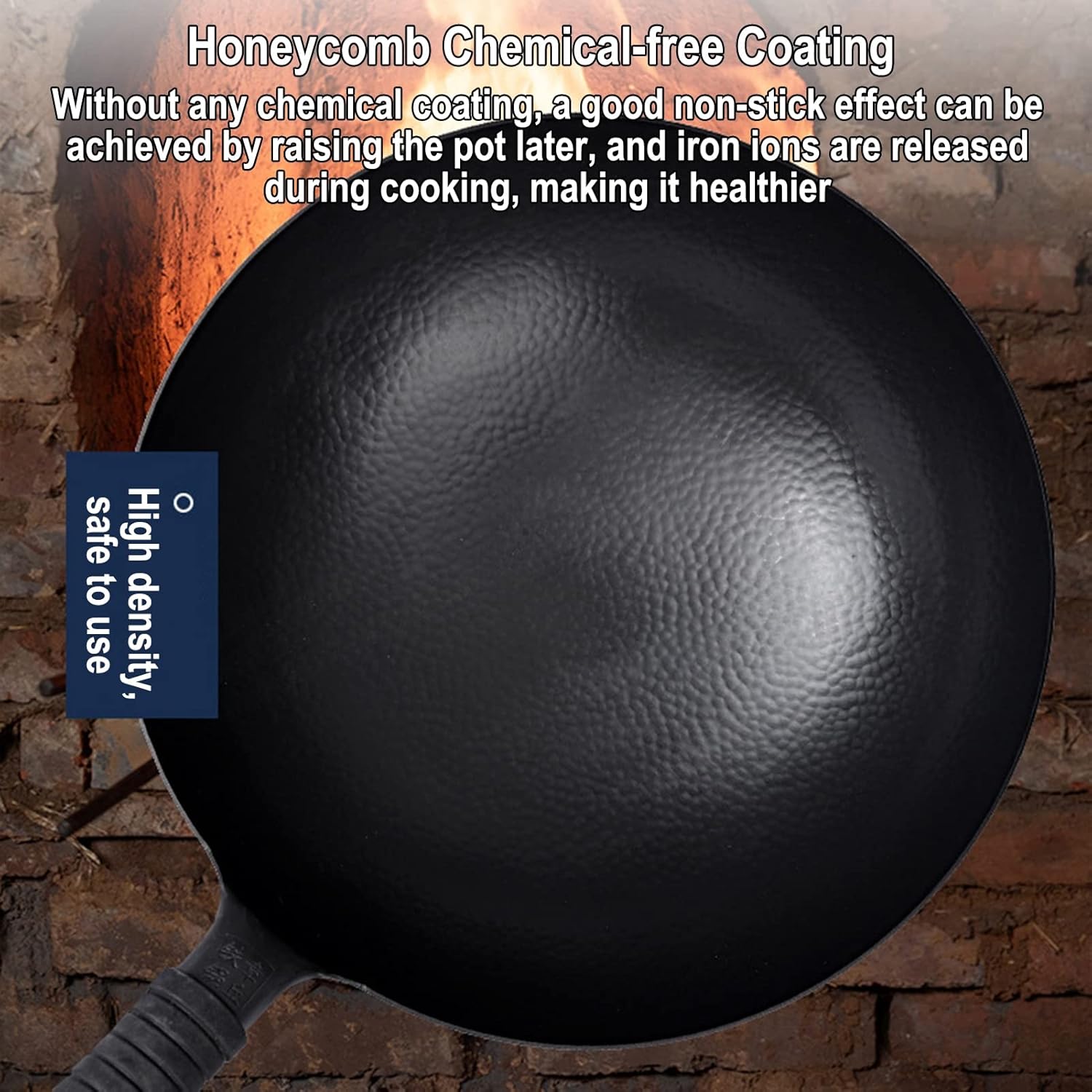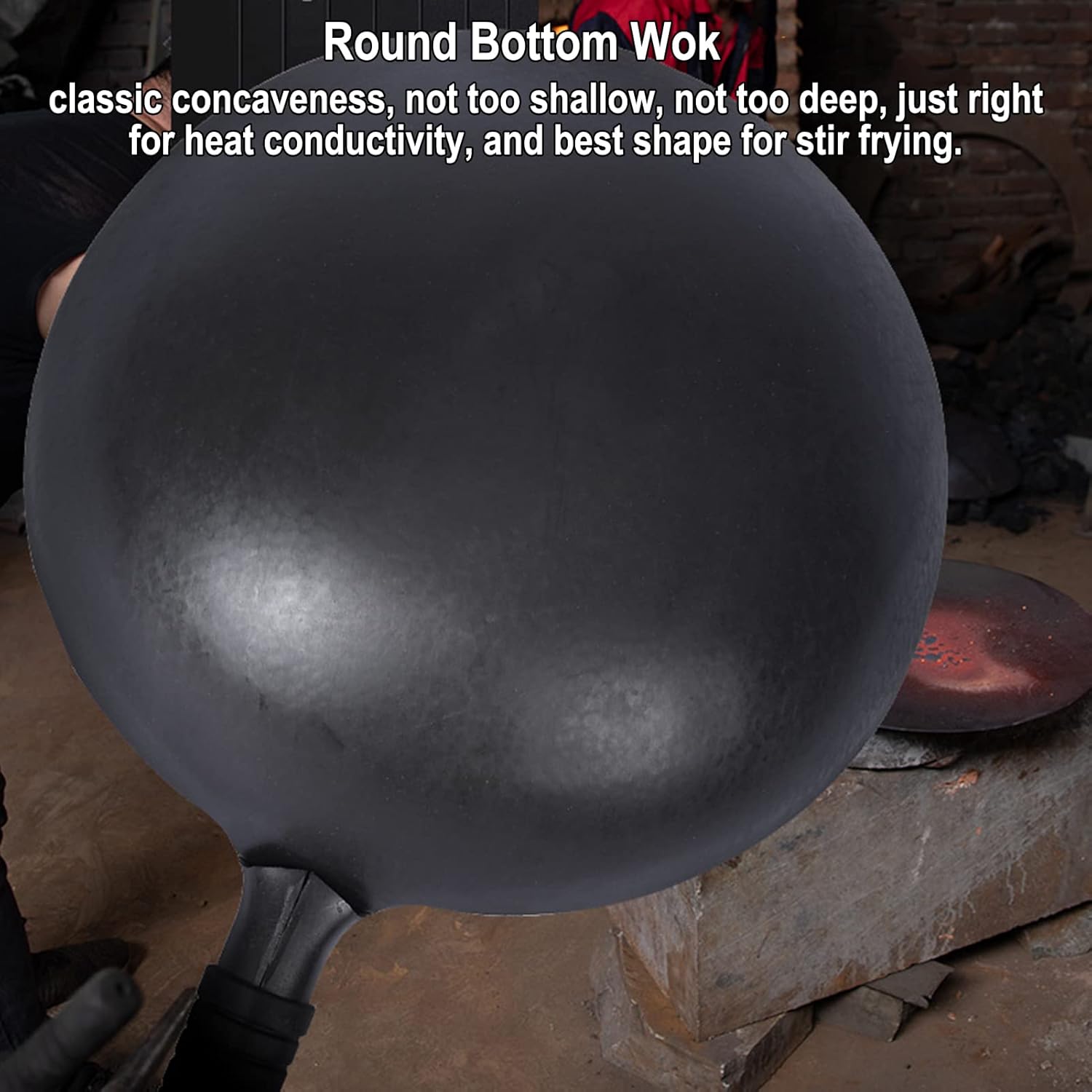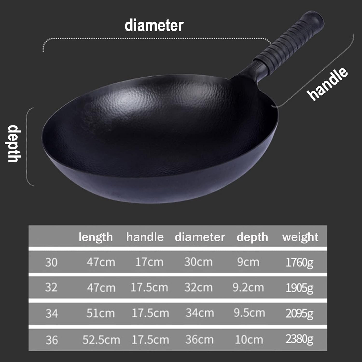 Black Cast Iron Wok Stir Fry Pans, Profession Chinese Hand Hammered Iron Woks with Round Bottom & Handle, No Coating, Less Oil, Non-Stick Pot,34Cm-Black-34cm