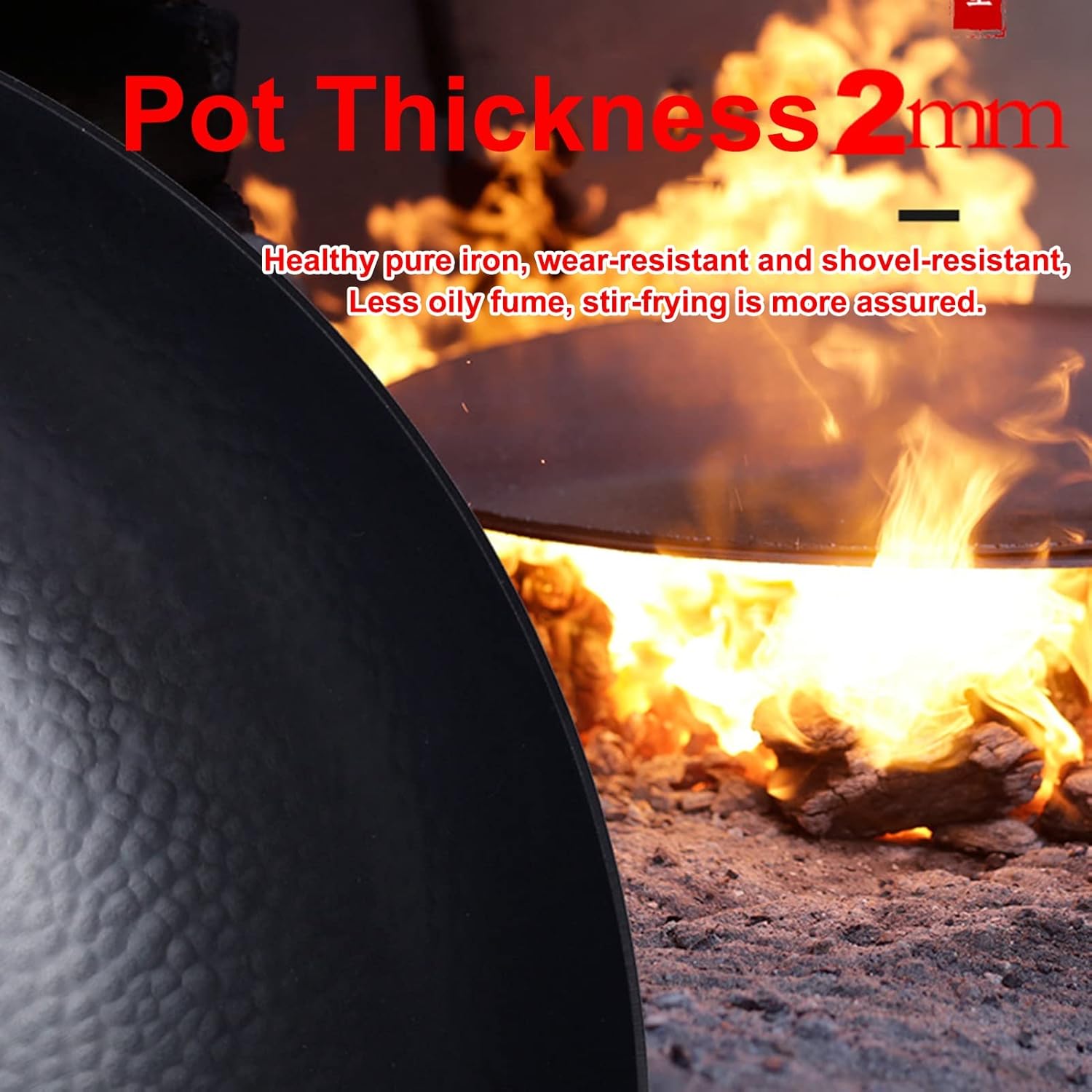 Handmade Forged Iron Cooking Pot, Round Bottom Non-Stick Frying Pan, Pointed Bottom Wok for Gas Stove, Uncoated, with Glass Lid & Heat-Resistant Handle