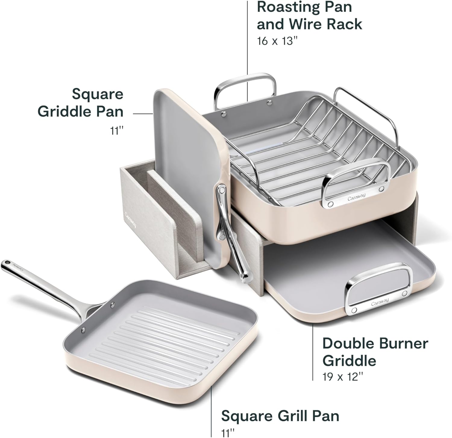Caraway Square Cookware Set - Square Pans Set - Perfect for Griddling, Toasting, Searing, Roasting, and More - Non-Stick Ceramic Coated Pans - Non Toxic, PTFE & PFOA Free - Cream