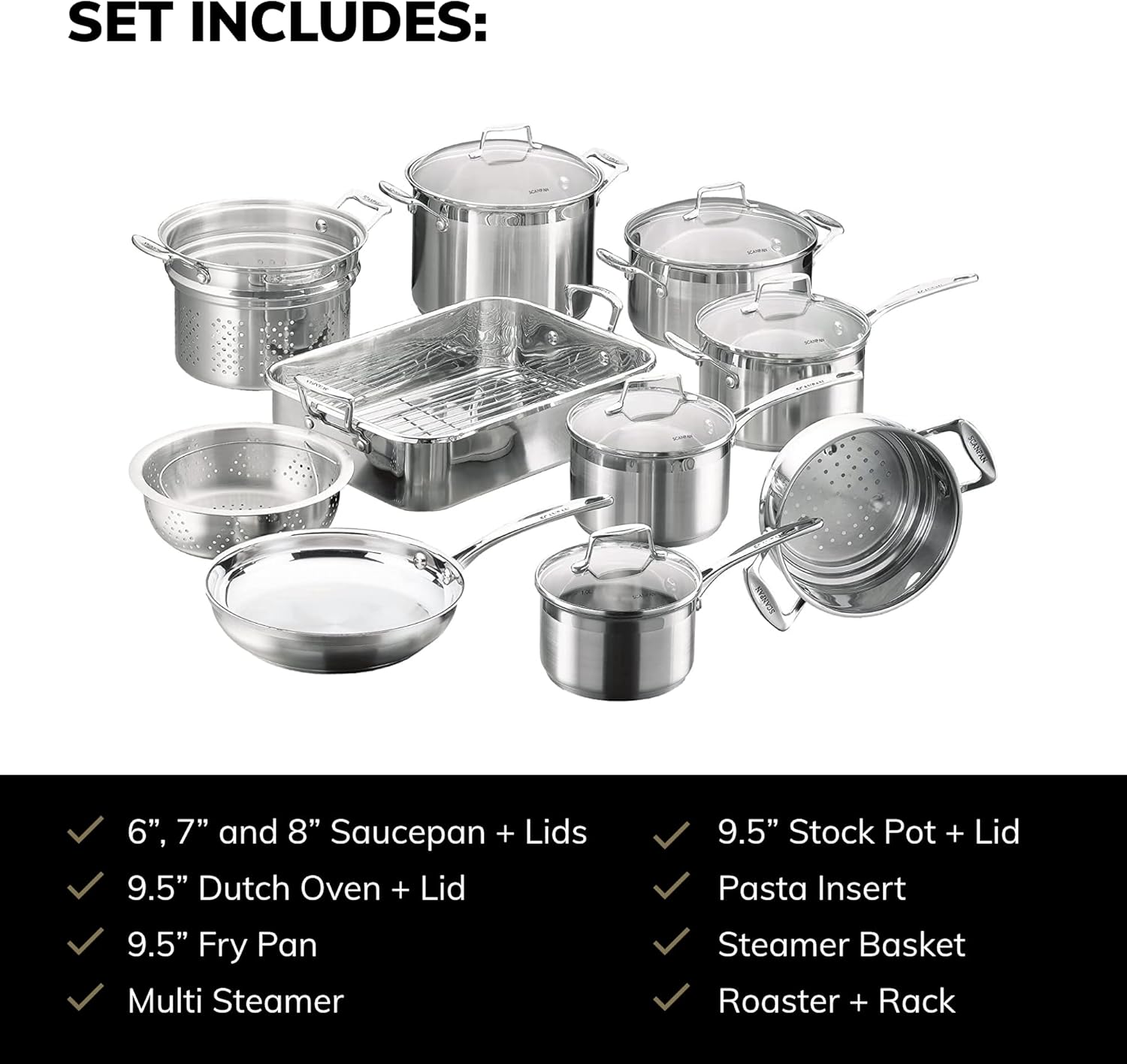 SCANPAN Impact 16-Piece Cookware Set - Includes 10 Total Pieces + 6 Lids - Made of Durable 18/10 Stainless Steel - Dishwasher & Oven Safe