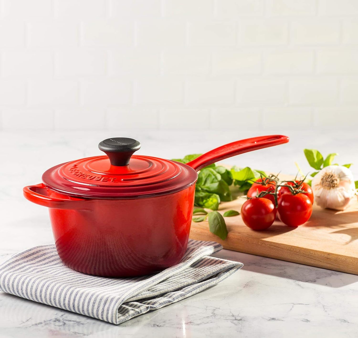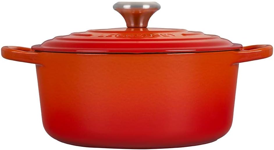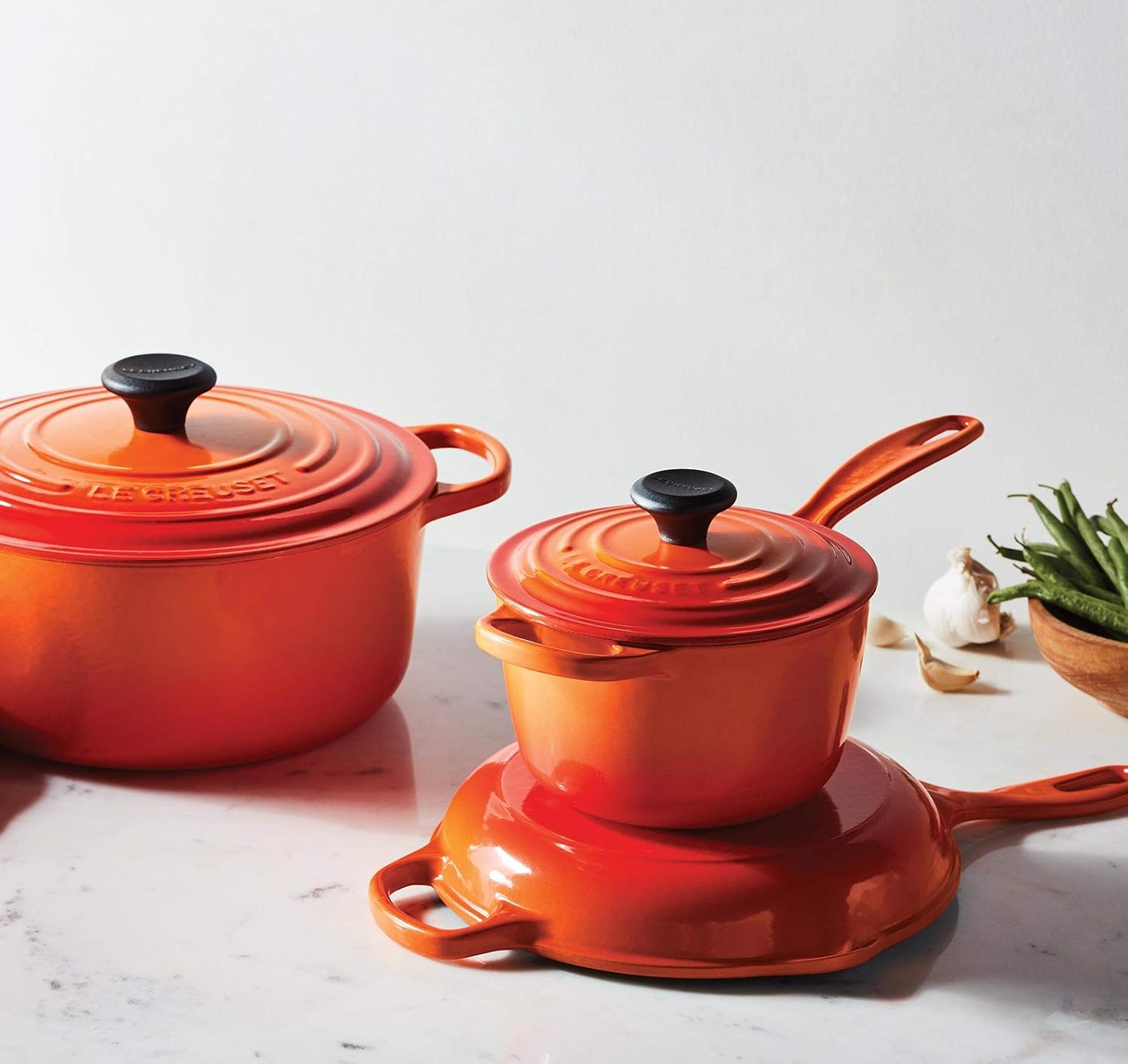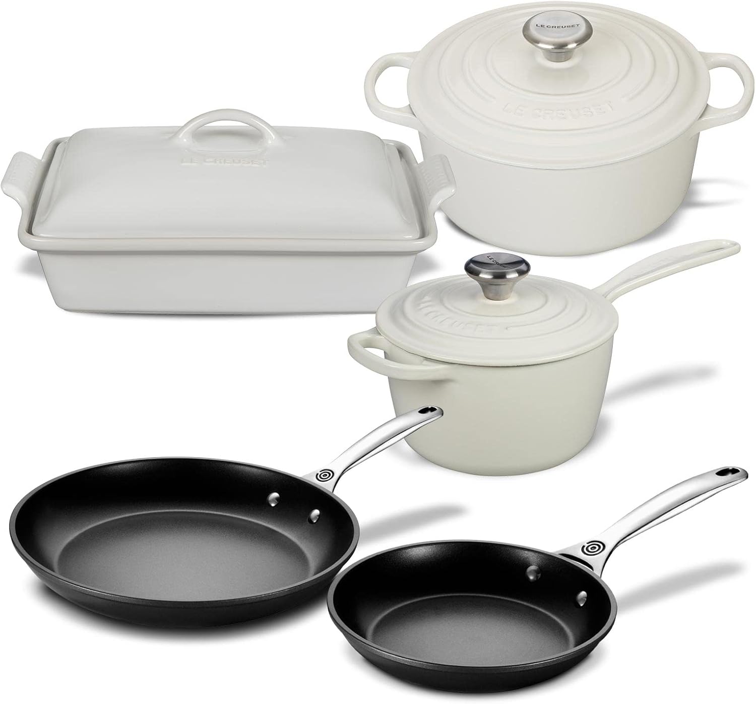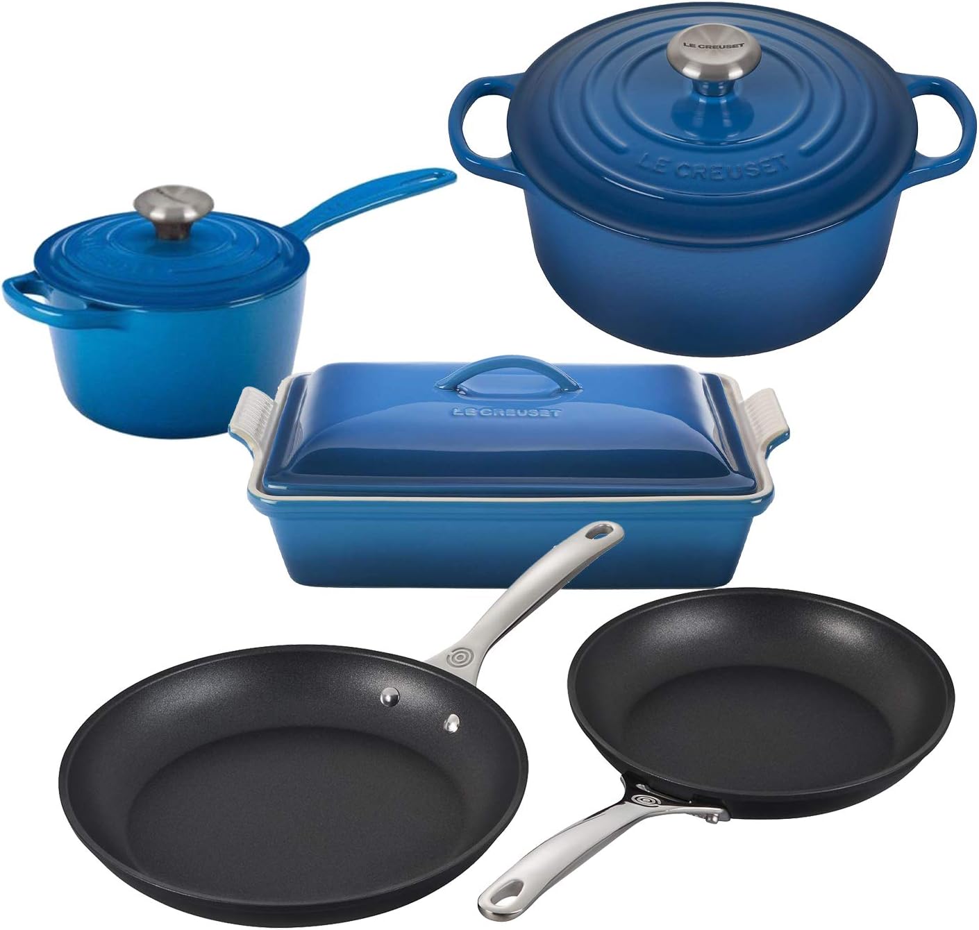 Le Creuset 8 Piece Multi-Purpose Enameled Cast Iron with SS Knobs, Stoneware, and Toughened Nonstick PRO Fry Pan Complete Cookware Set - Flame