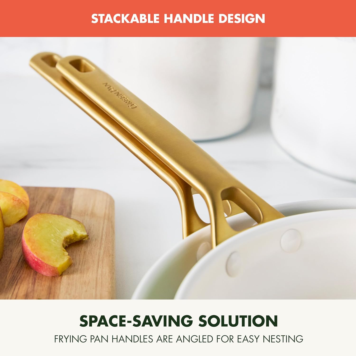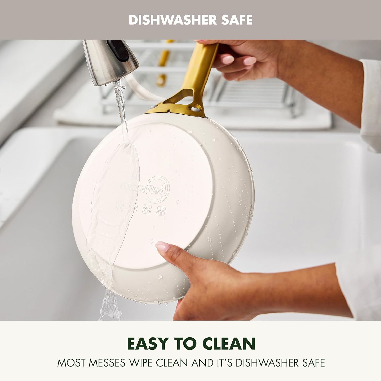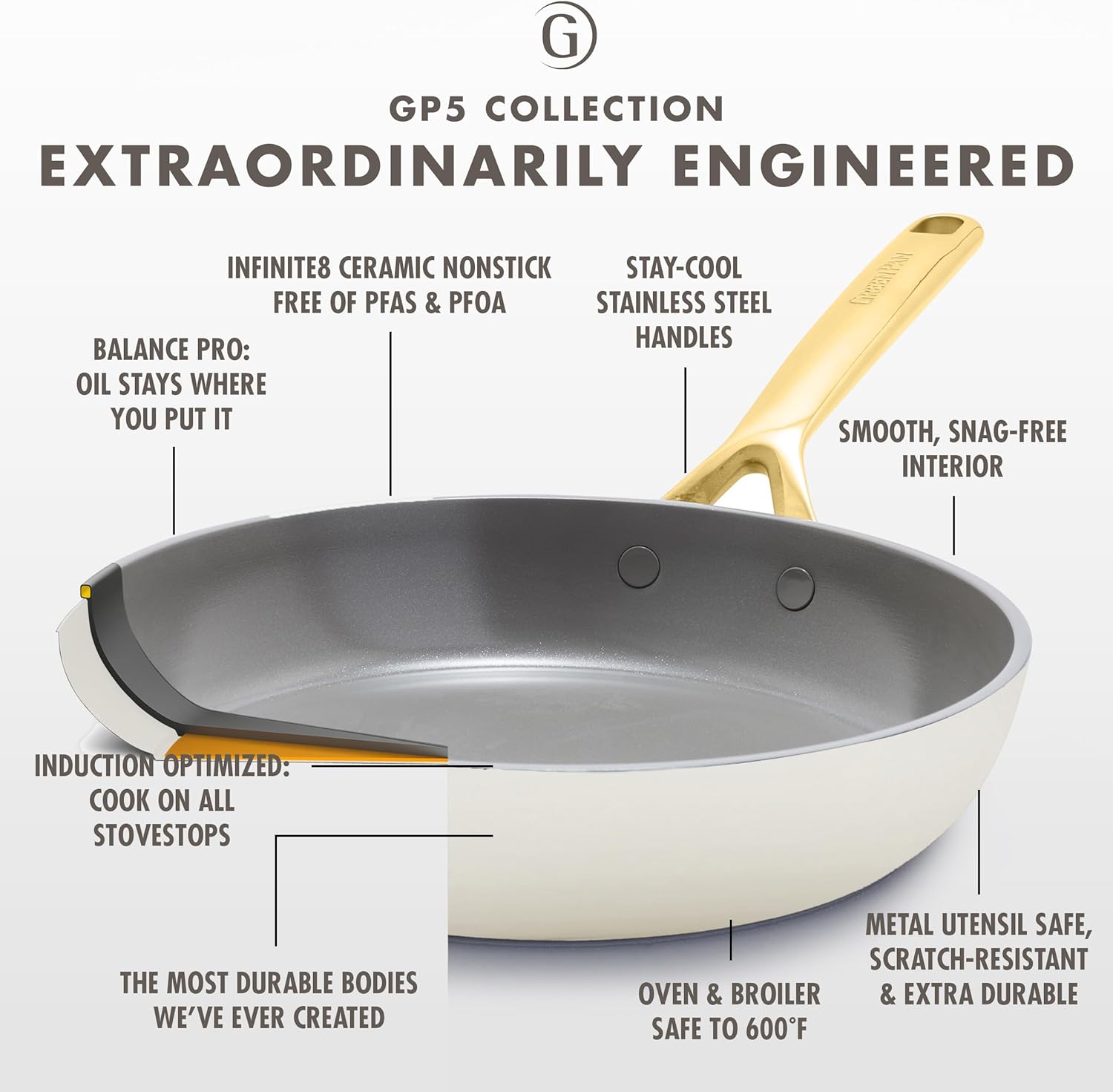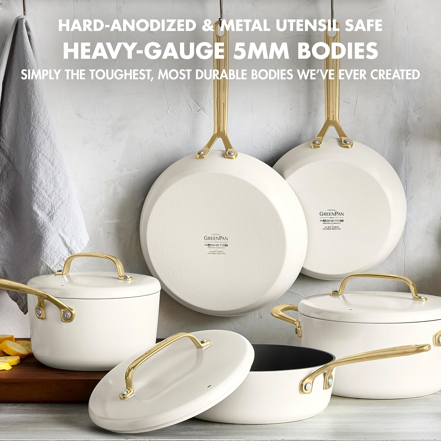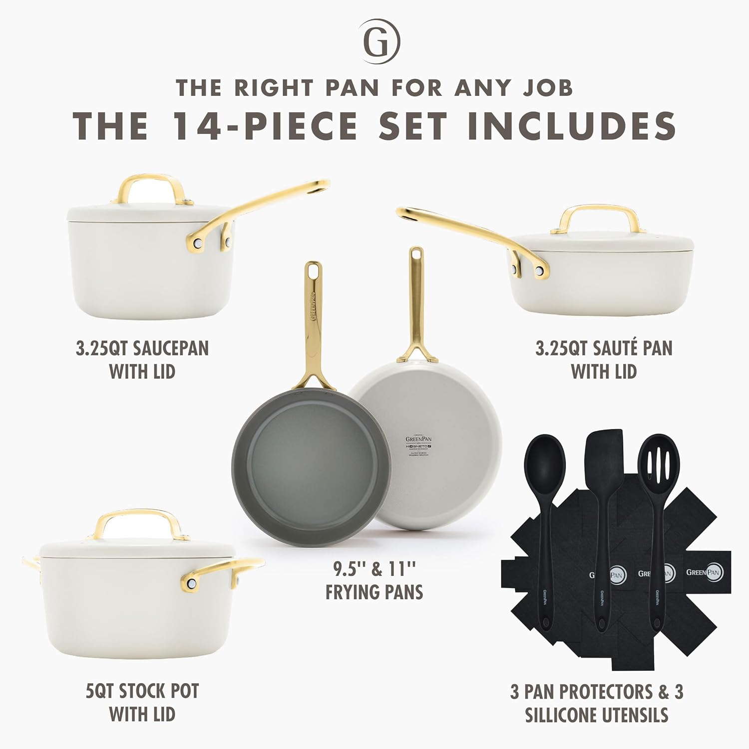 GreenPan GP5 14 Piece Cookware Pots and Pans Set, Hard Anodized Healthy Ceramic Nonstick PFAS-Free, Champagne Handles, Heavy Gauge, Stay-Flat Surface, Induction, Dishwasher and Oven Safe, Cream
