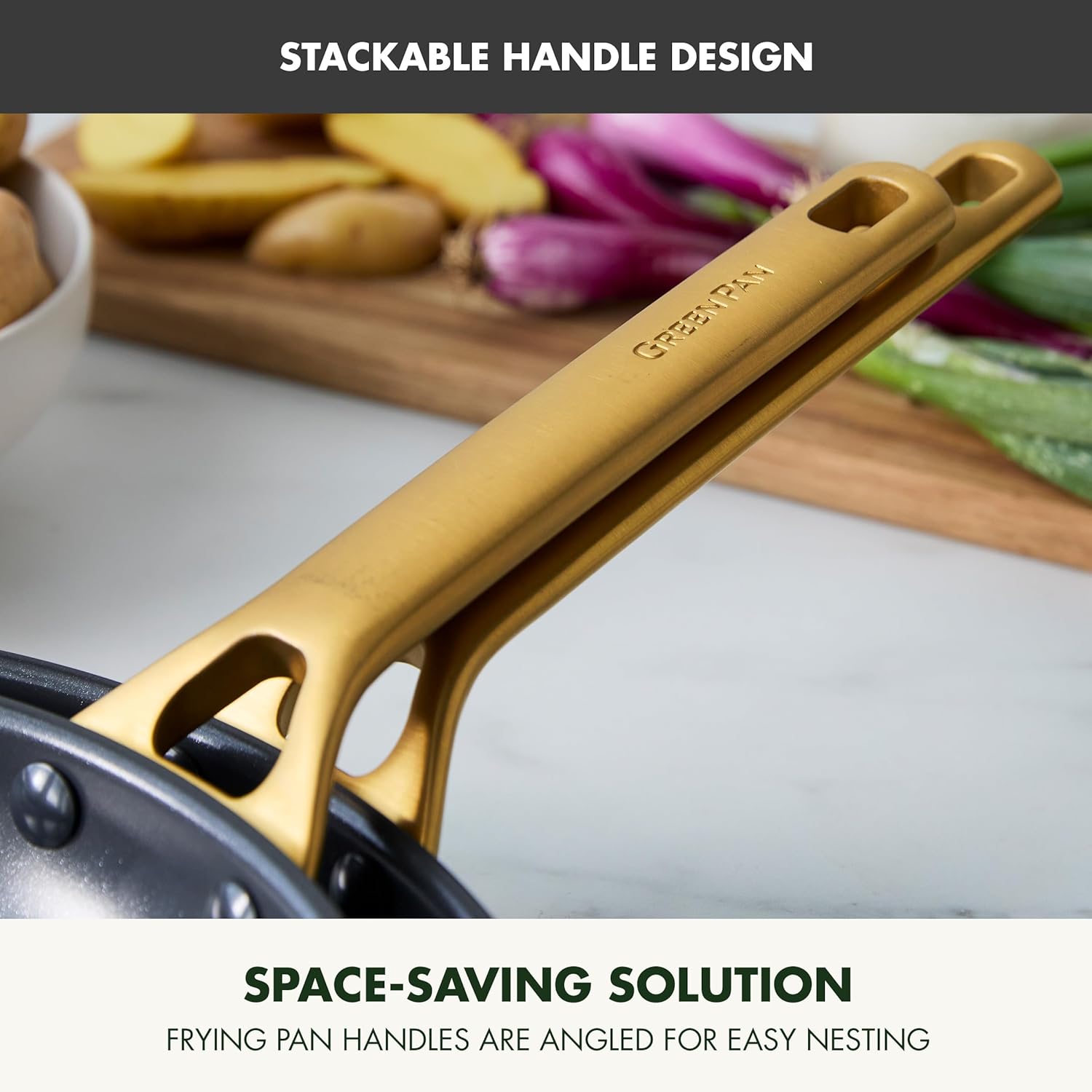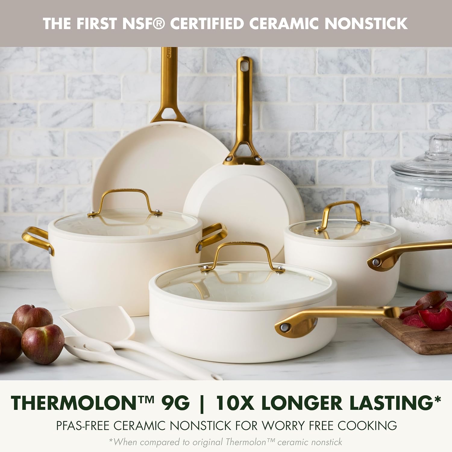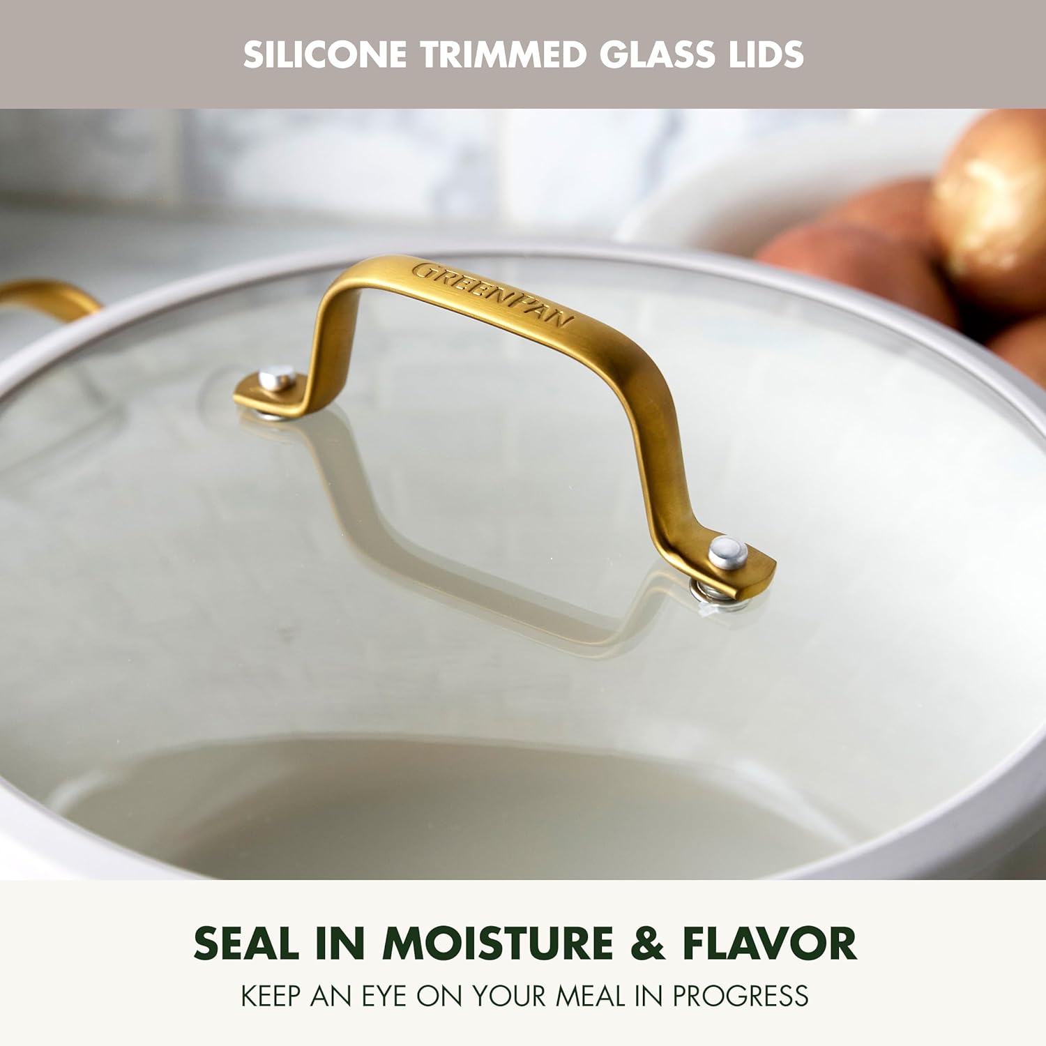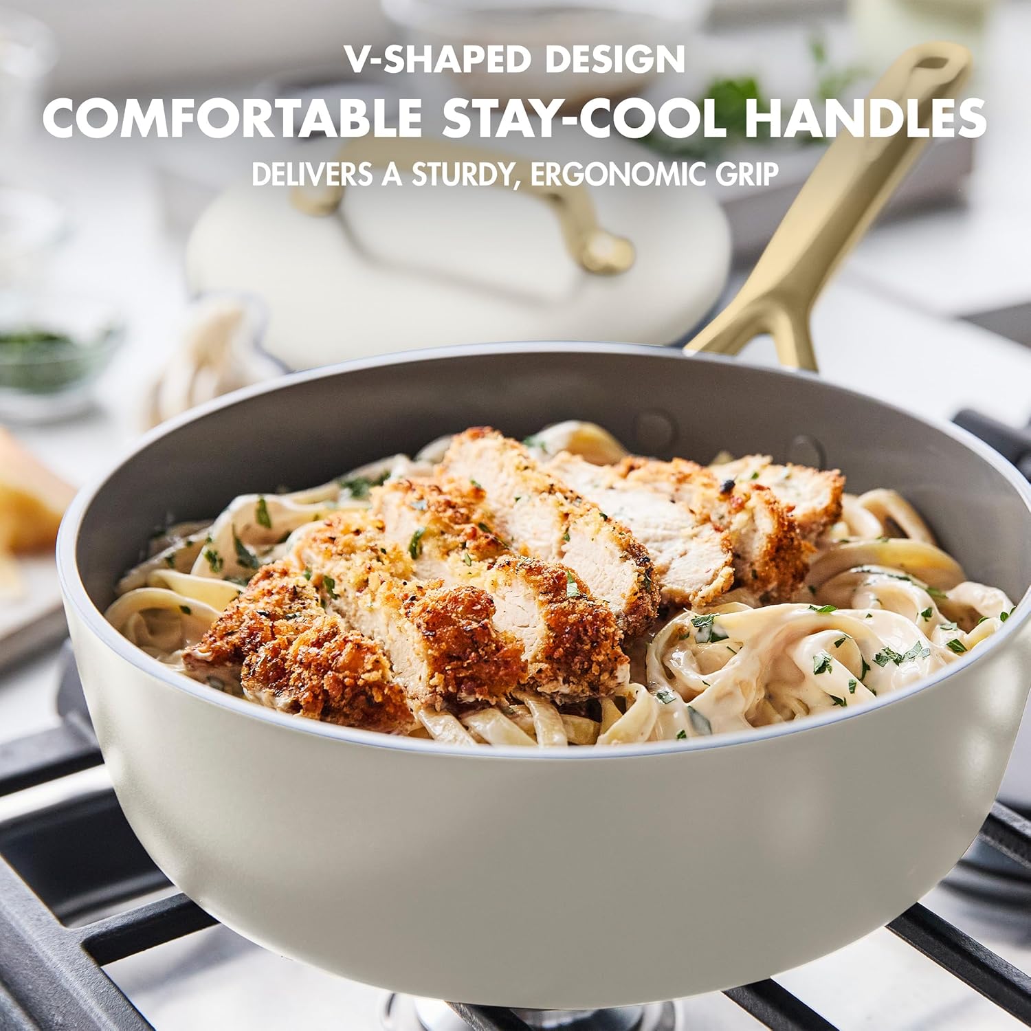 GreenPan GP5 14 Piece Cookware Pots and Pans Set, Hard Anodized Healthy Ceramic Nonstick PFAS-Free, Champagne Handles, Heavy Gauge, Stay-Flat Surface, Induction, Dishwasher and Oven Safe, Cream